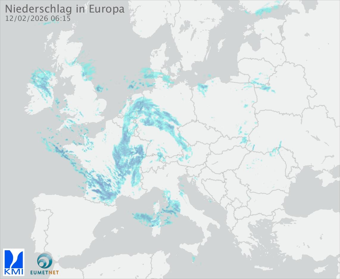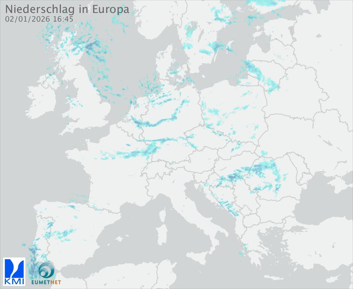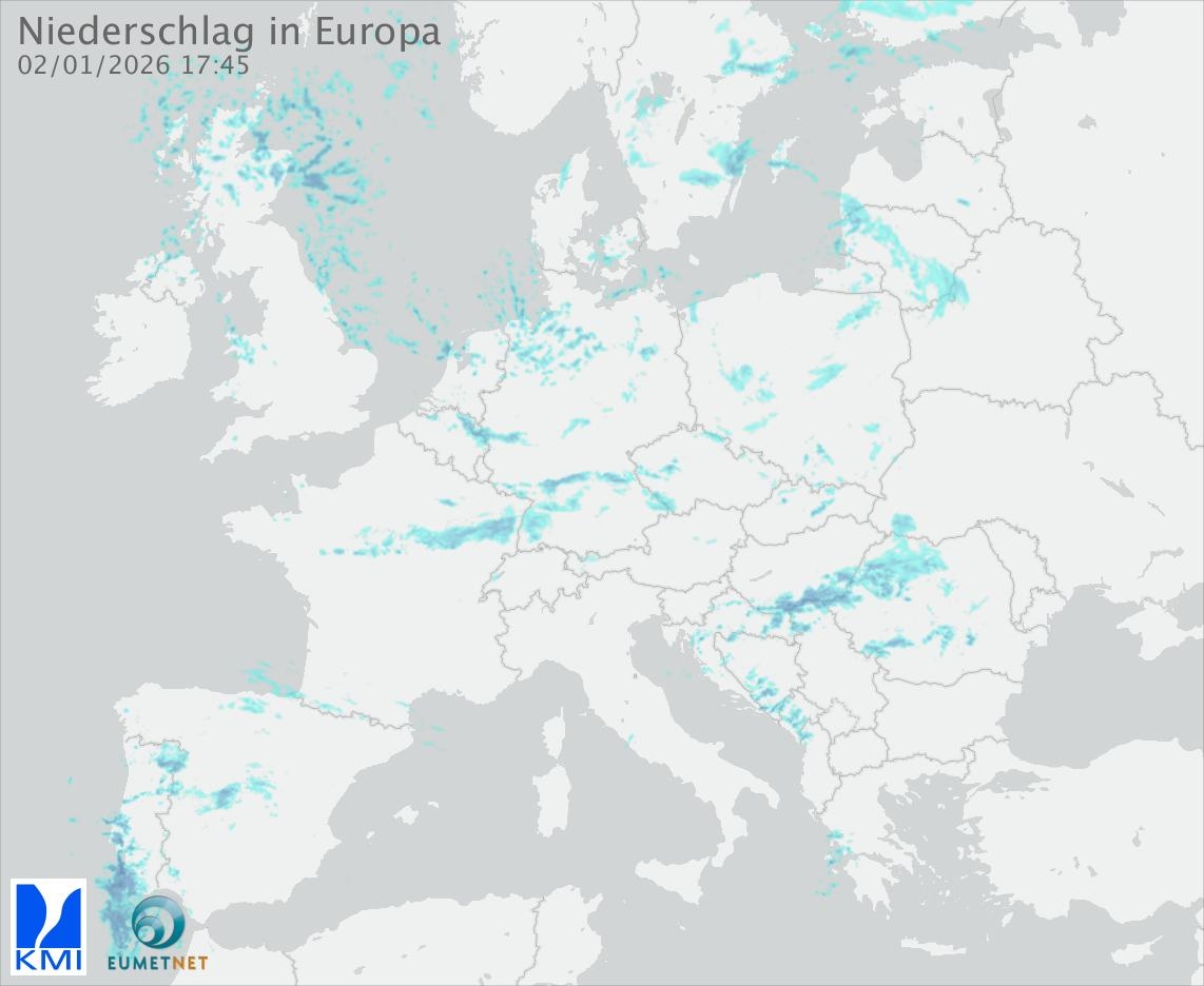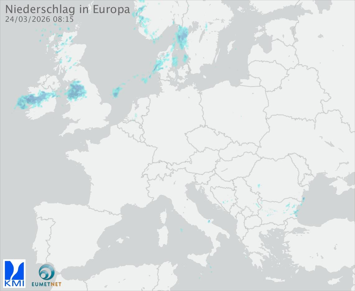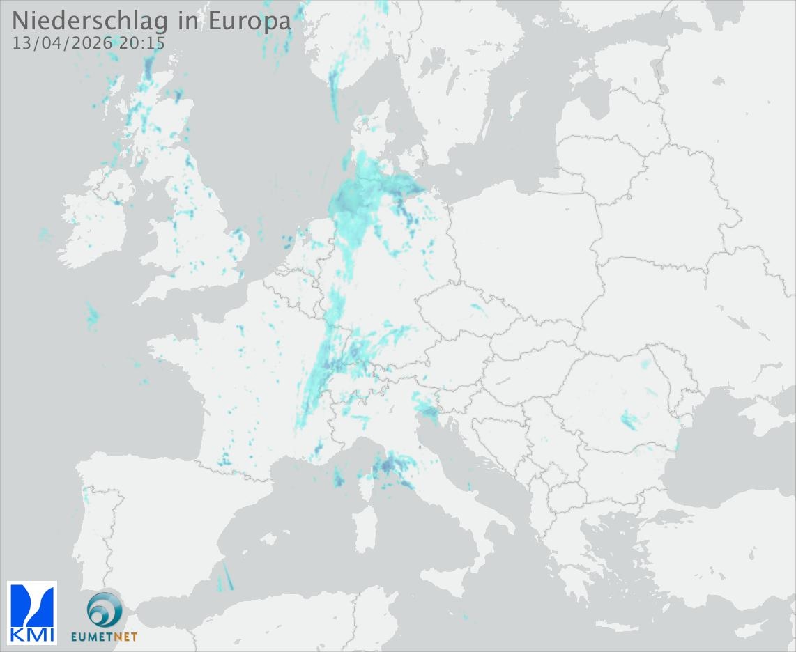 Diese Animation zeigt den gefallenen Niederschlag, gemessen durch die Regenradargeräte der europäischen Teilnehmer des Eumetnet-Programms OPERA (in 15-Minuten-Intervallen).