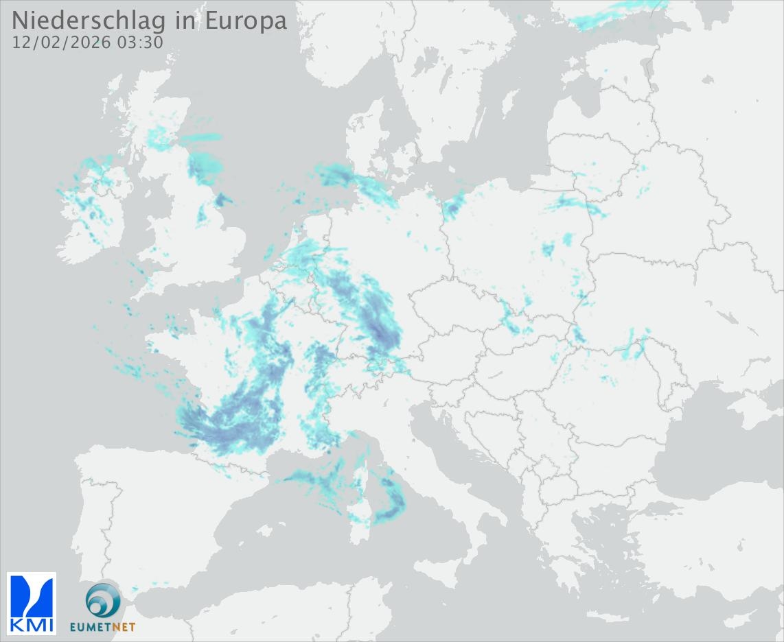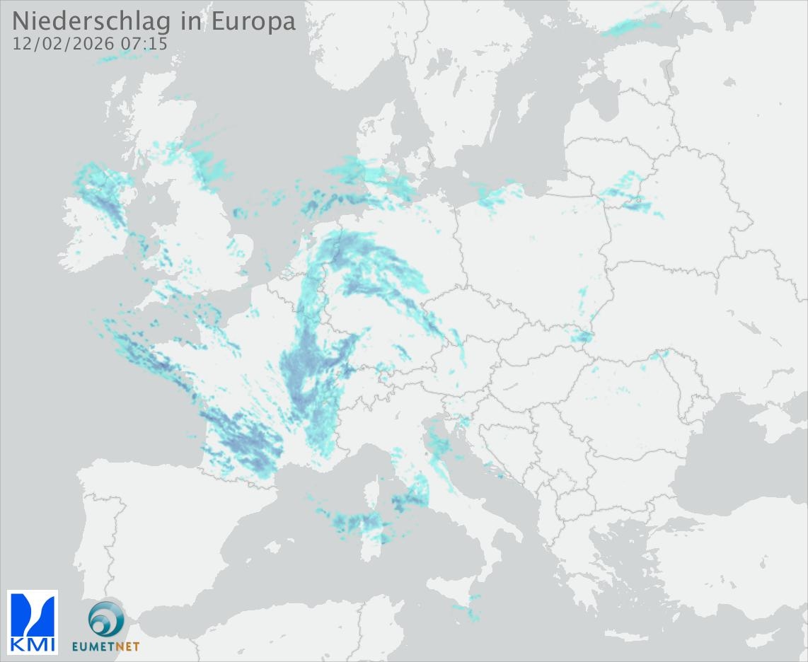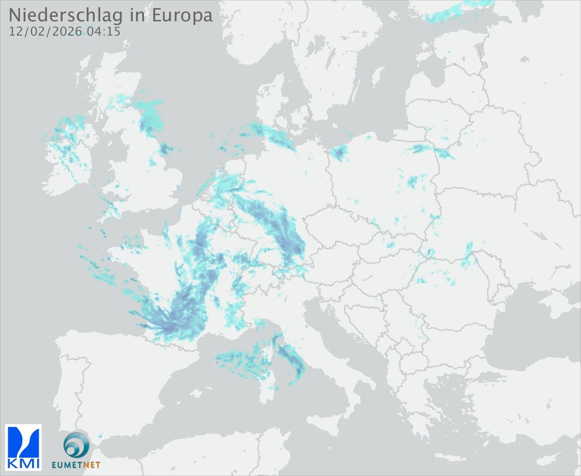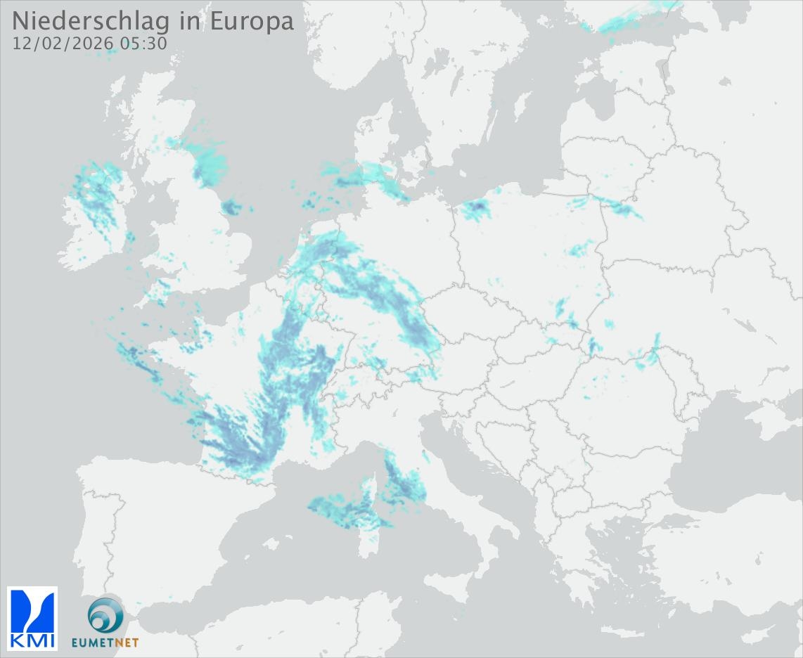 Diese Animation zeigt den gefallenen Niederschlag, gemessen durch die Regenradargeräte der europäischen Teilnehmer des Eumetnet-Programms OPERA (in 15-Minuten-Intervallen).