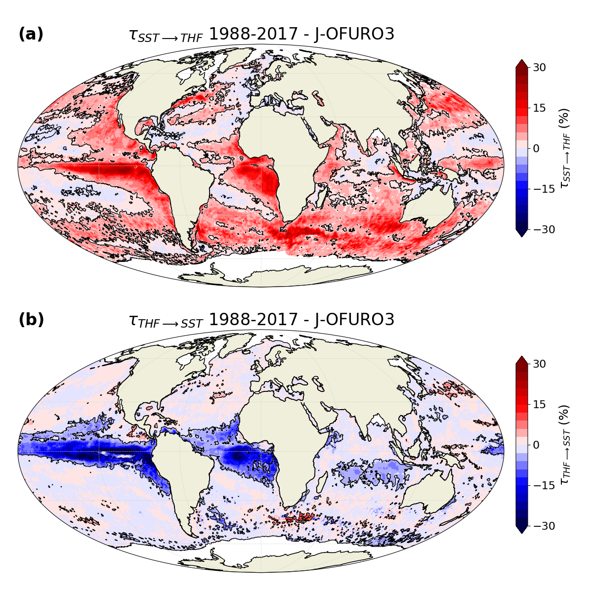 Rate of information transfer from sea-surface temperature (SST) to turbulent heat flux (THF) (top panel) and from THF to SST (bottom panel) using J-OFURO3 satellite observations over the period 1988-2017 (Fig. 4 of Docquier et al. [2023, https://doi.org/10.5194/esd-14-577-2023])