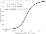 Example of magnetic grain size determination of superparamagnetic nanoparticles of a ferrofluid (cf explanantion below). The induced magnetisation curve (dots) of coated dry magnetite nanoparticles is fitted with the Langevin function (red line) taking into account grain size distribution and the paramagnetic coating of the nanoparticles. The nominal particle size provided by the manufacturer is 10 nm. The parameters d, σ, and χpara denote the mean particle diameter of the distribution, the distribution width and the paramagnetic susceptibility of the coating, respectively.