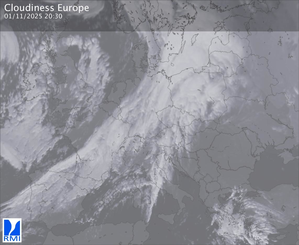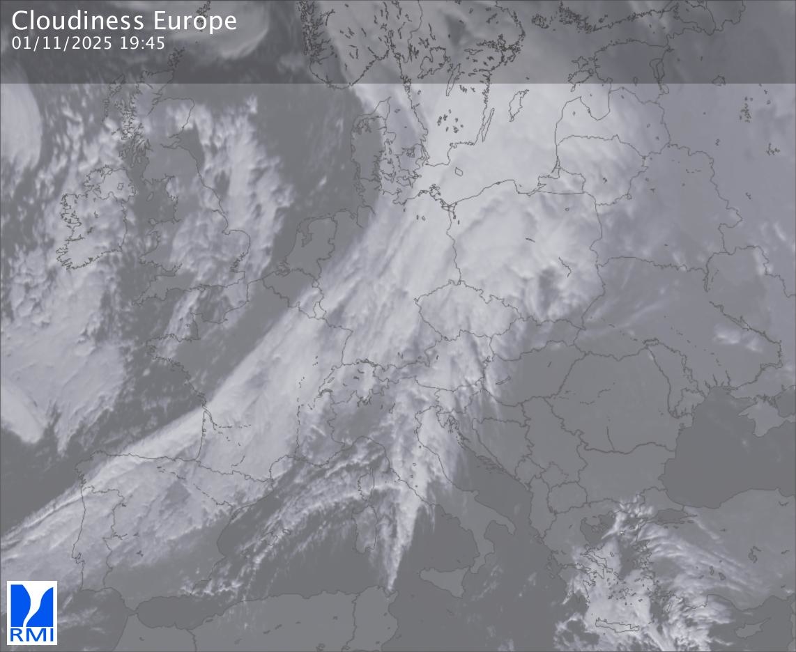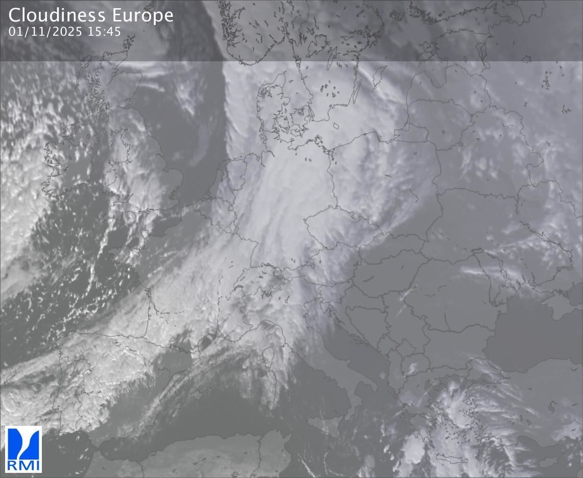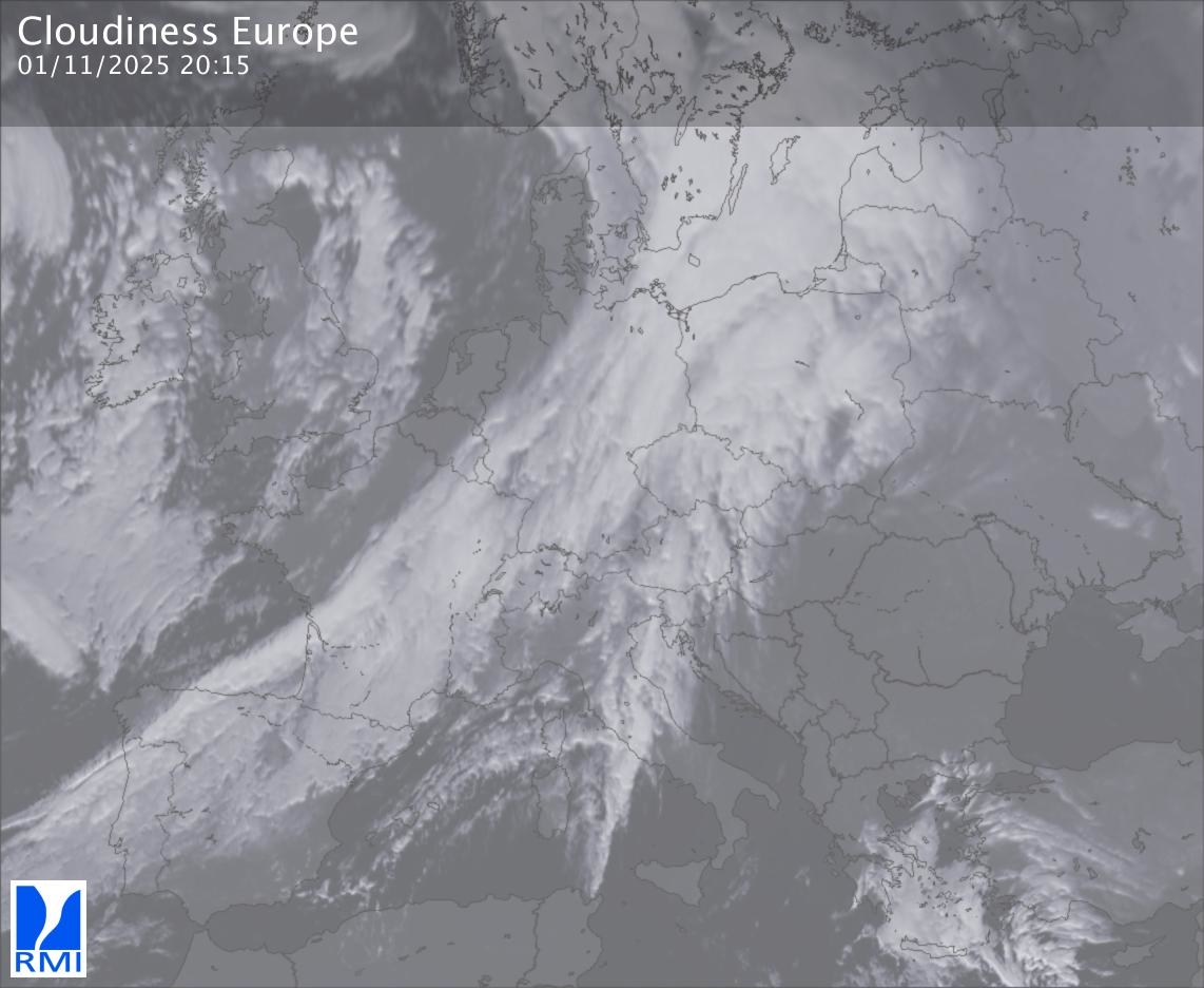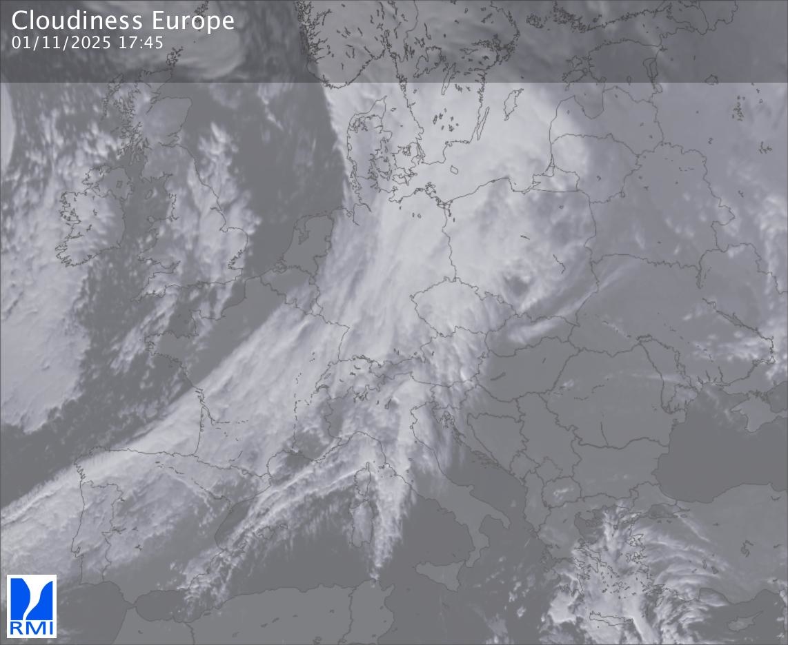 The satellite image of Europe is composed by using both the infrared and the visible light channel from the satellite. Because there are no usable visible light images during the night this composition of channels gives us an image that can be used to observe the clouds by day and by night. The pixelated artifacts are due to the lower resolution of the infrared channel.