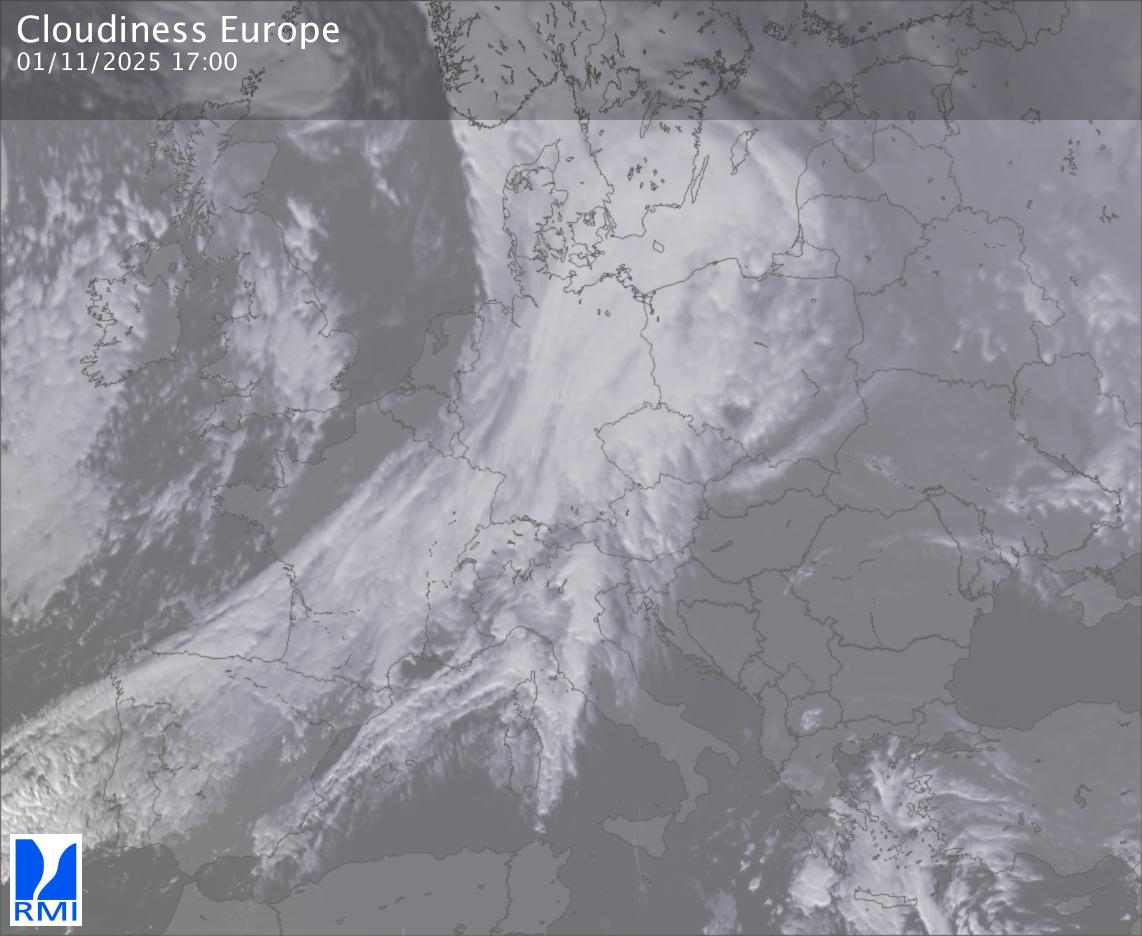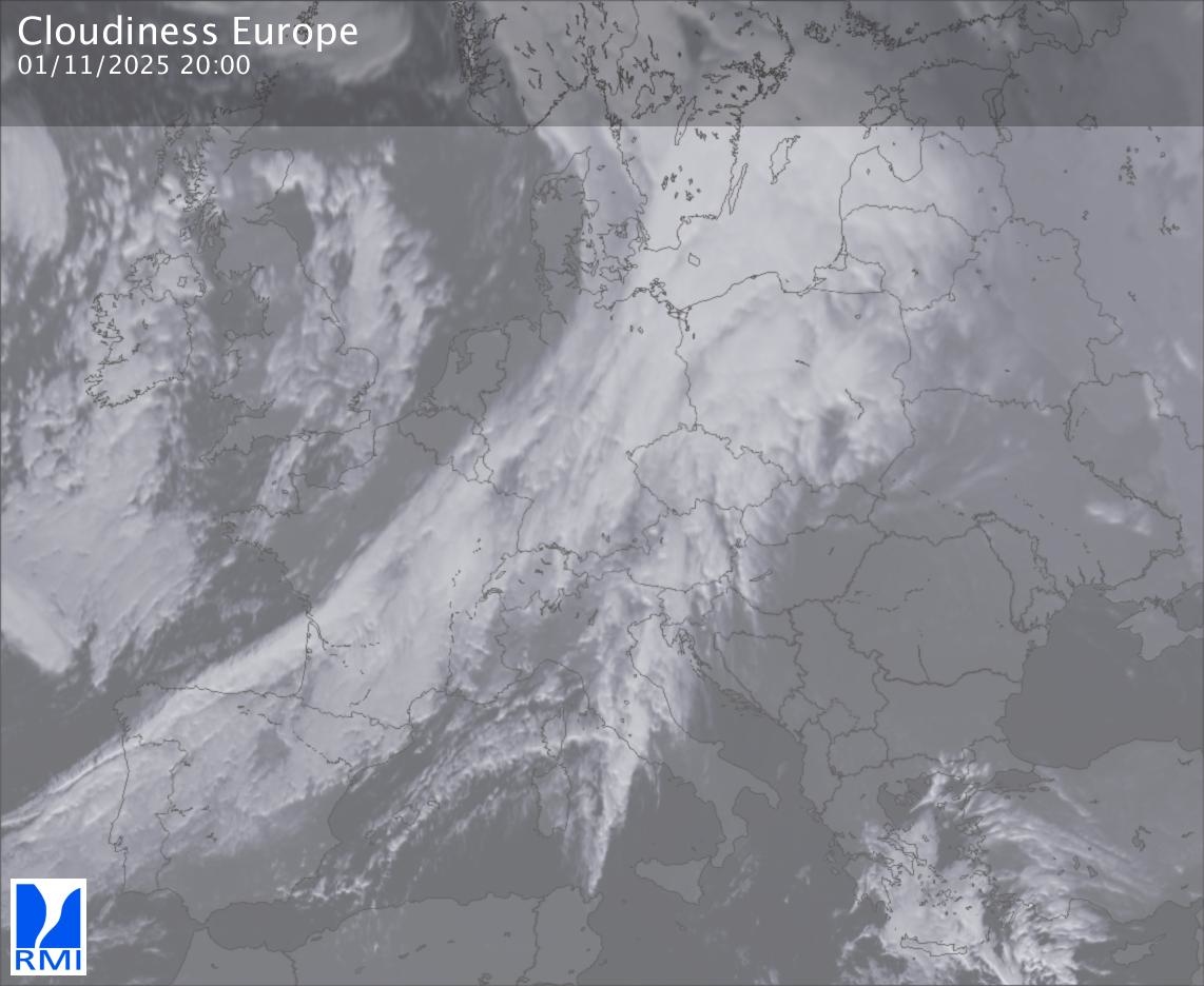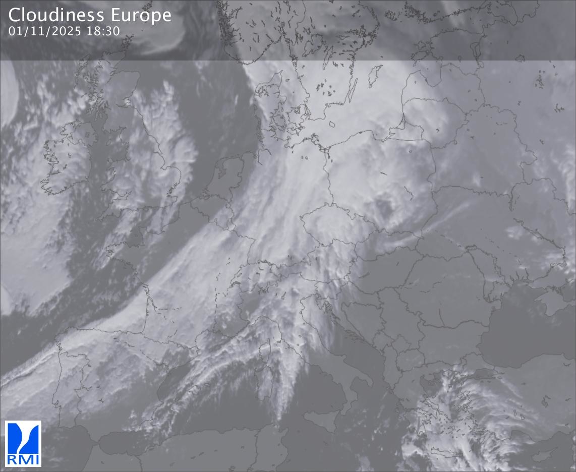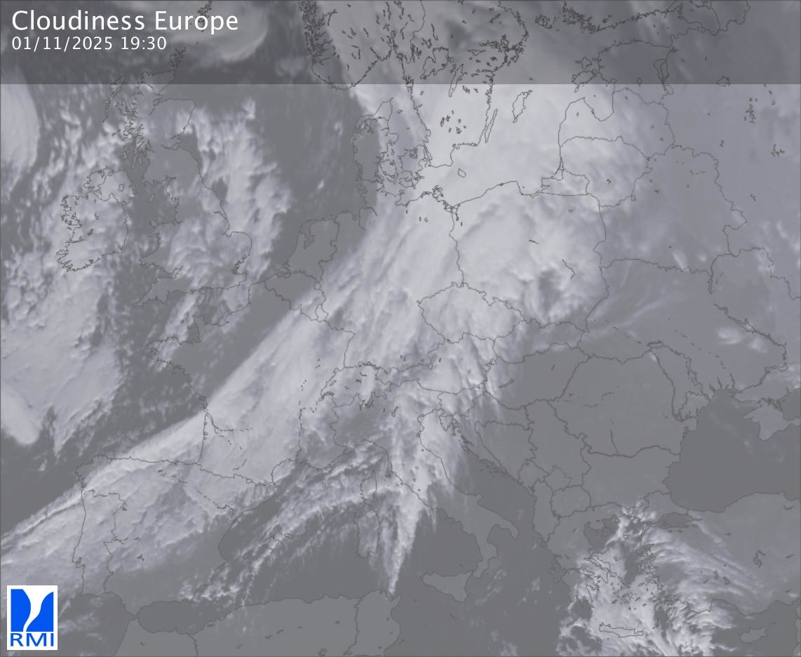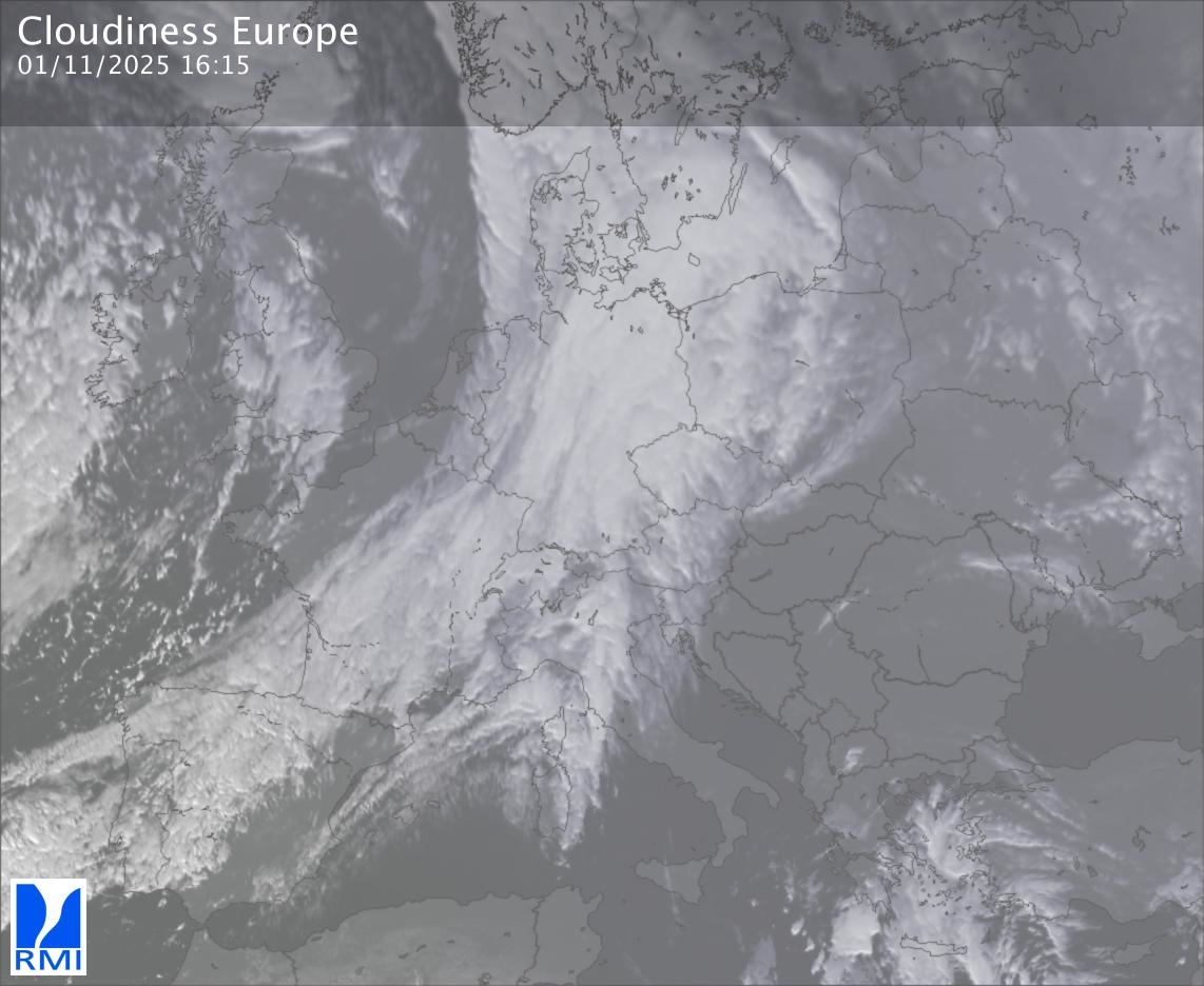 The satellite image of Europe is composed by using both the infrared and the visible light channel from the satellite. Because there are no usable visible light images during the night this composition of channels gives us an image that can be used to observe the clouds by day and by night. The pixelated artifacts are due to the lower resolution of the infrared channel.