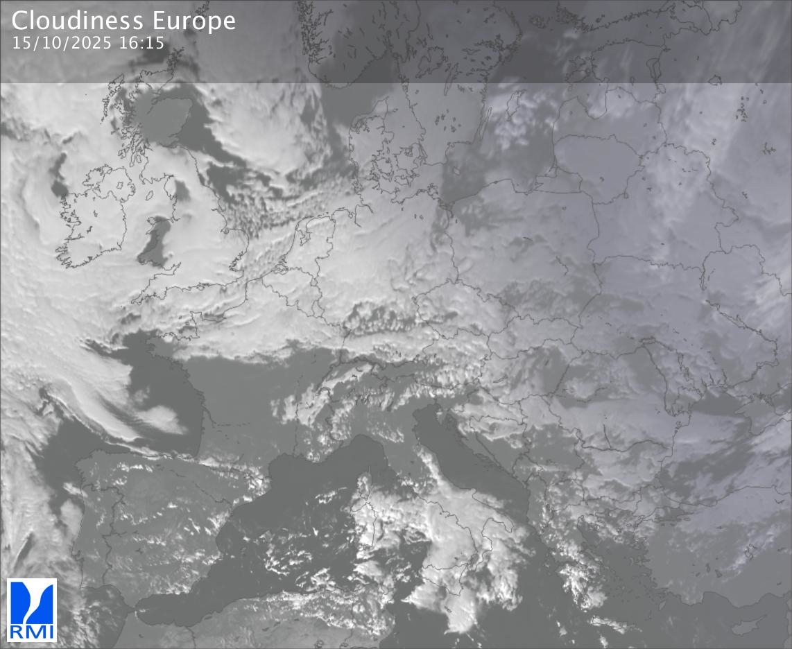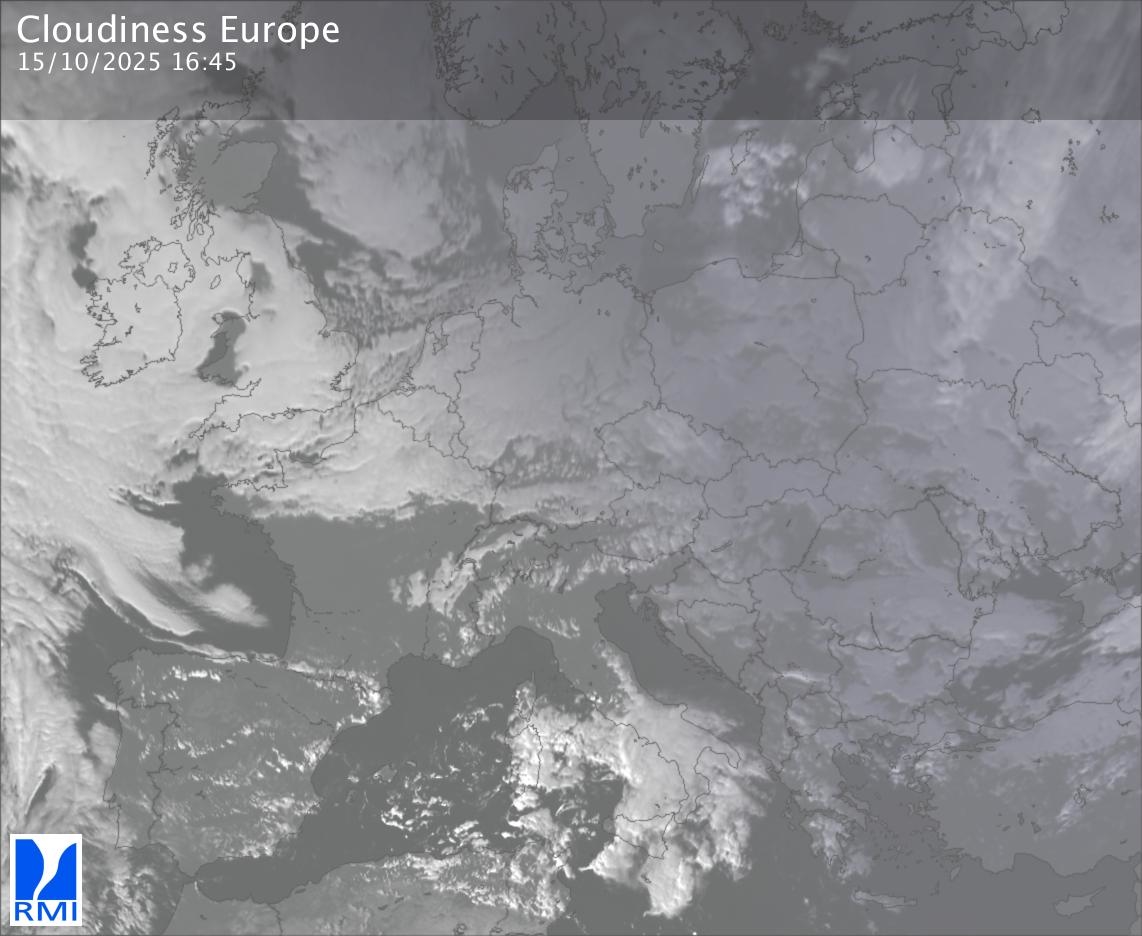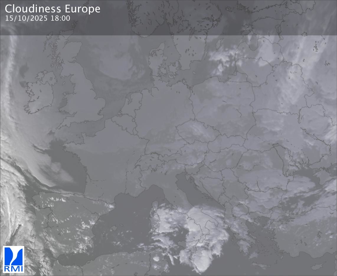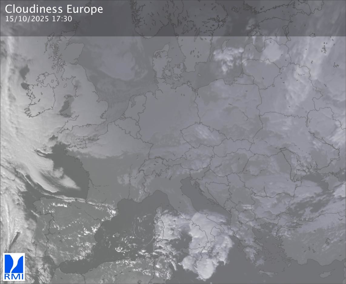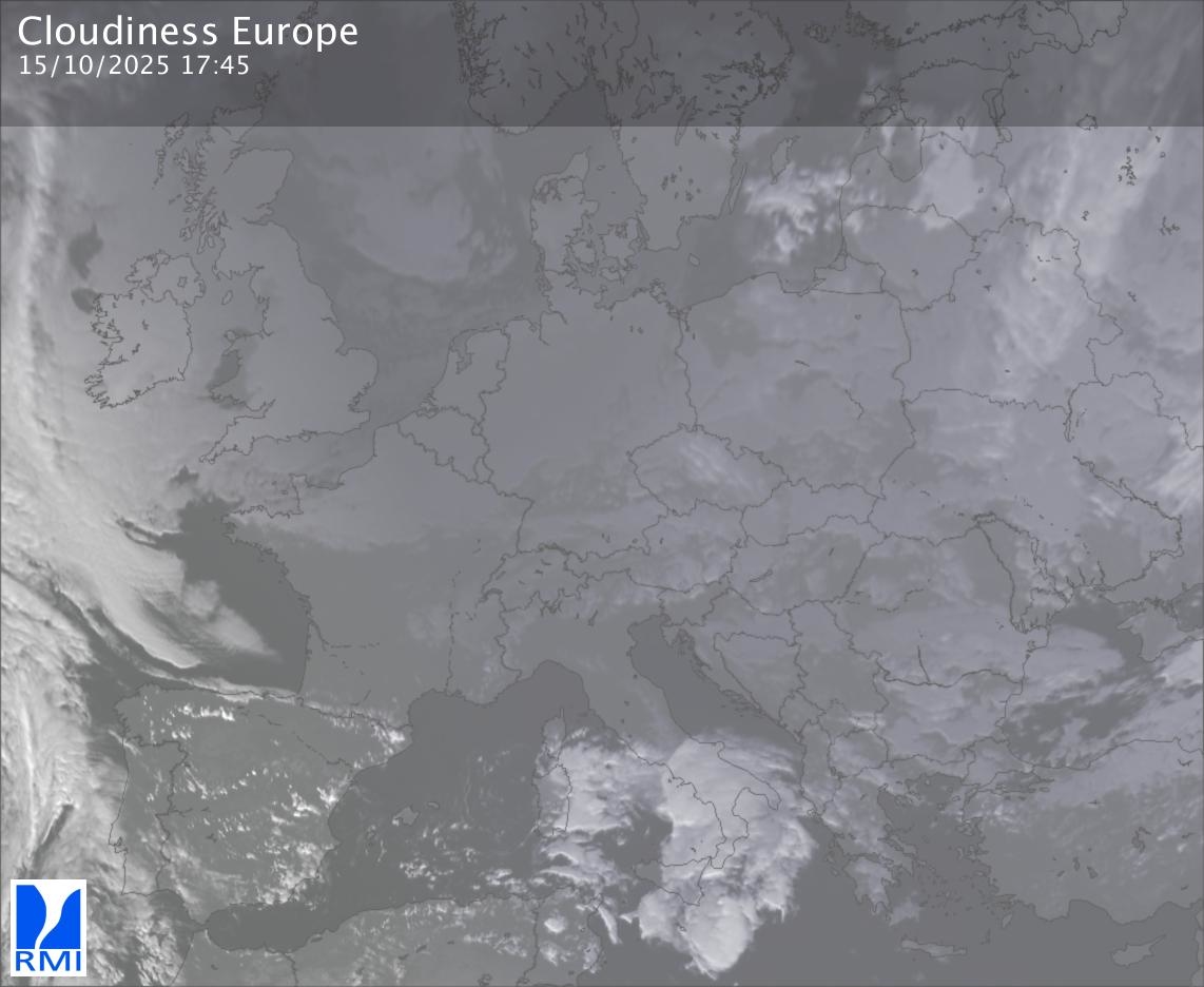 The satellite image of Europe is composed by using both the infrared and the visible light channel from the satellite. Because there are no usable visible light images during the night this composition of channels gives us an image that can be used to observe the clouds by day and by night. The pixelated artifacts are due to the lower resolution of the infrared channel.