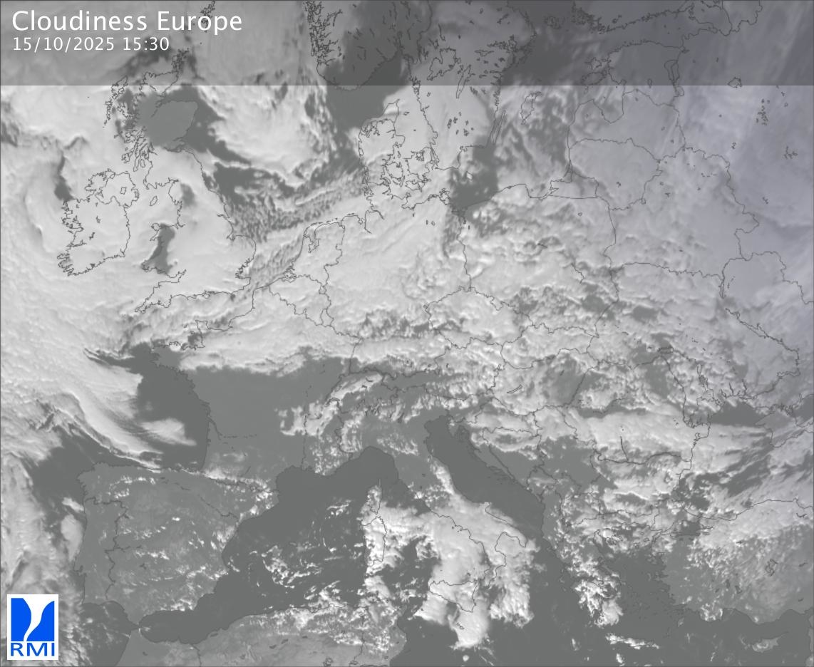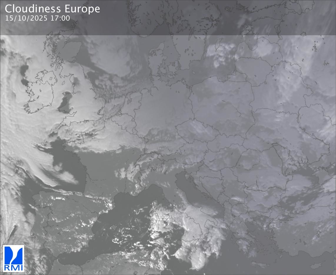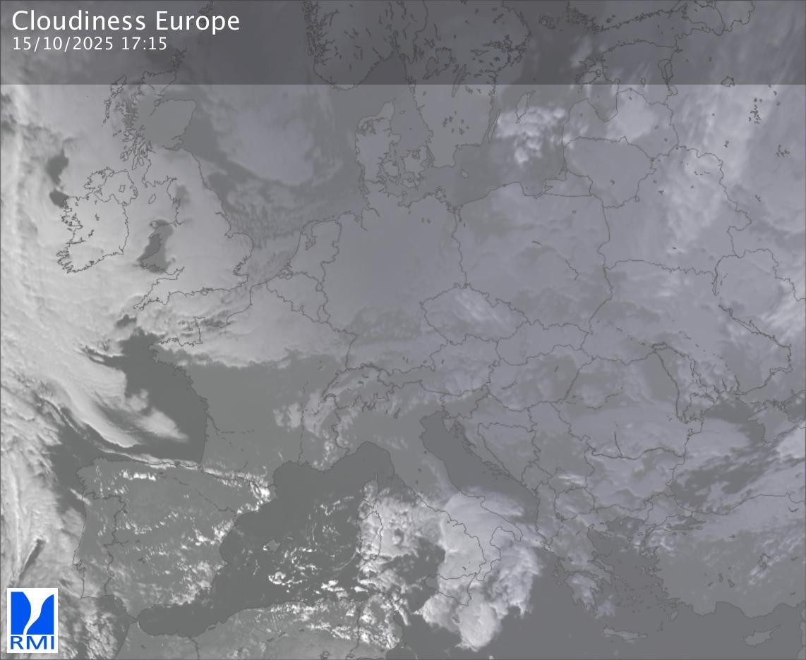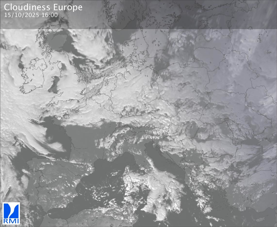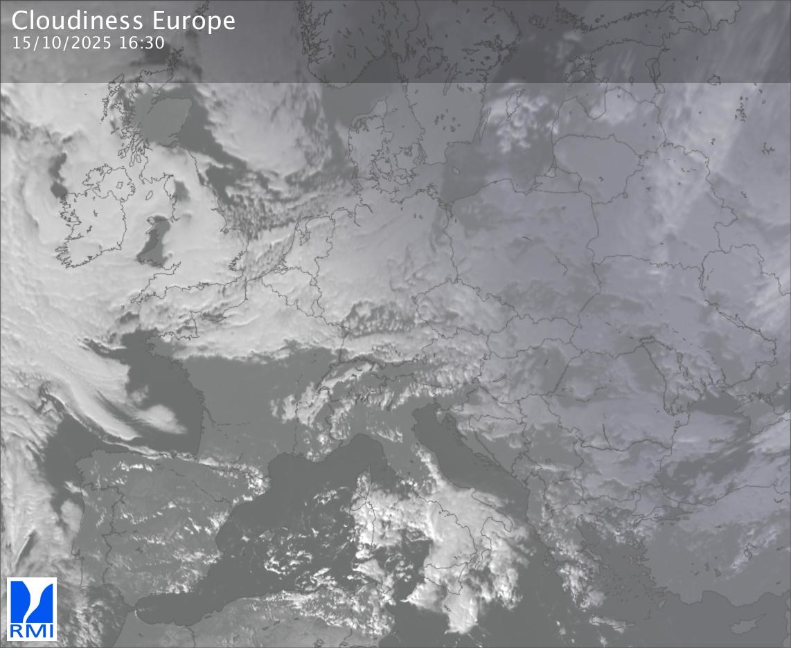 The satellite image of Europe is composed by using both the infrared and the visible light channel from the satellite. Because there are no usable visible light images during the night this composition of channels gives us an image that can be used to observe the clouds by day and by night. The pixelated artifacts are due to the lower resolution of the infrared channel.