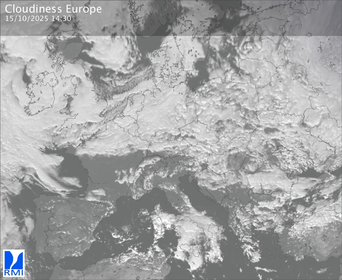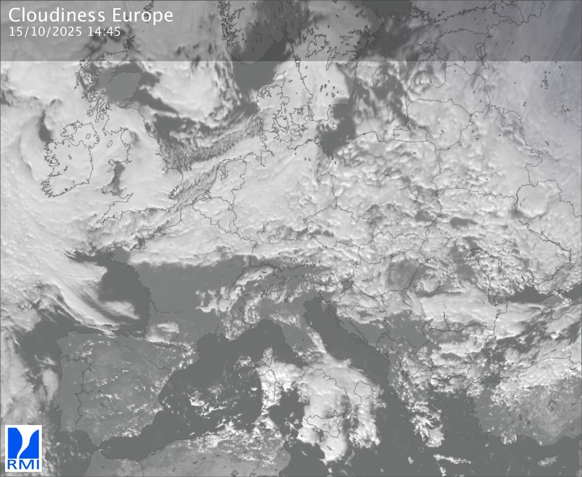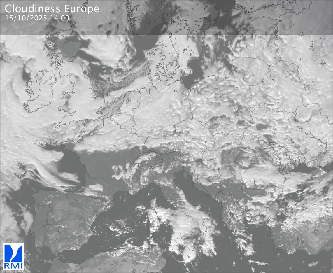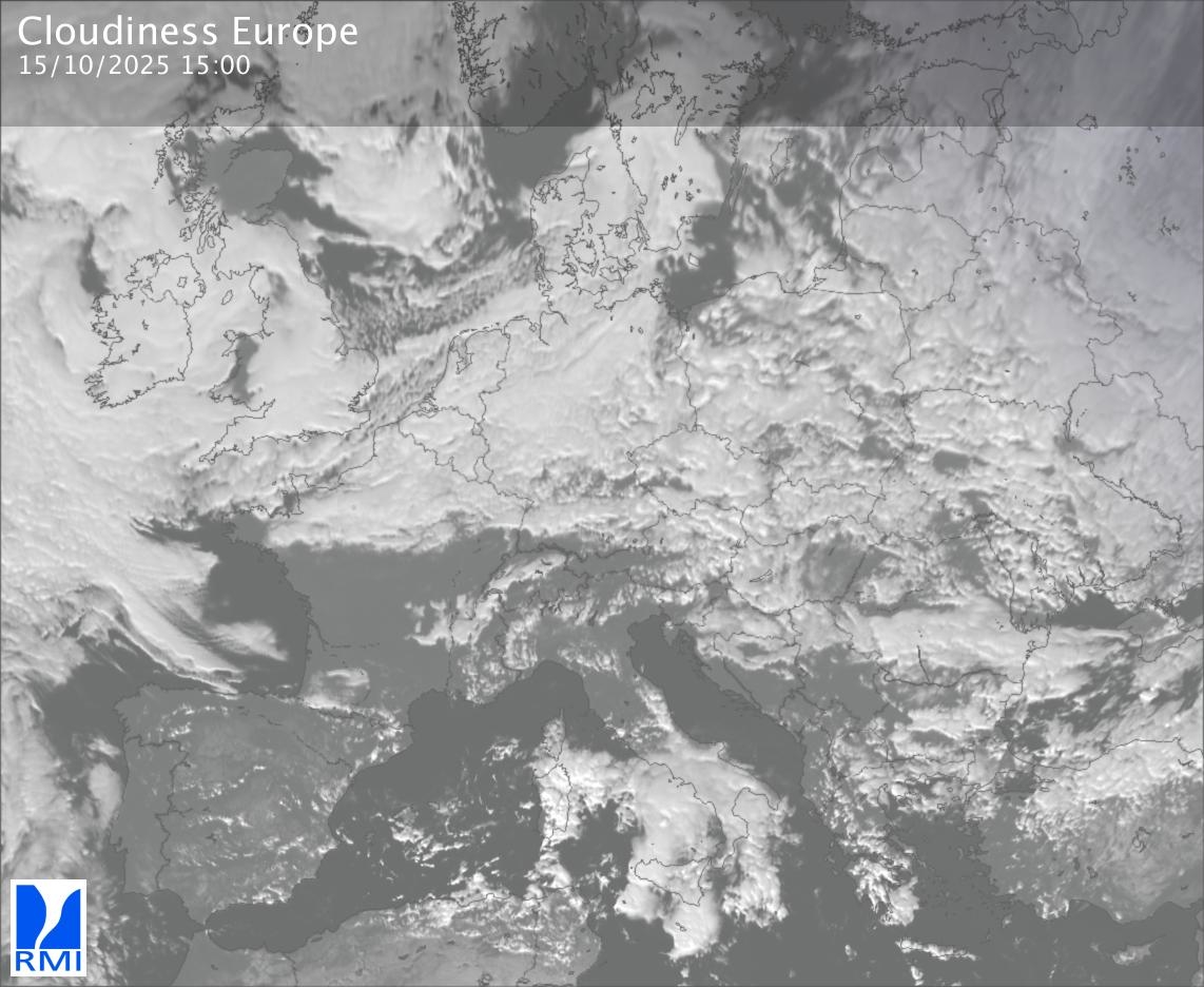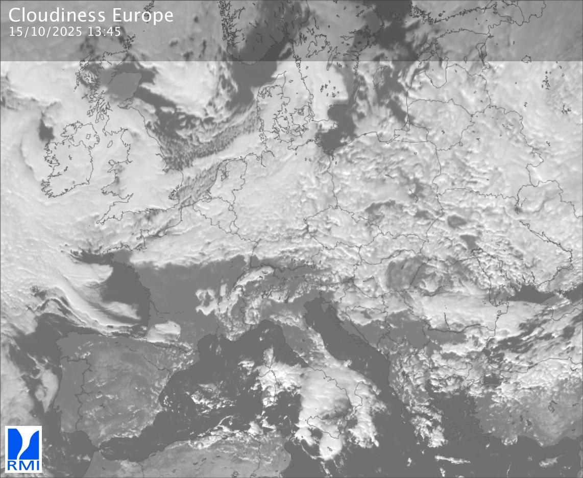 The satellite image of Europe is composed by using both the infrared and the visible light channel from the satellite. Because there are no usable visible light images during the night this composition of channels gives us an image that can be used to observe the clouds by day and by night. The pixelated artifacts are due to the lower resolution of the infrared channel.