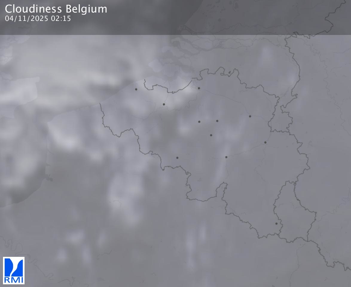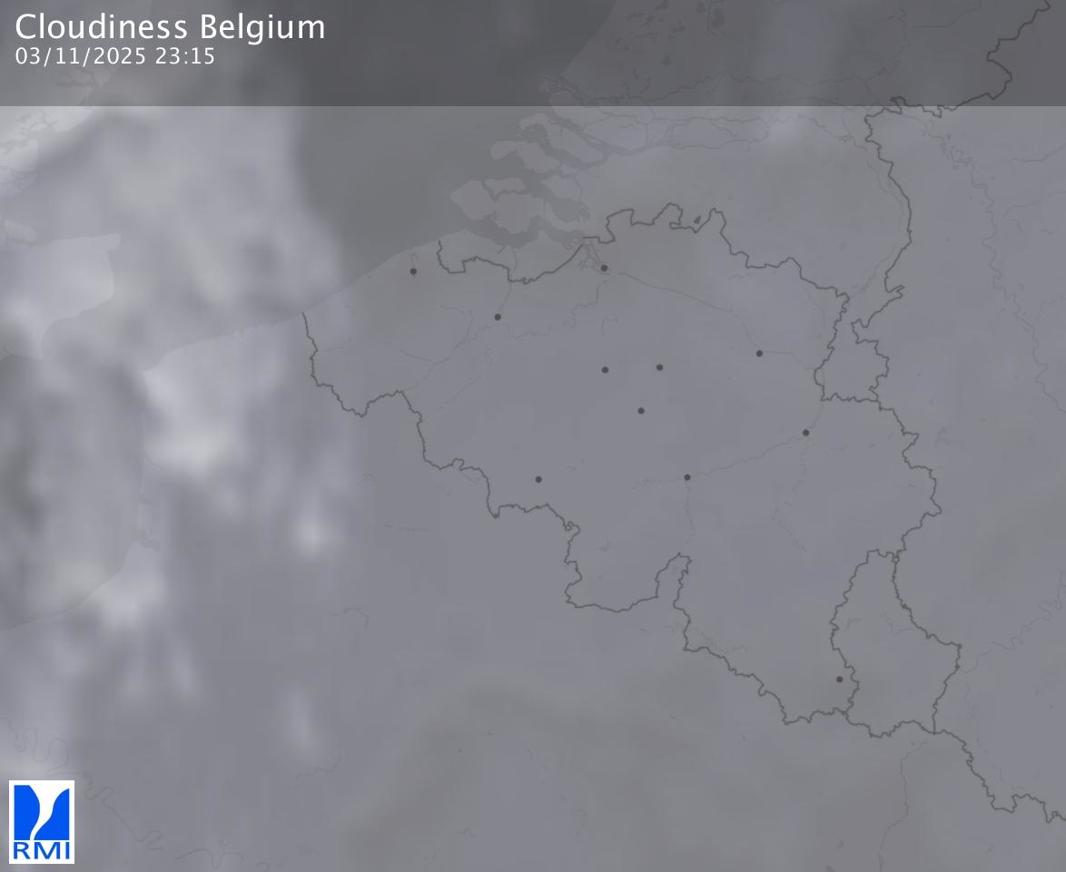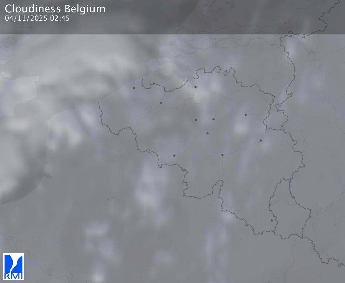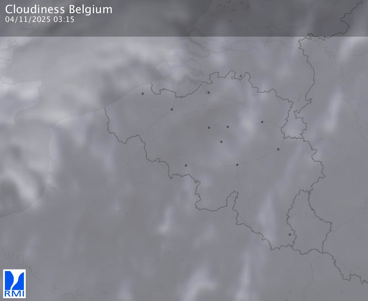 The satellite image of Belgium is composed by using both the infrared and the visible light channel from the satellite. Because there are no visible light images during the night this composition of channels gives us an image that can be used to observe the clouds by day and by night. The pixelated artifacts are due to the lower resolution of the infrared channel.