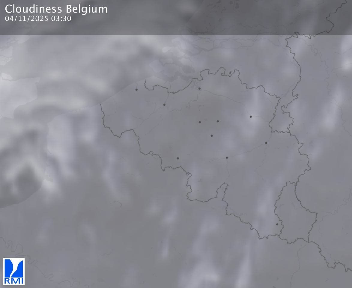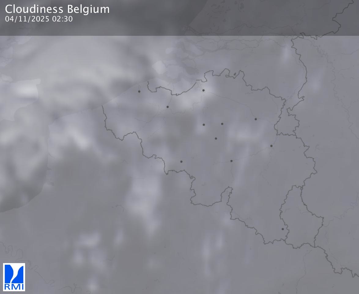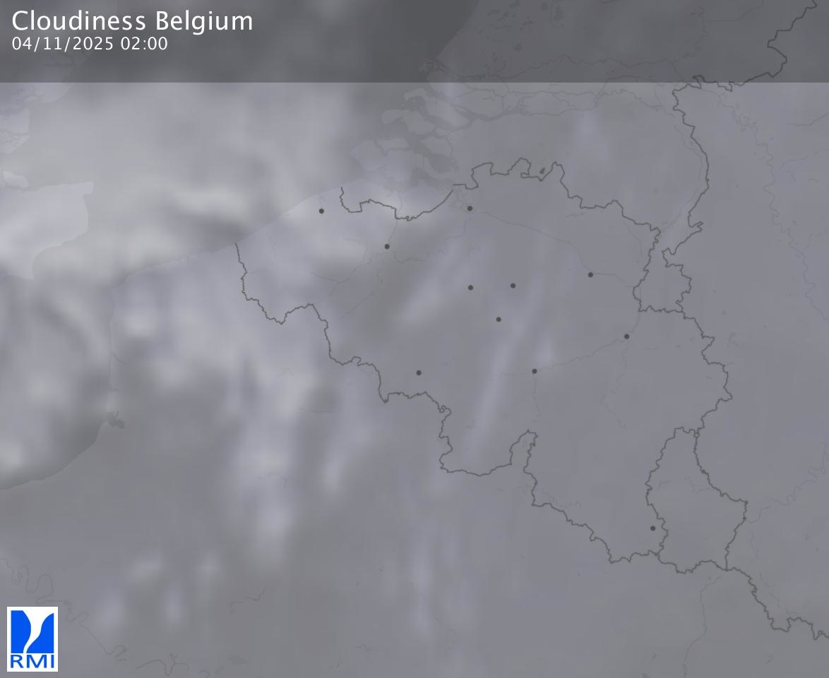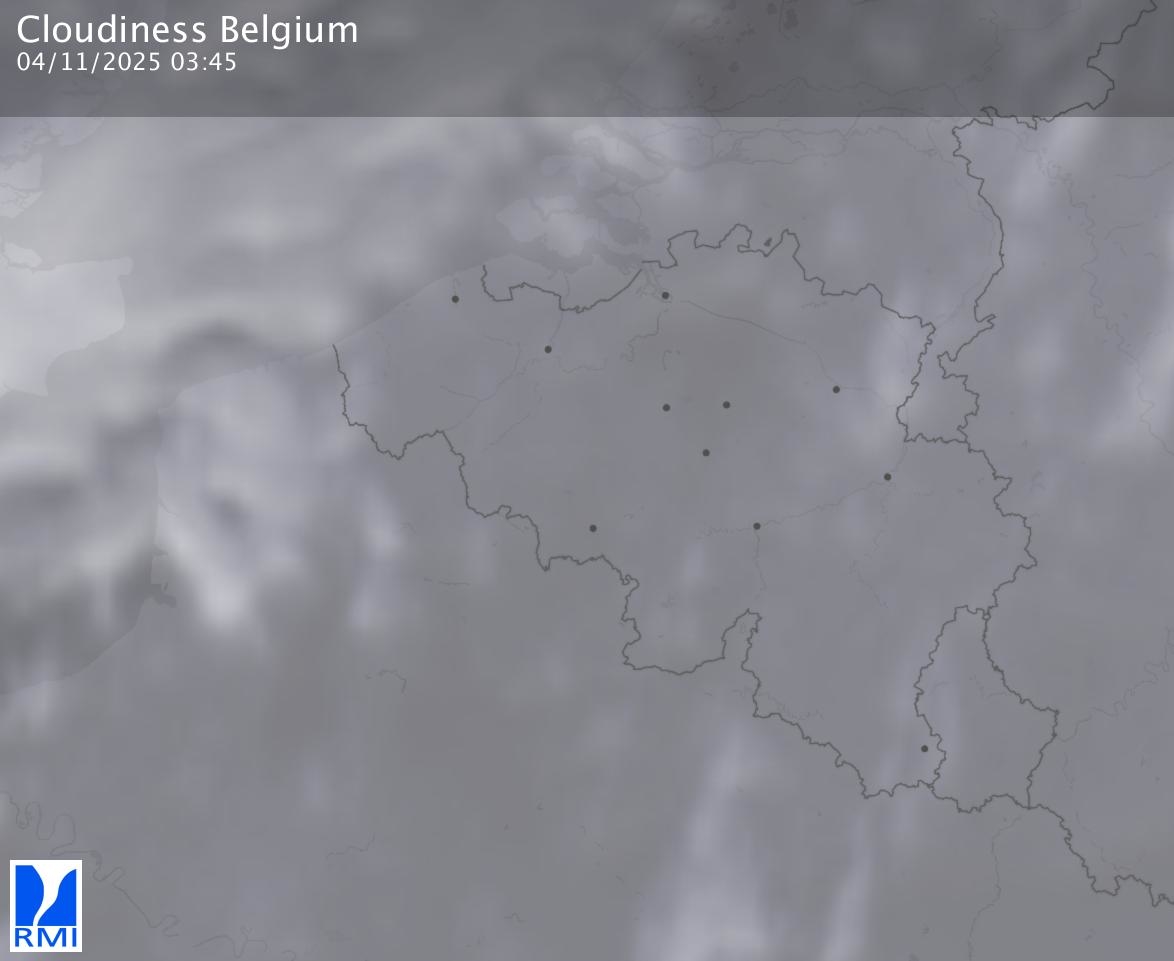 The satellite image of Belgium is composed by using both the infrared and the visible light channel from the satellite. Because there are no visible light images during the night this composition of channels gives us an image that can be used to observe the clouds by day and by night. The pixelated artifacts are due to the lower resolution of the infrared channel.