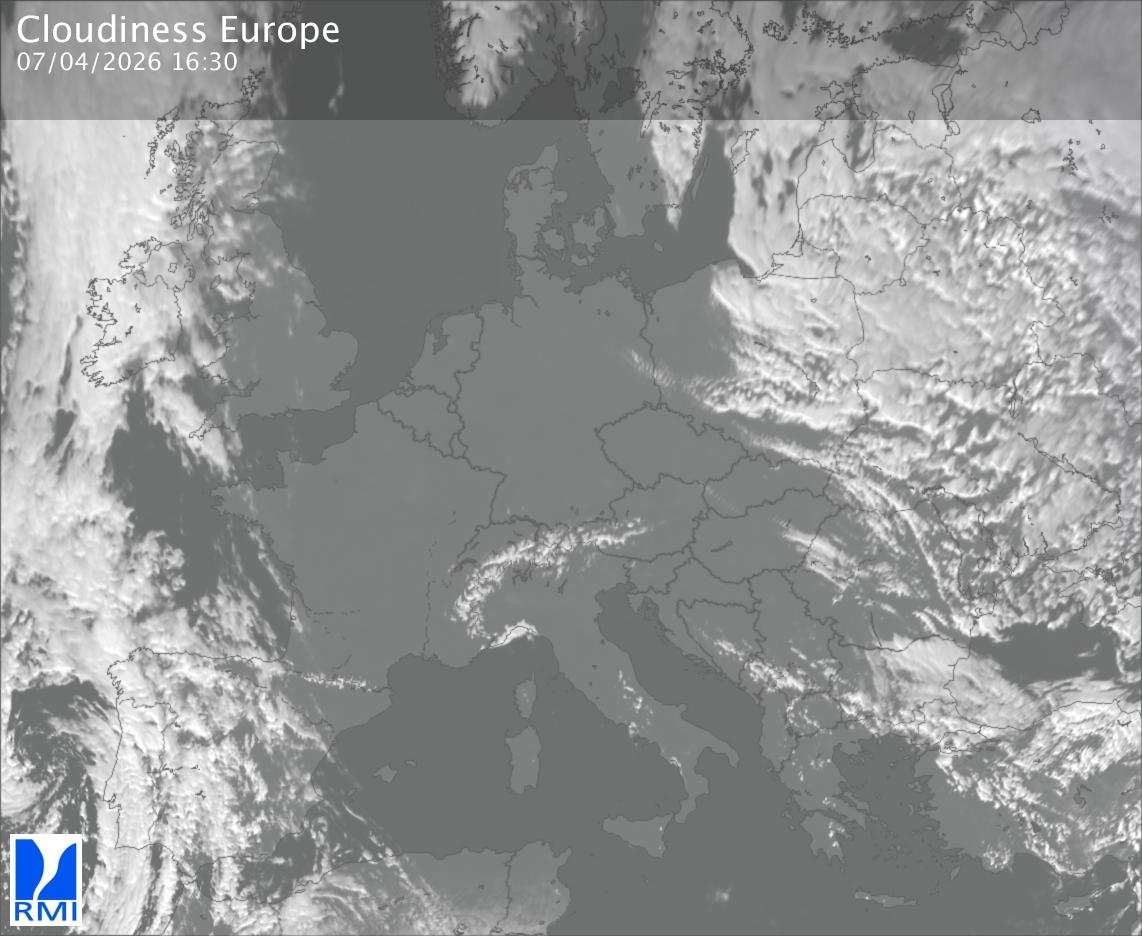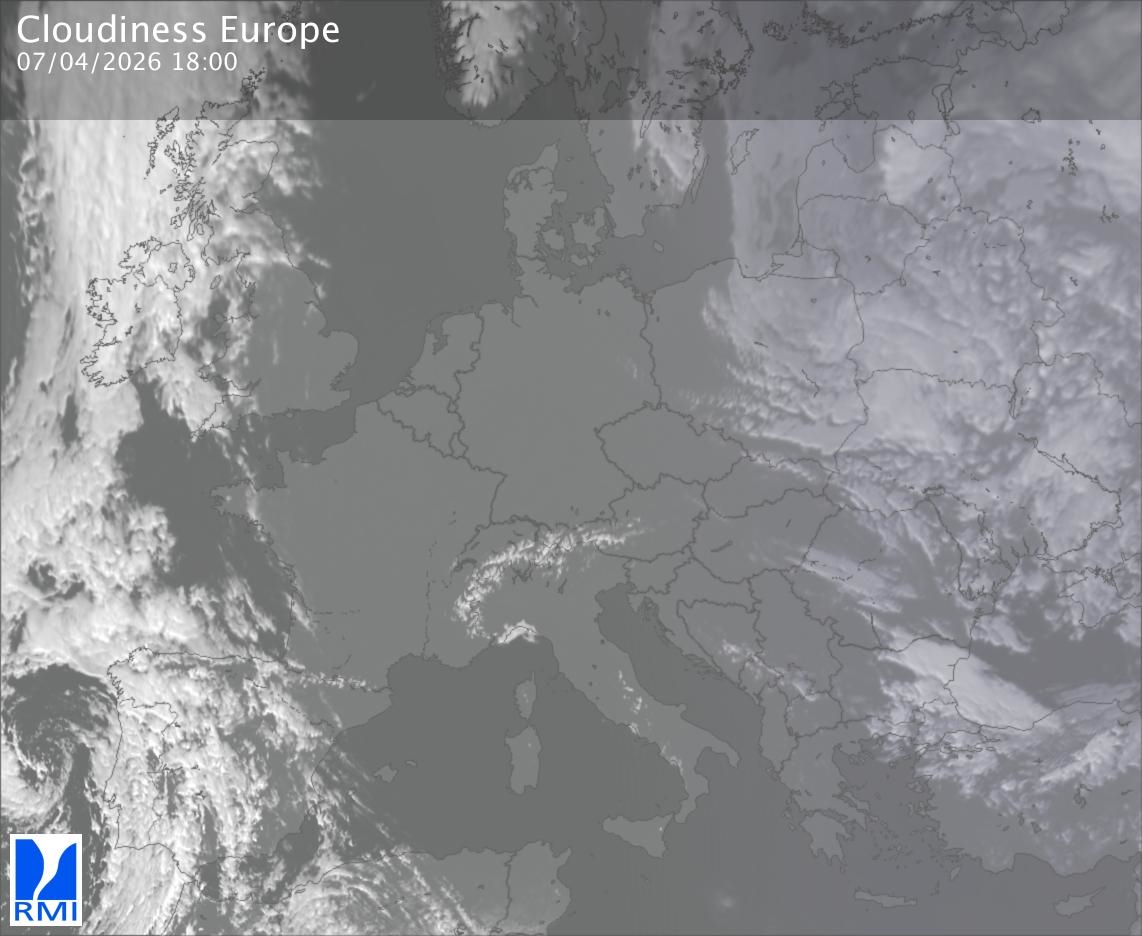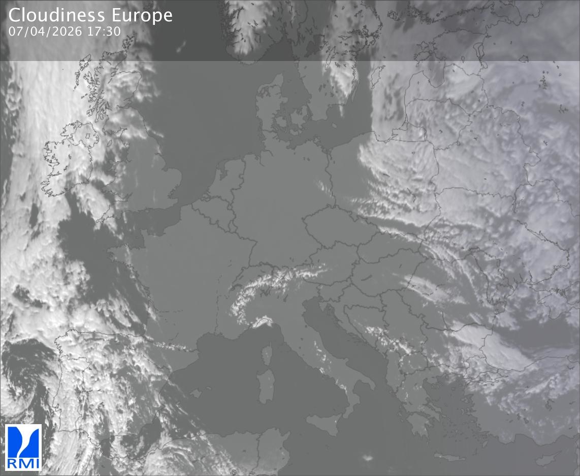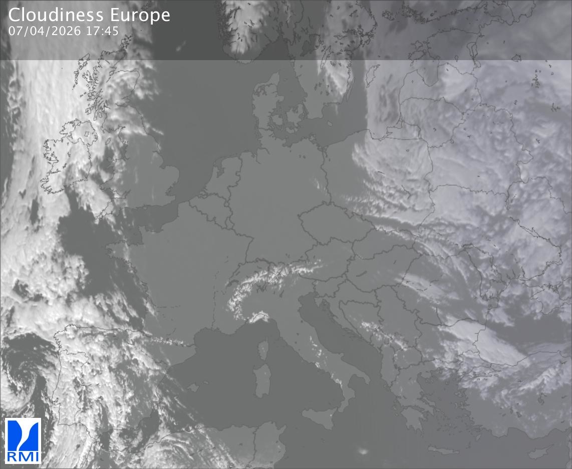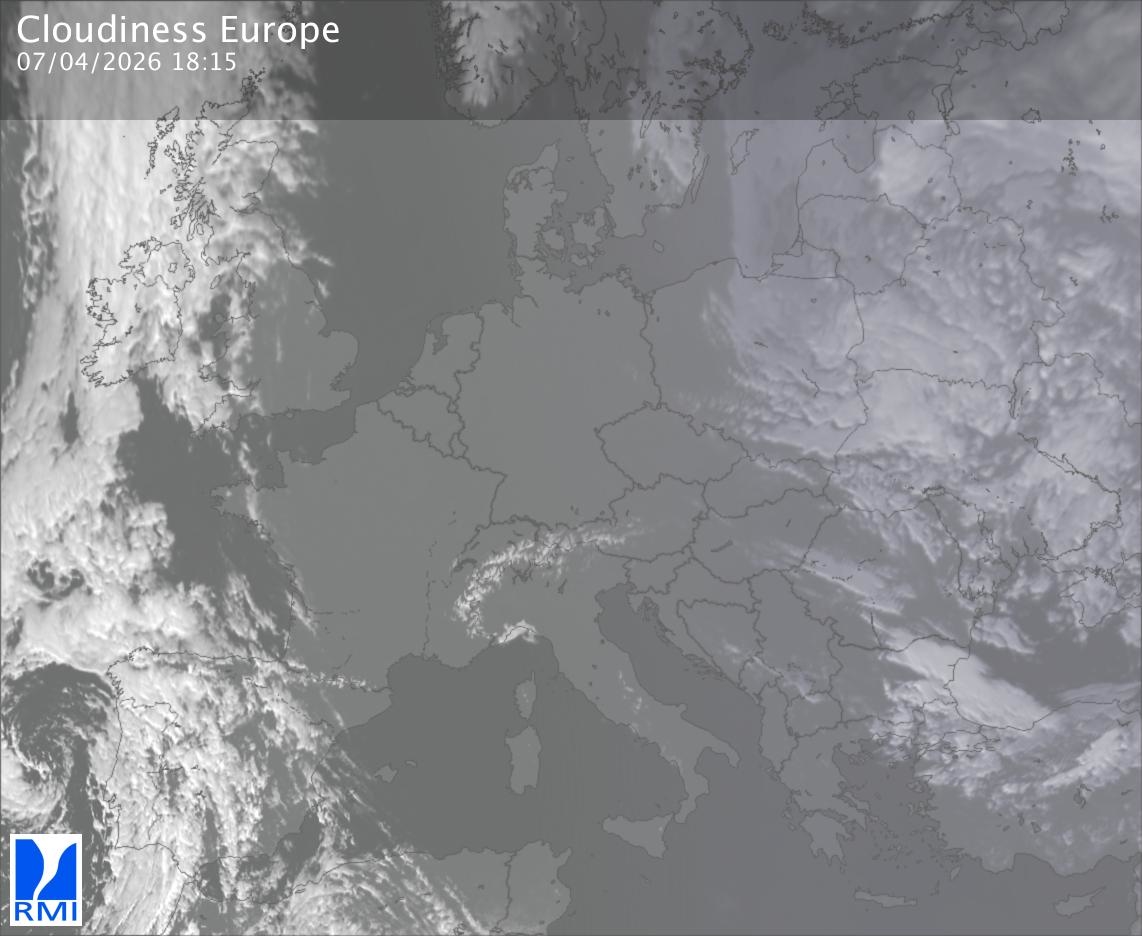 The satellite image of Europe is composed by using both the infrared and the visible light channel from the satellite. Because there are no usable visible light images during the night this composition of channels gives us an image that can be used to observe the clouds by day and by night. The pixelated artifacts are due to the lower resolution of the infrared channel.