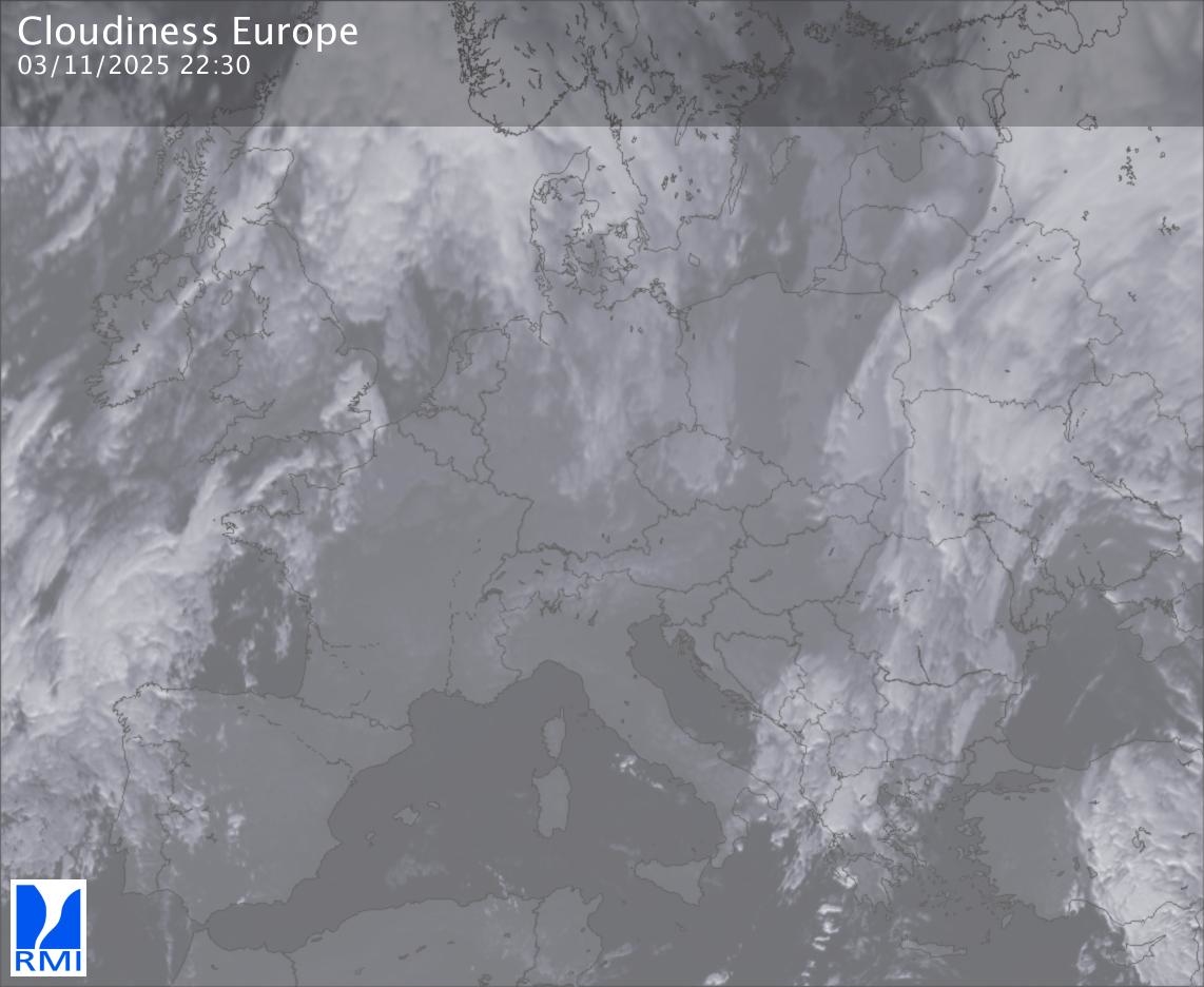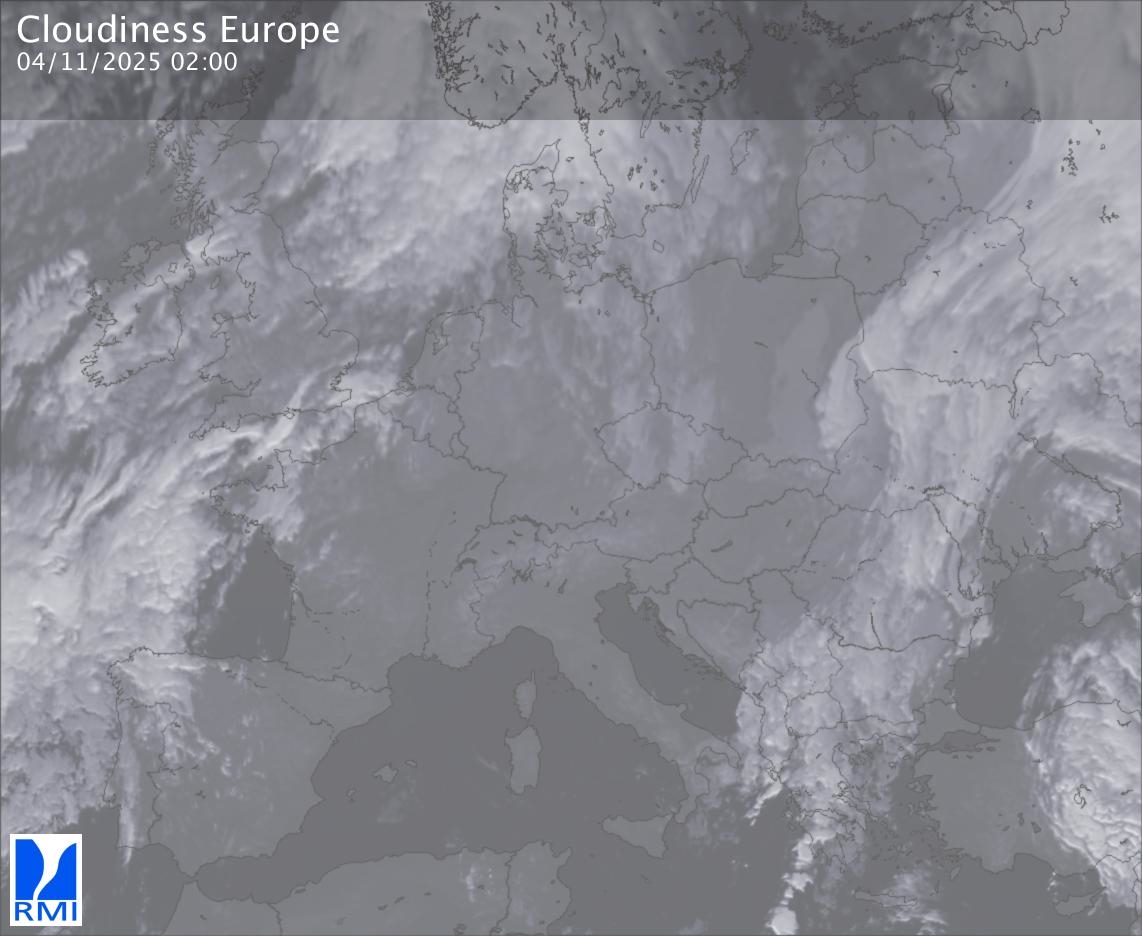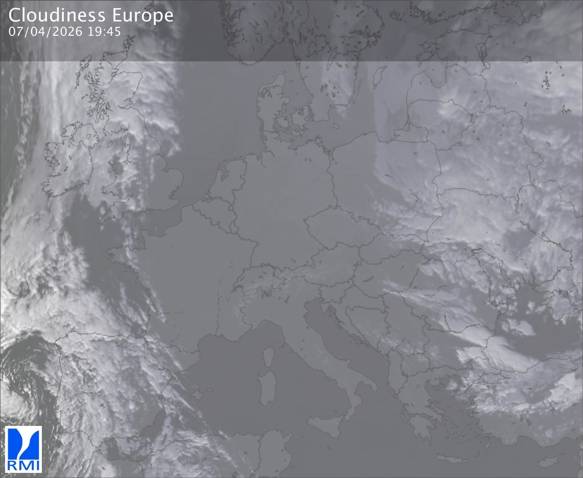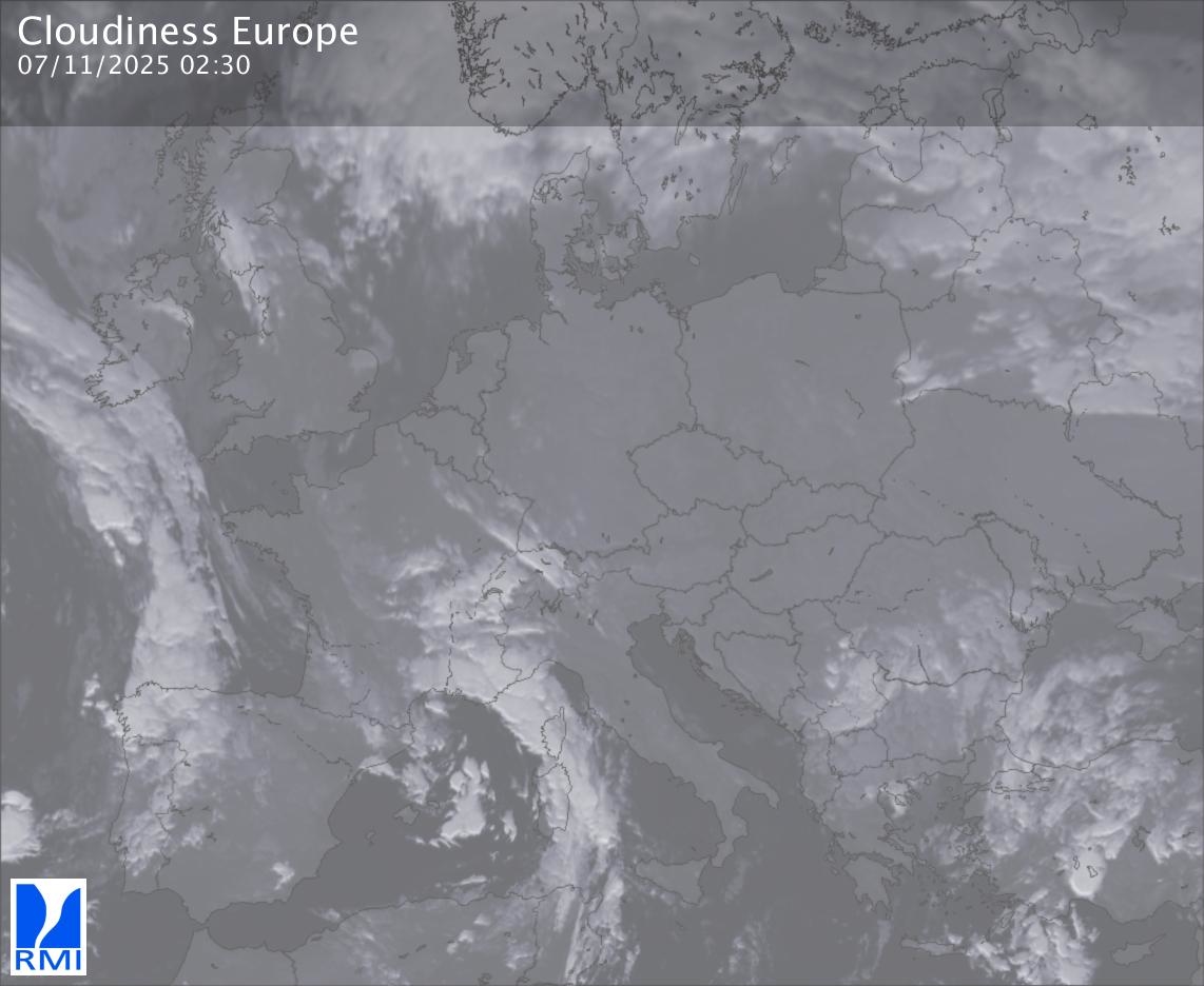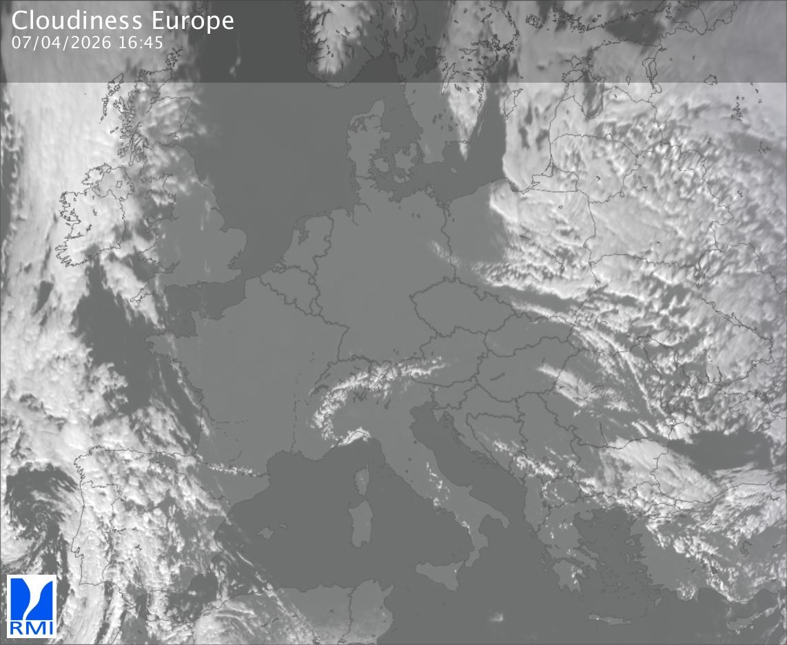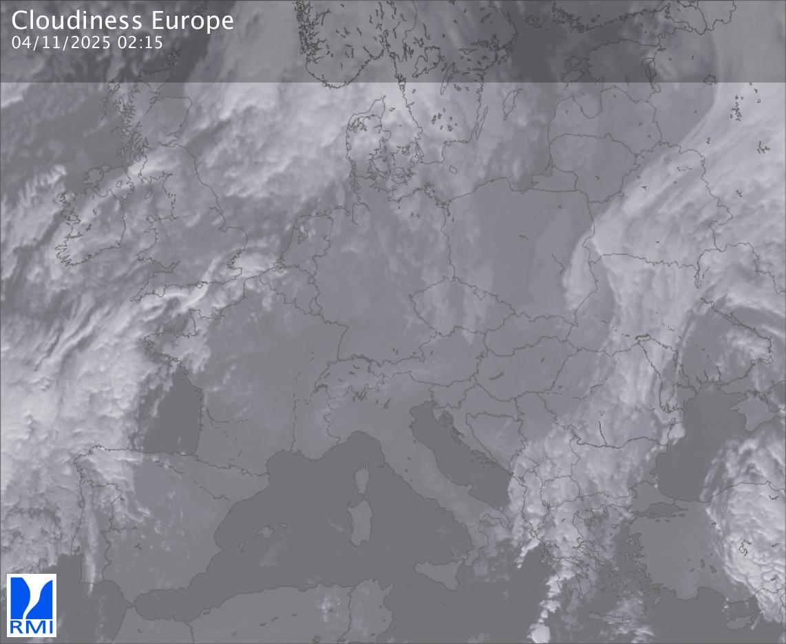 The satellite image of Europe is composed by using both the infrared and the visible light channel from the satellite. Because there are no usable visible light images during the night this composition of channels gives us an image that can be used to observe the clouds by day and by night. The pixelated artifacts are due to the lower resolution of the infrared channel.