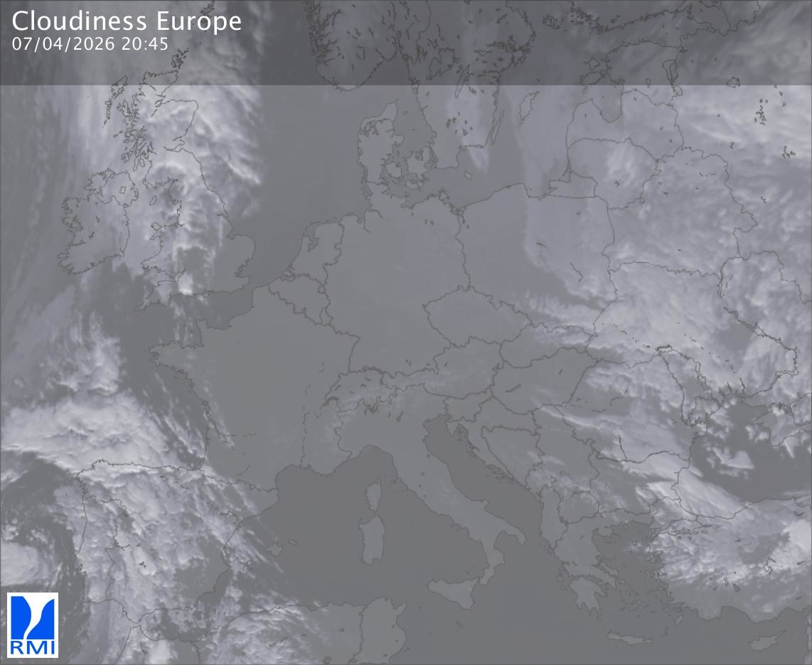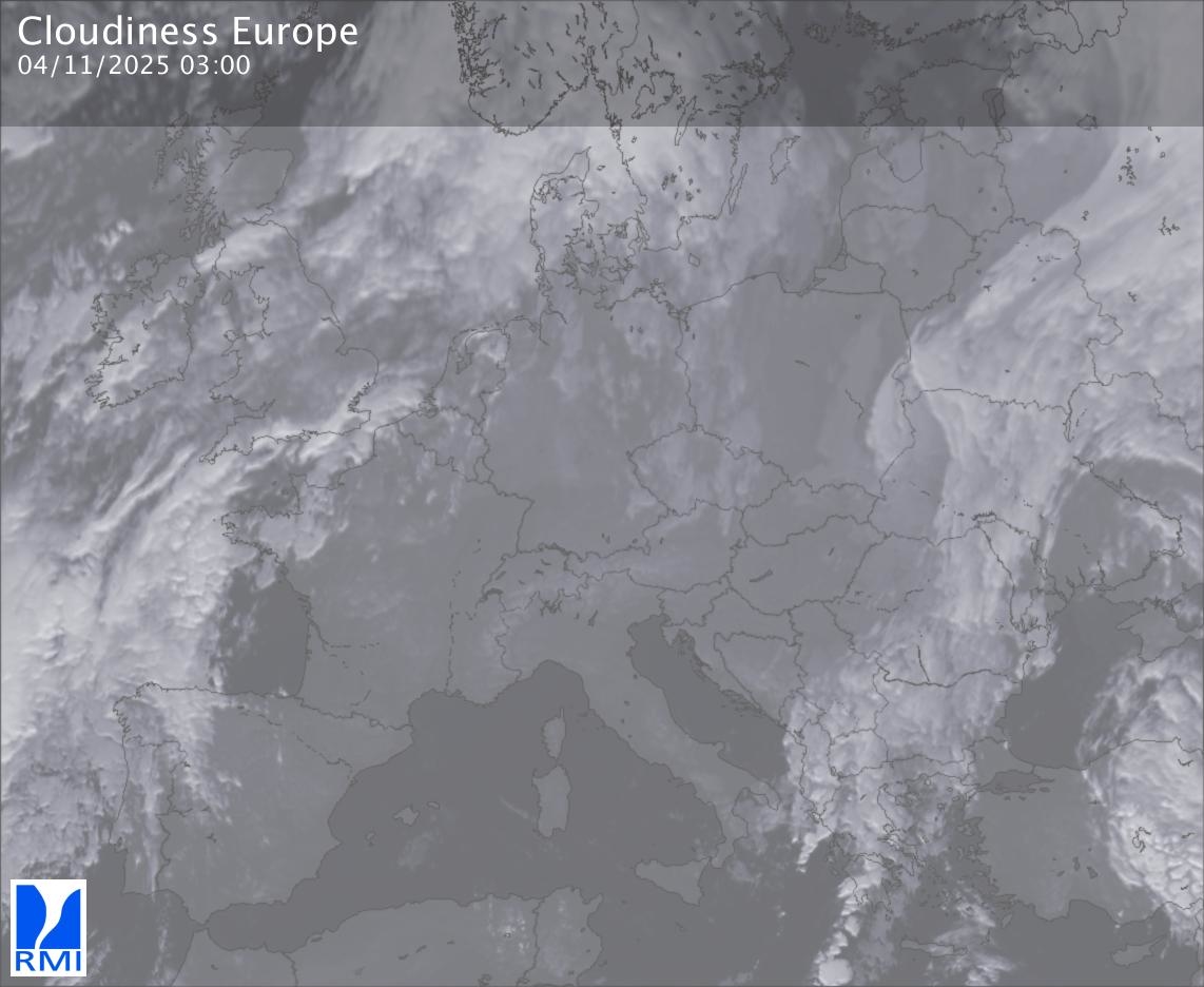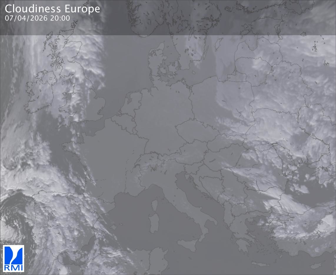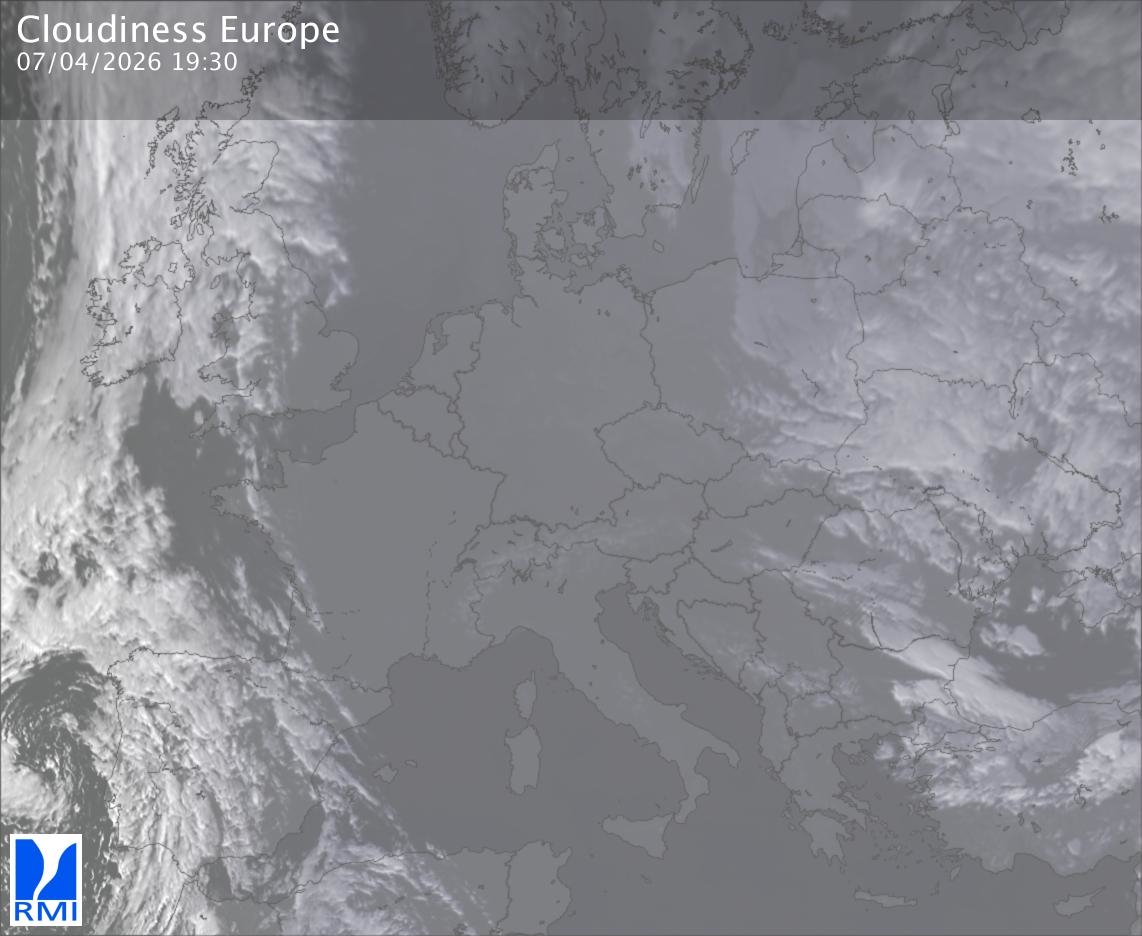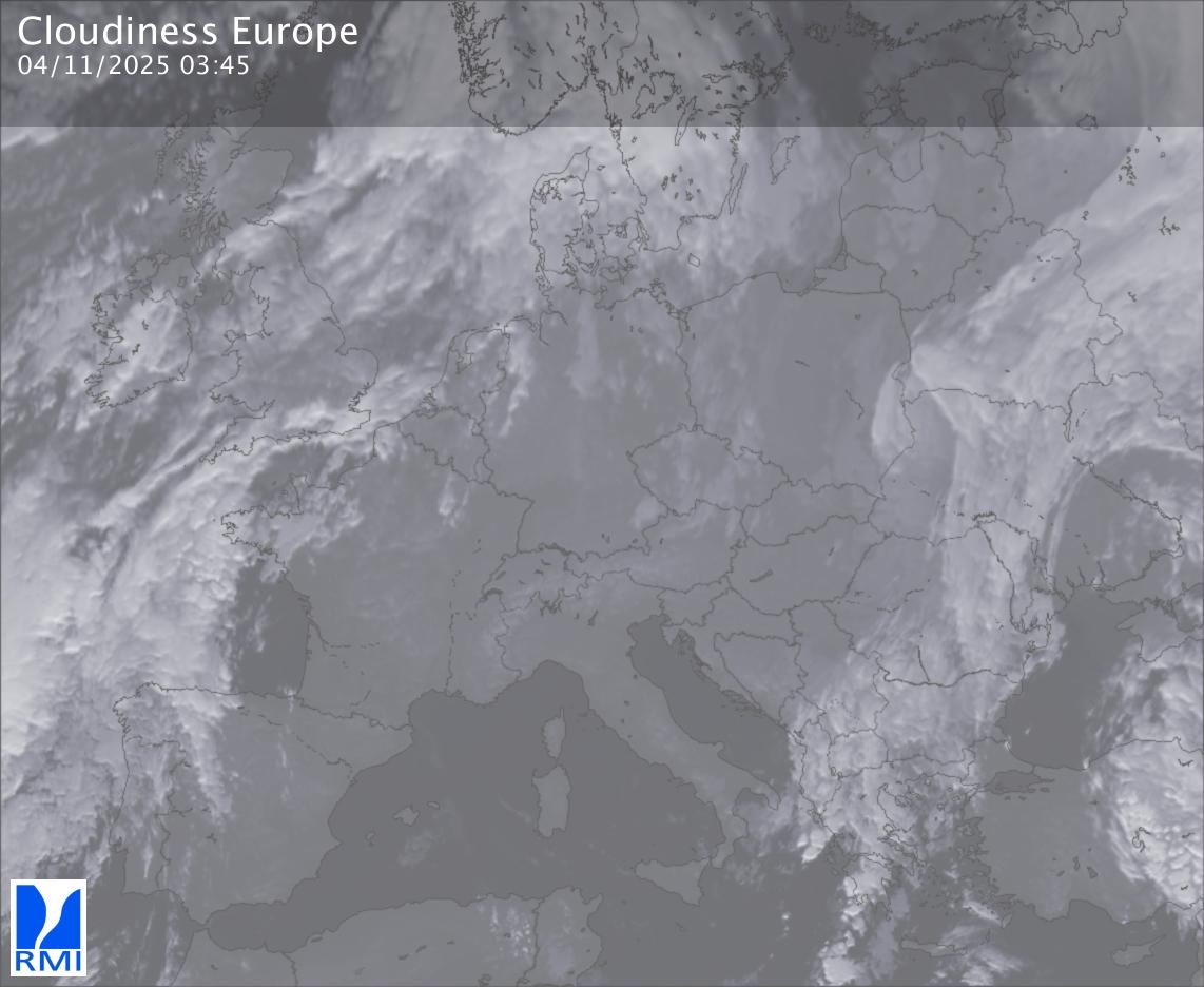 The satellite image of Europe is composed by using both the infrared and the visible light channel from the satellite. Because there are no usable visible light images during the night this composition of channels gives us an image that can be used to observe the clouds by day and by night. The pixelated artifacts are due to the lower resolution of the infrared channel.