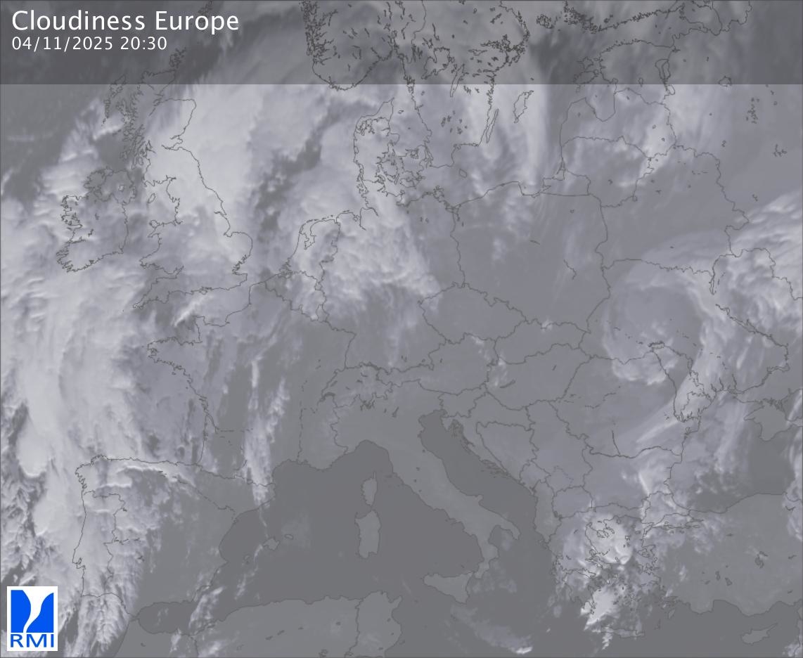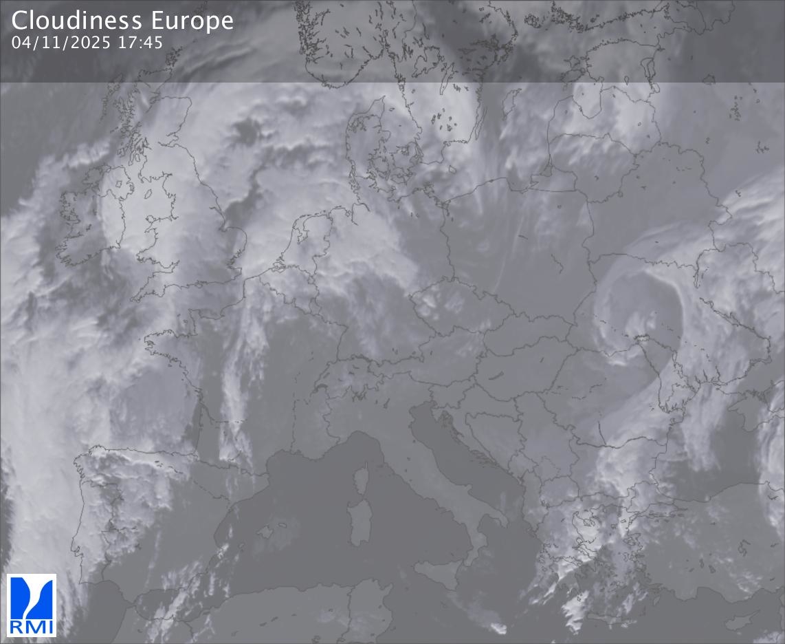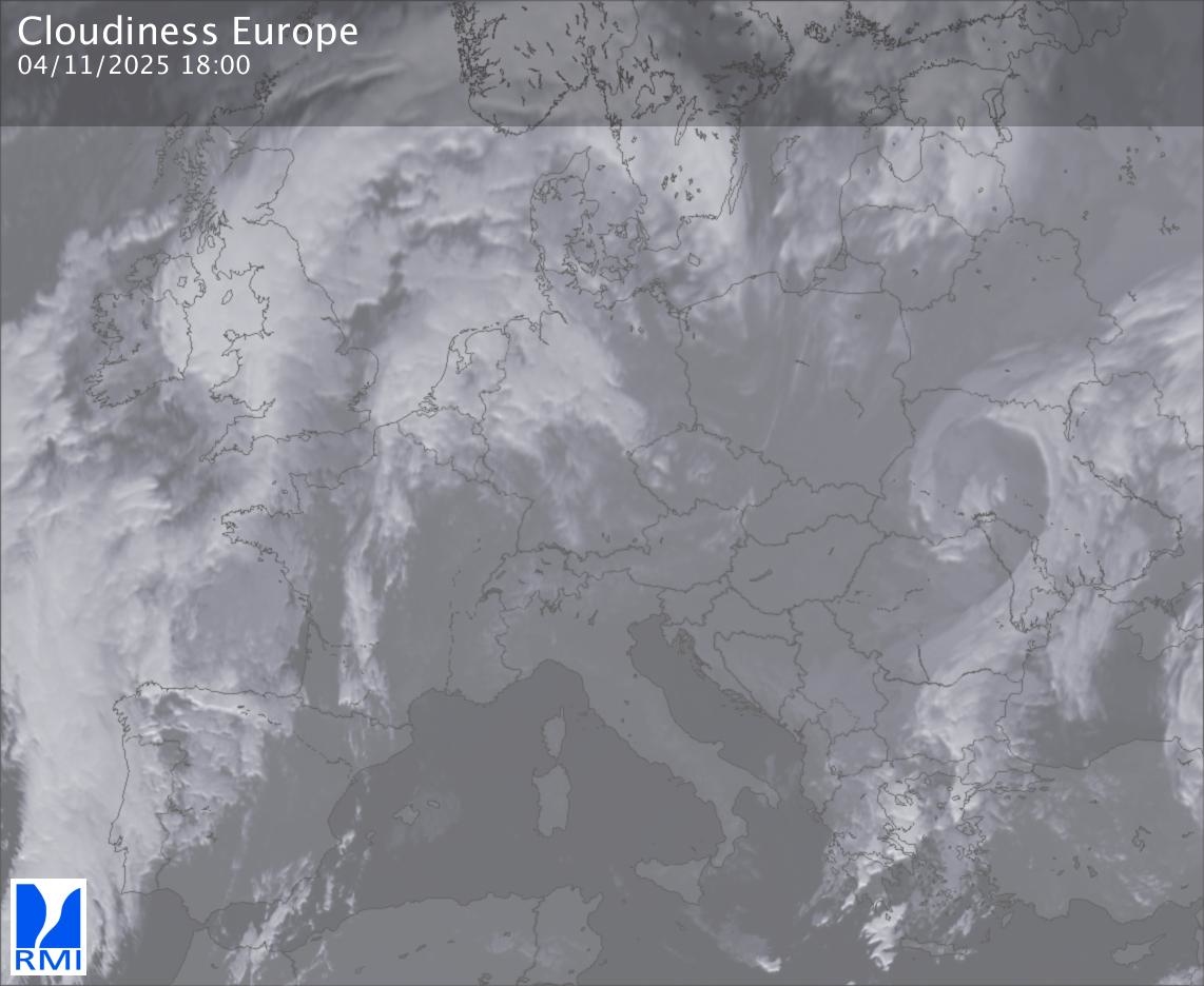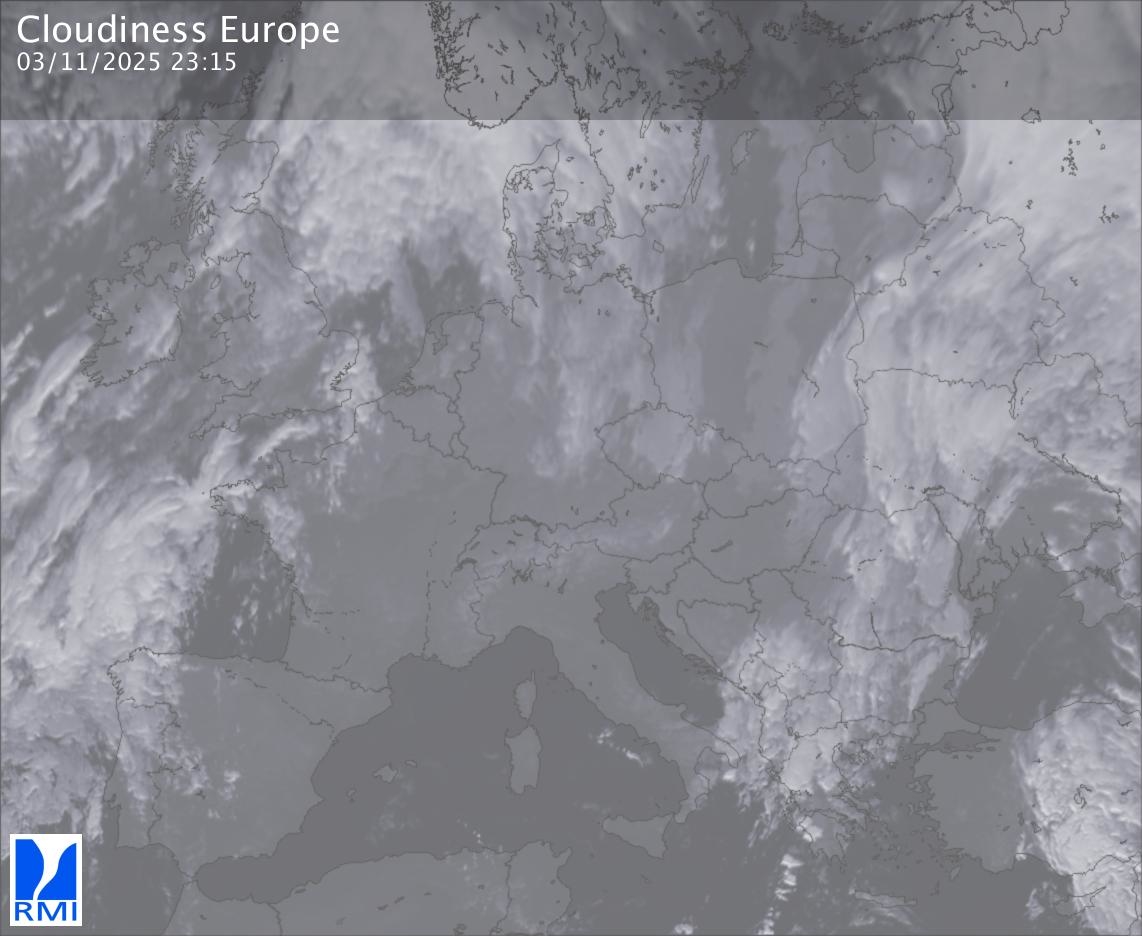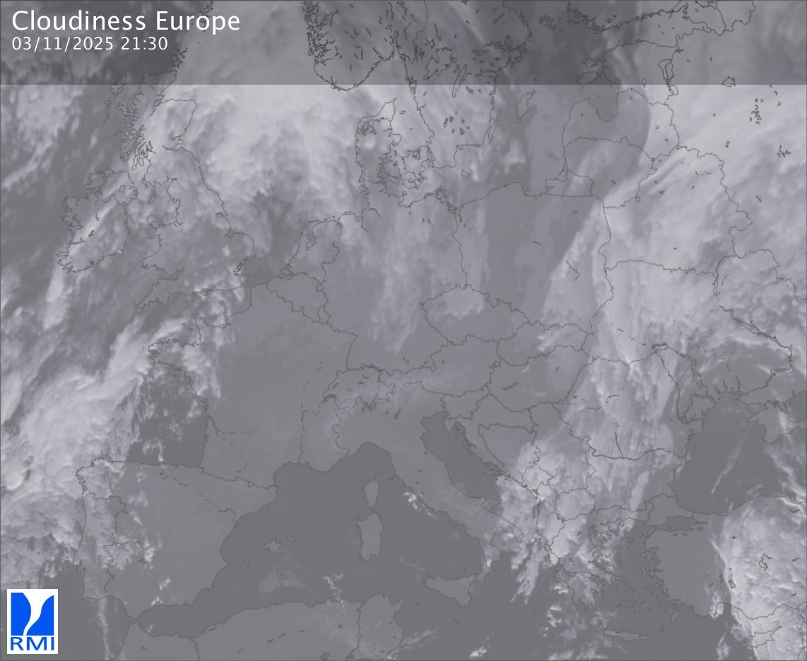 The satellite image of Europe is composed by using both the infrared and the visible light channel from the satellite. Because there are no usable visible light images during the night this composition of channels gives us an image that can be used to observe the clouds by day and by night. The pixelated artifacts are due to the lower resolution of the infrared channel.
