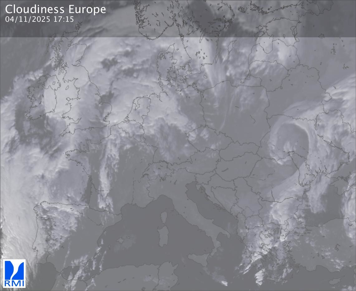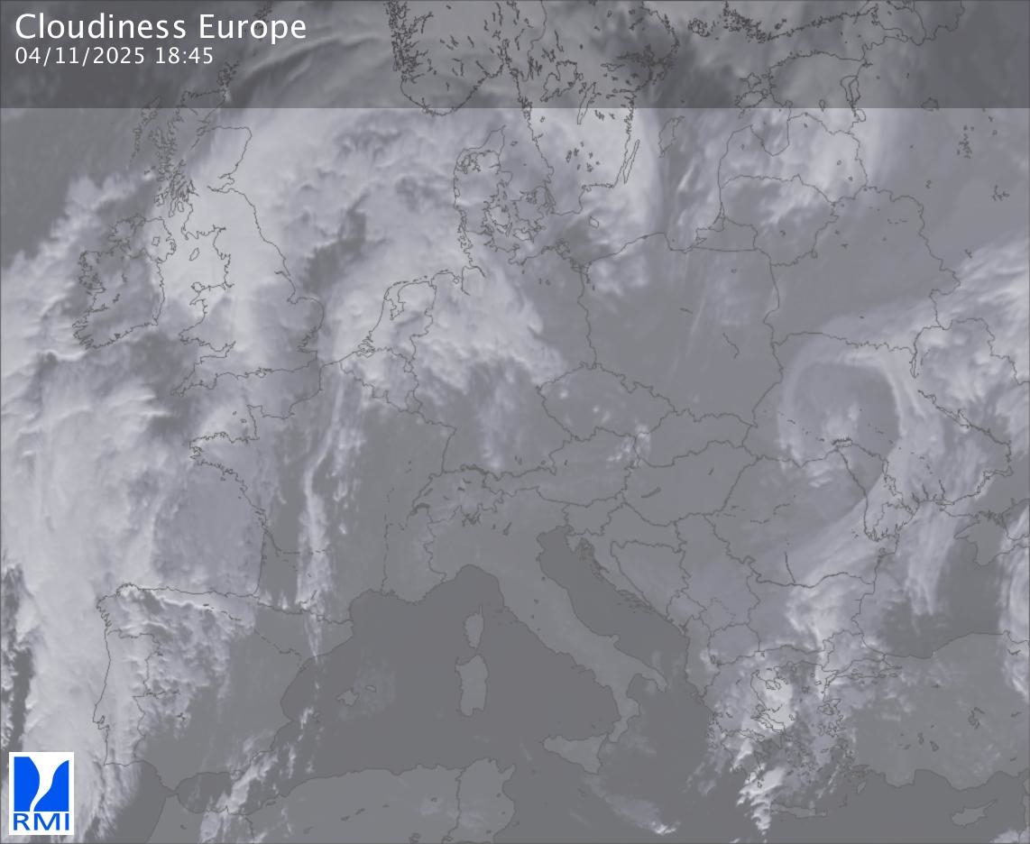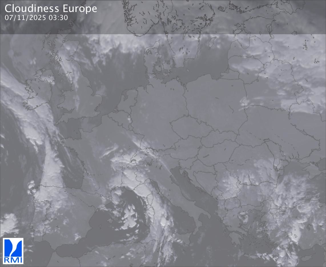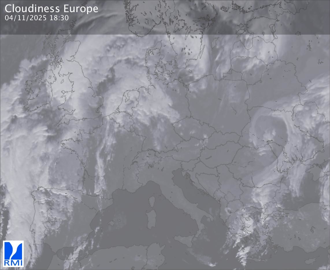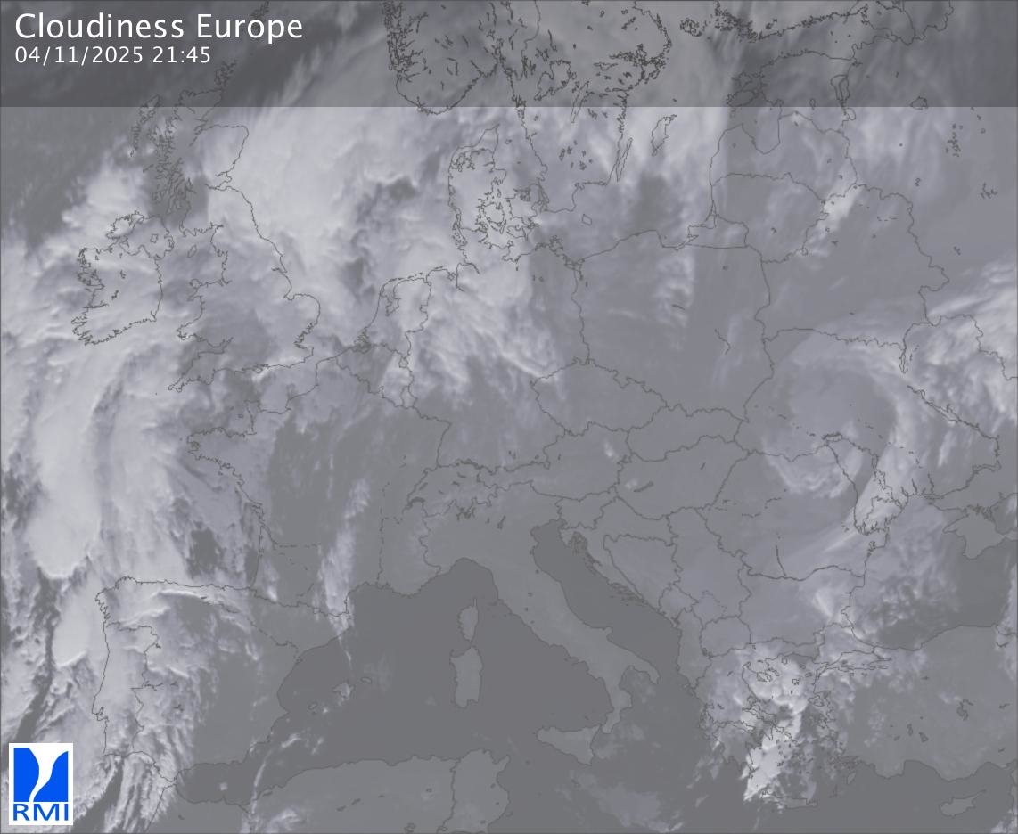 The satellite image of Europe is composed by using both the infrared and the visible light channel from the satellite. Because there are no usable visible light images during the night this composition of channels gives us an image that can be used to observe the clouds by day and by night. The pixelated artifacts are due to the lower resolution of the infrared channel.