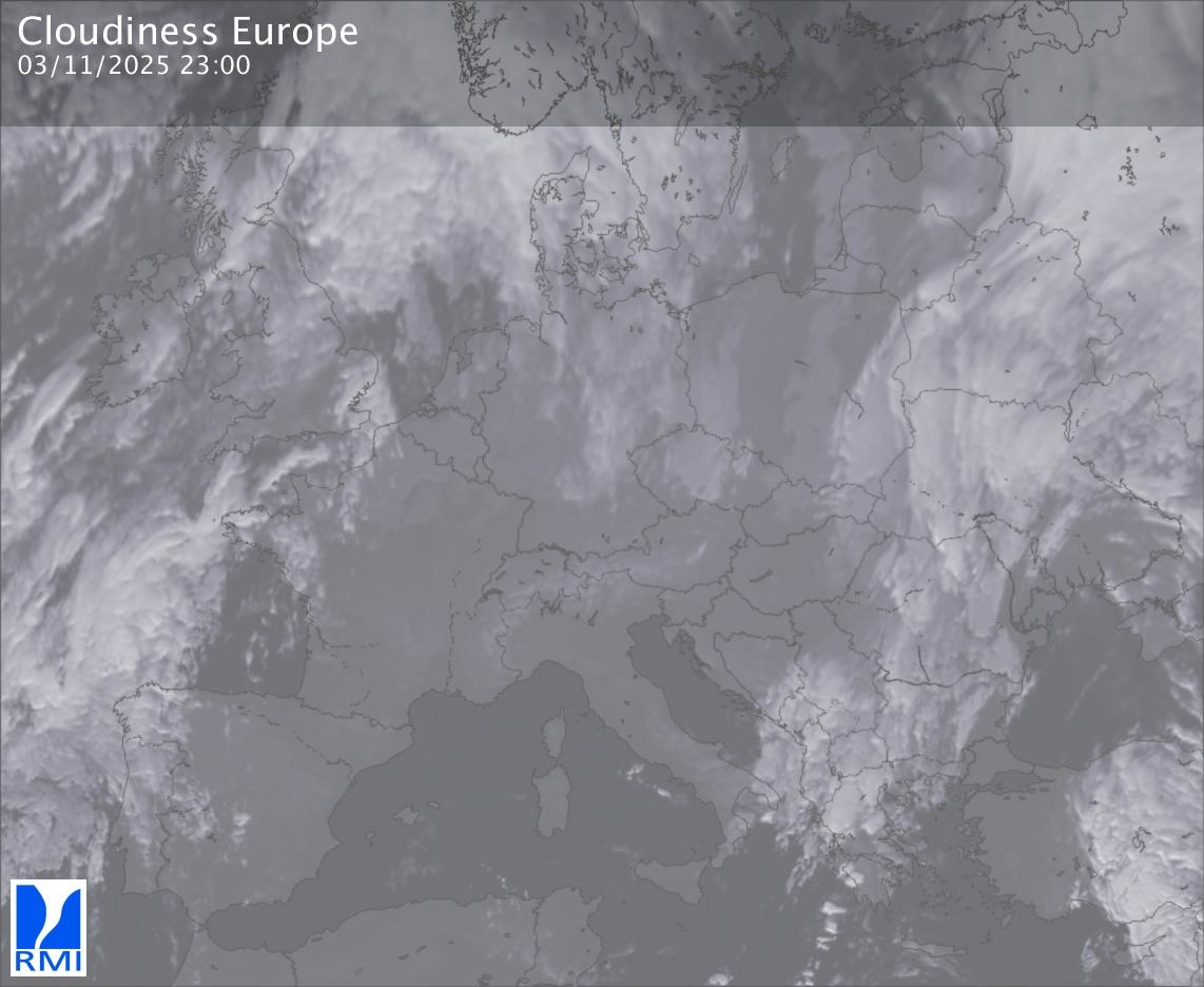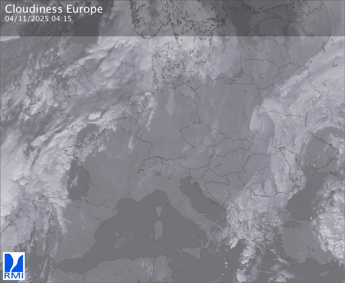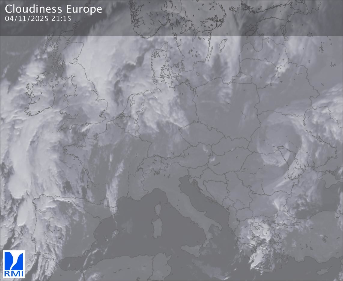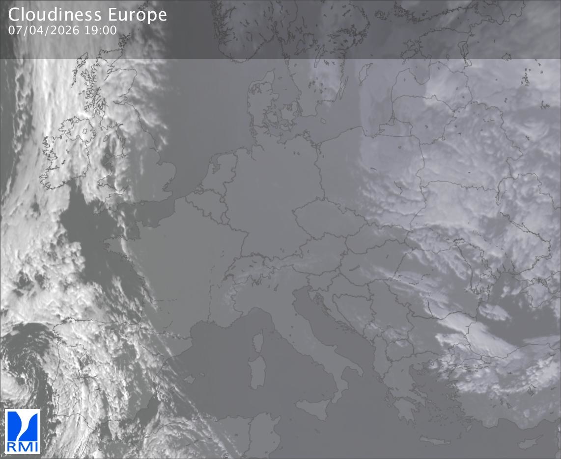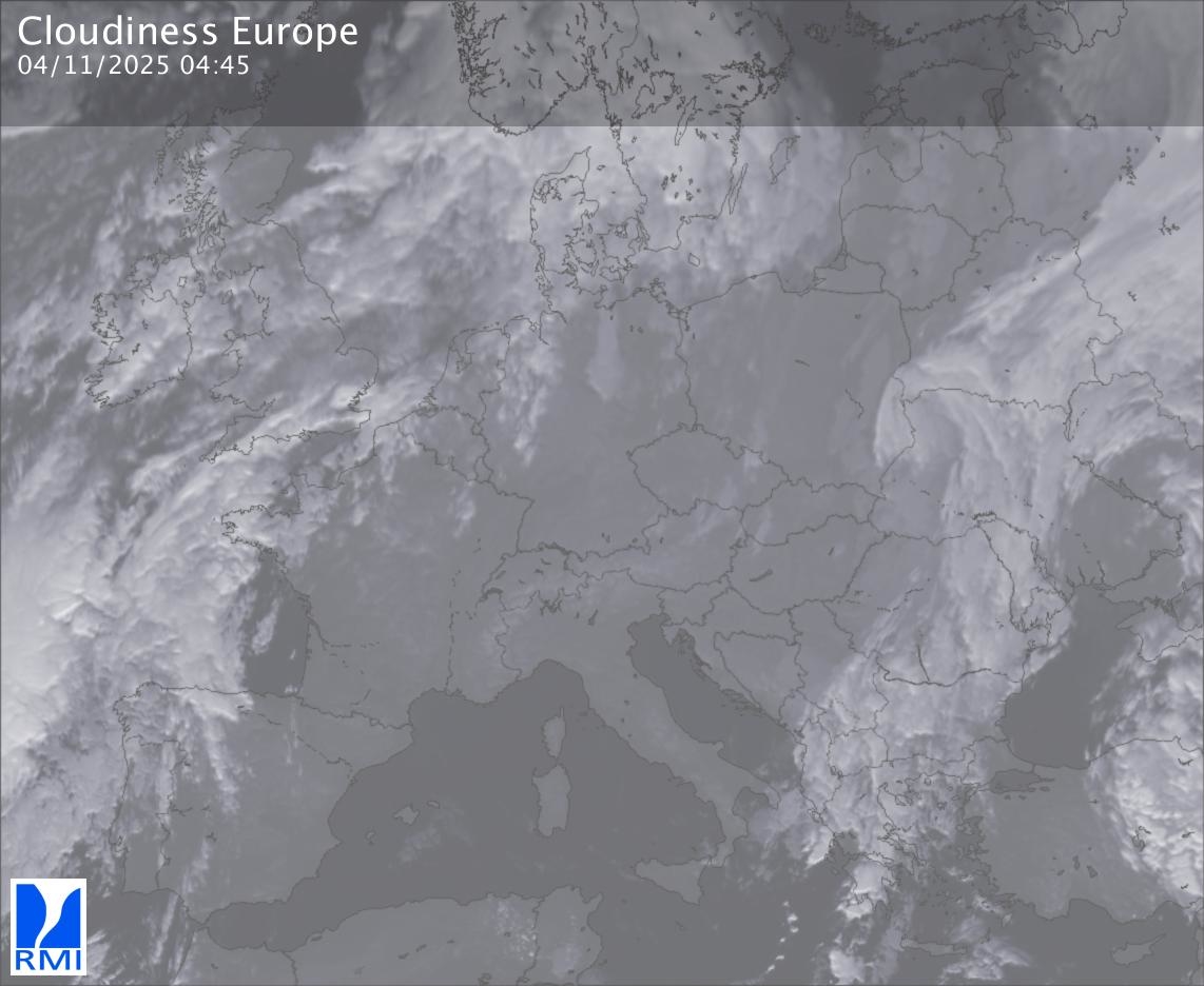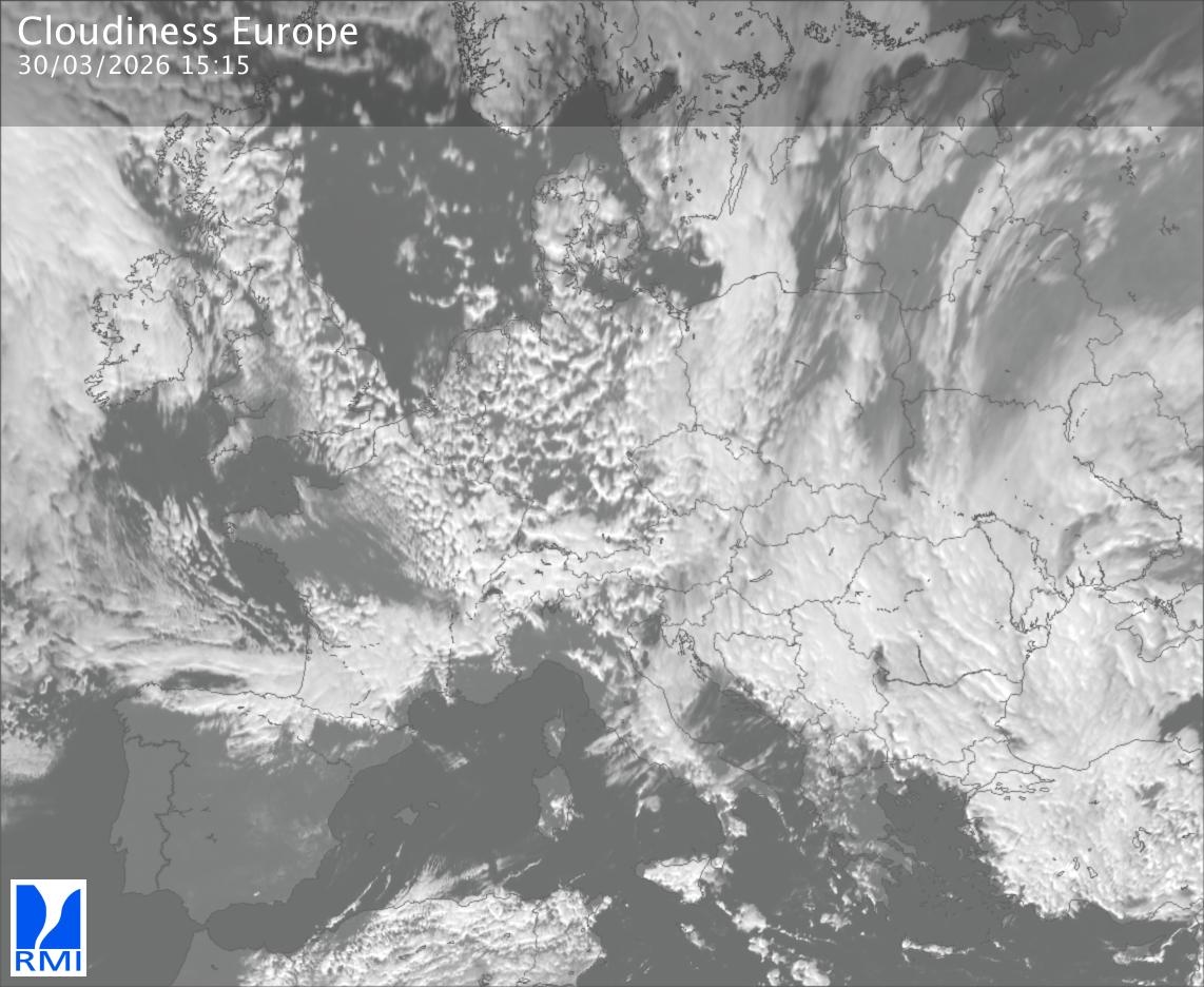 The satellite image of Europe is composed by using both the infrared and the visible light channel from the satellite. Because there are no usable visible light images during the night this composition of channels gives us an image that can be used to observe the clouds by day and by night. The pixelated artifacts are due to the lower resolution of the infrared channel.