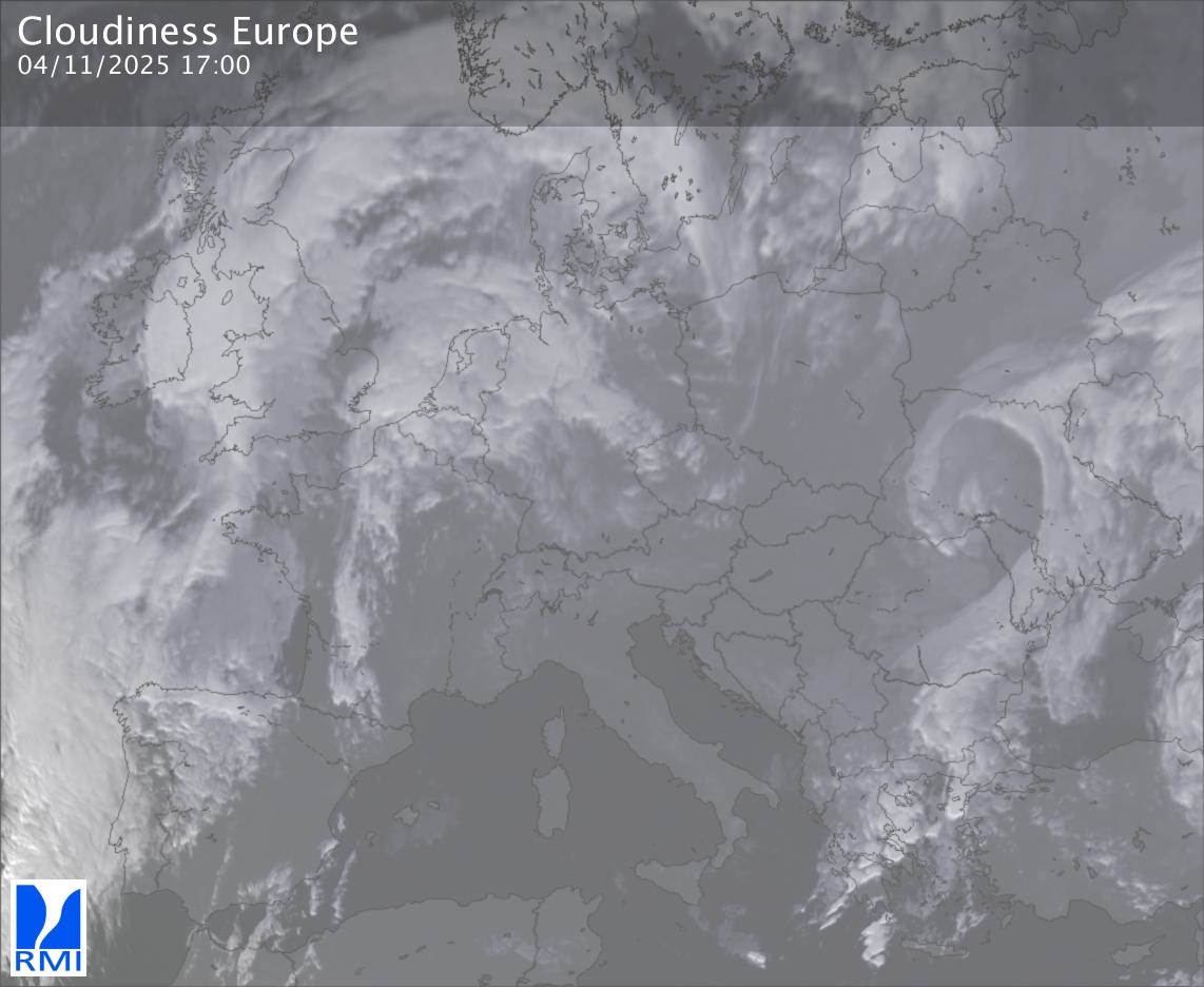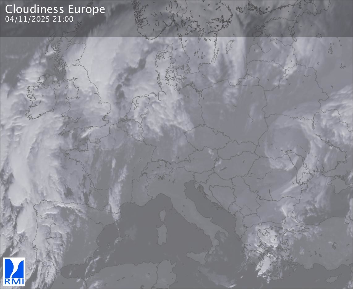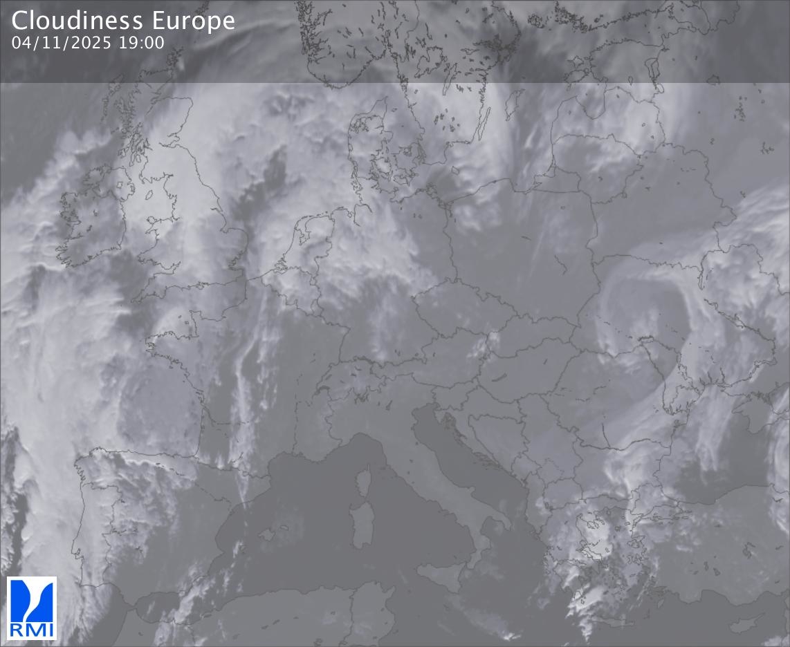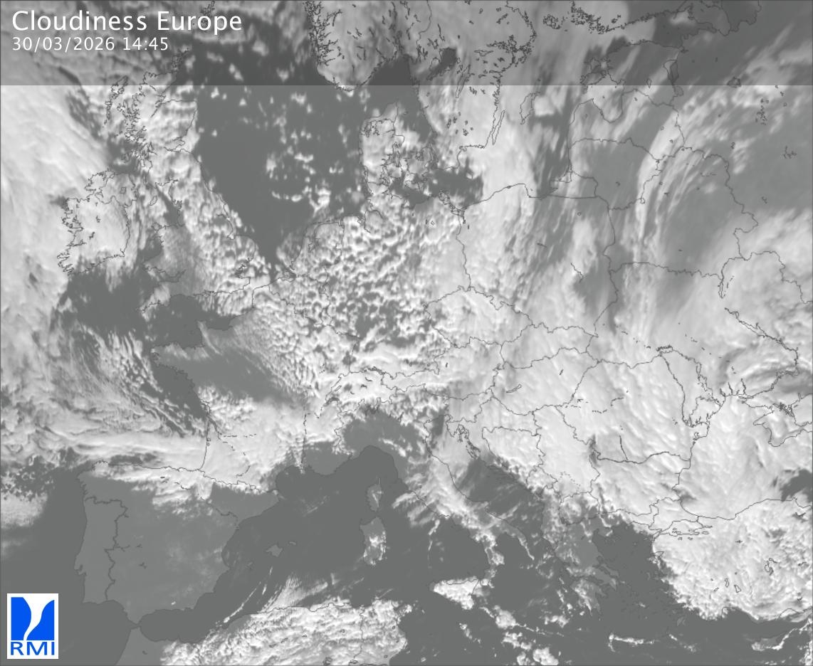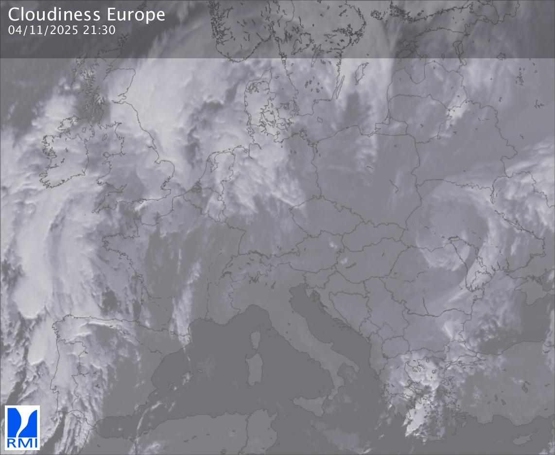 The satellite image of Europe is composed by using both the infrared and the visible light channel from the satellite. Because there are no usable visible light images during the night this composition of channels gives us an image that can be used to observe the clouds by day and by night. The pixelated artifacts are due to the lower resolution of the infrared channel.