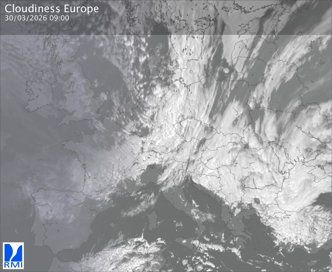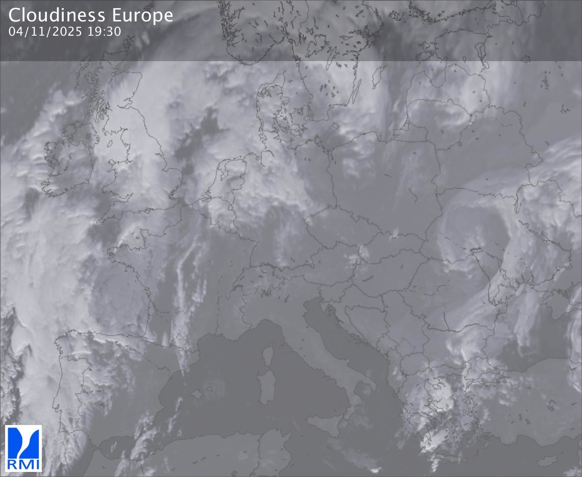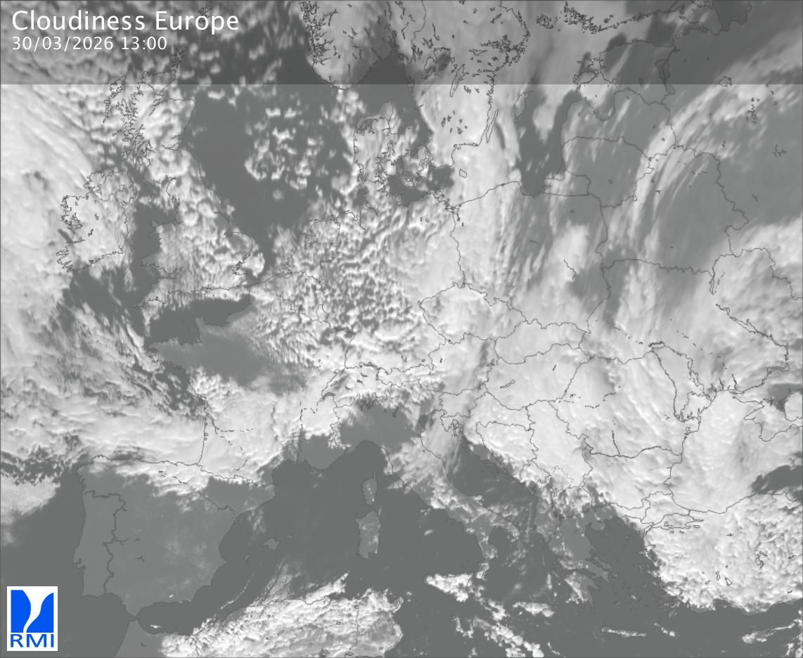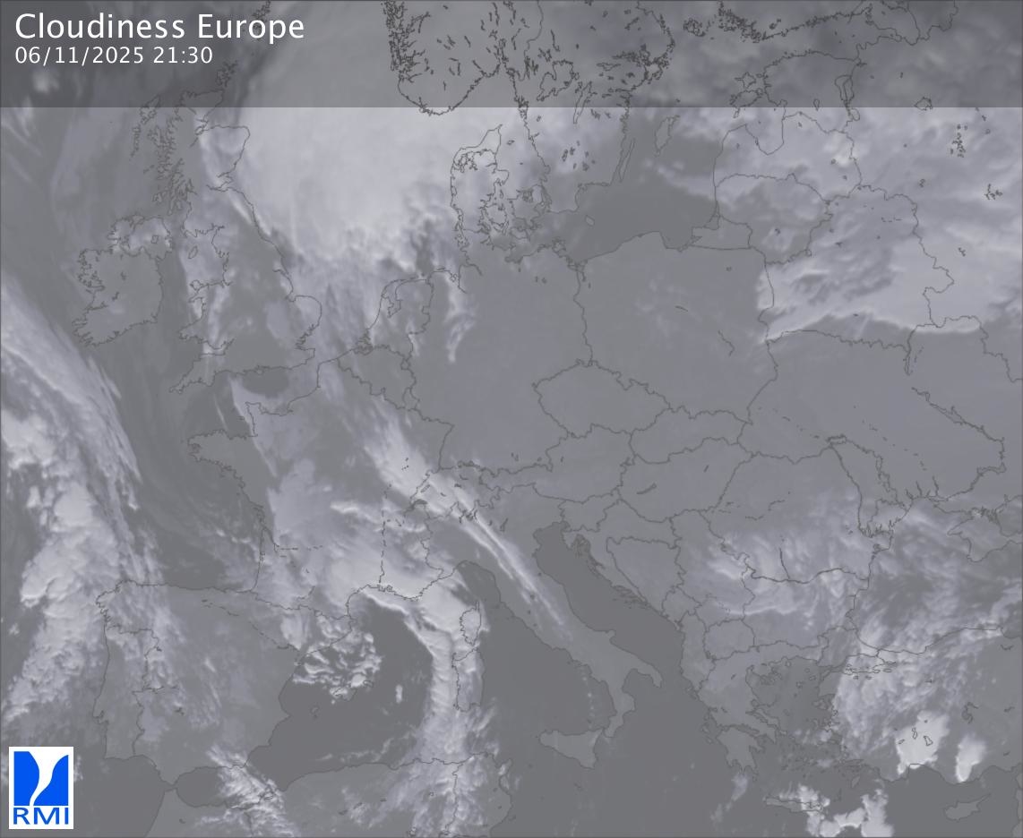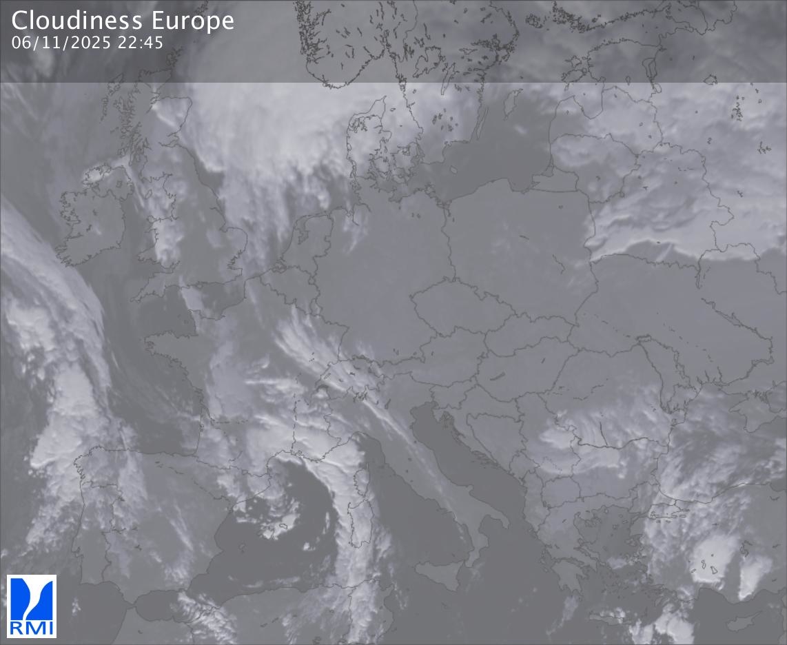 The satellite image of Europe is composed by using both the infrared and the visible light channel from the satellite. Because there are no usable visible light images during the night this composition of channels gives us an image that can be used to observe the clouds by day and by night. The pixelated artifacts are due to the lower resolution of the infrared channel.
