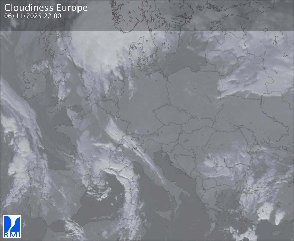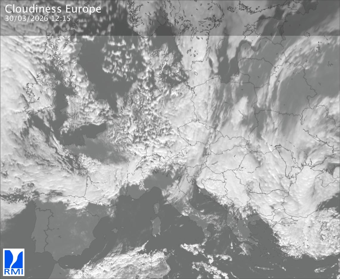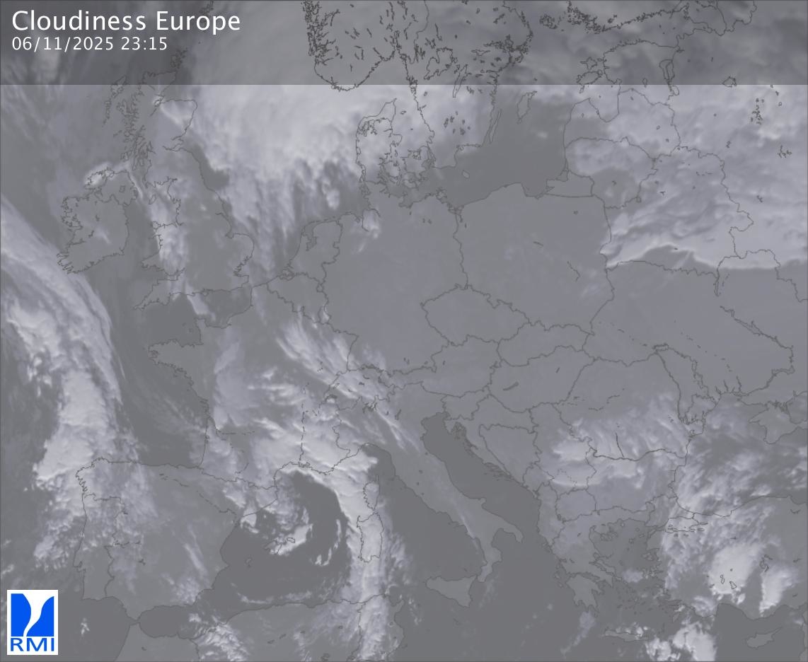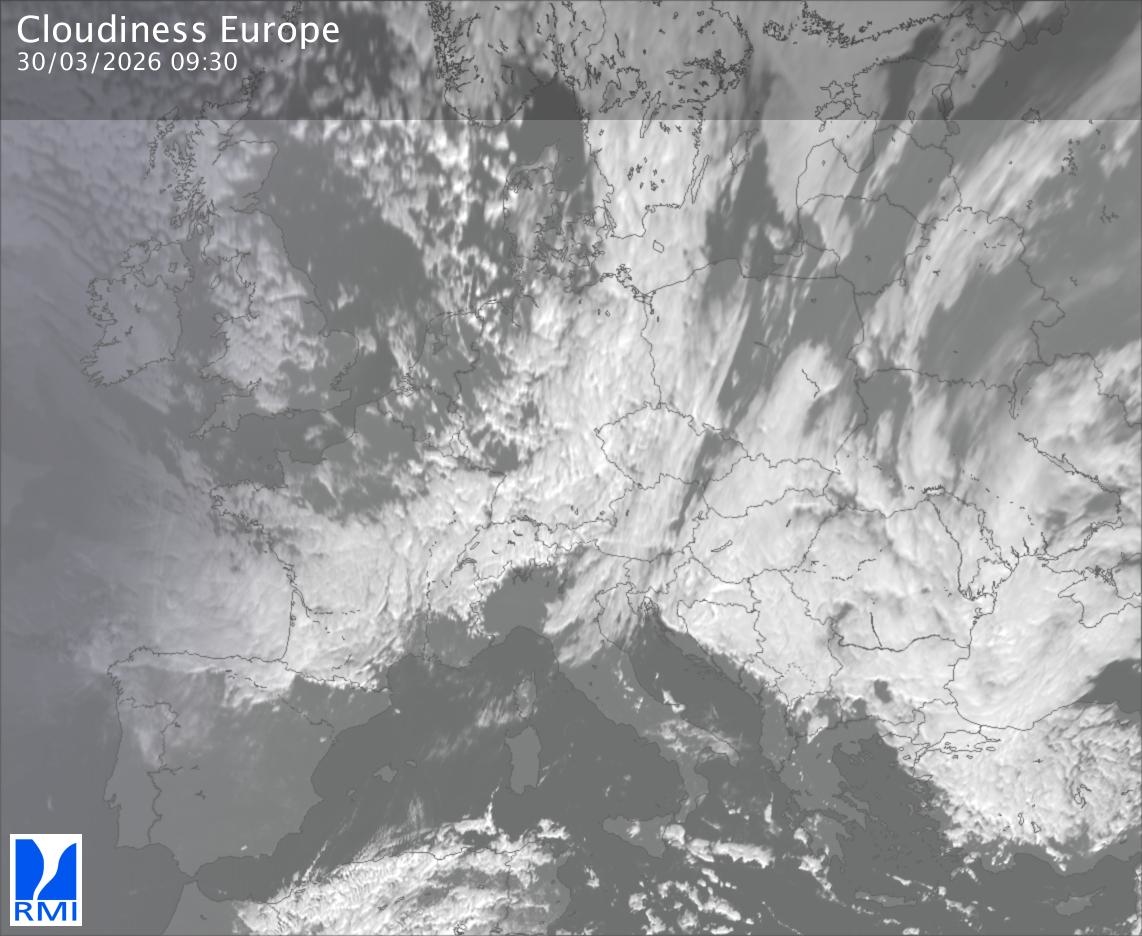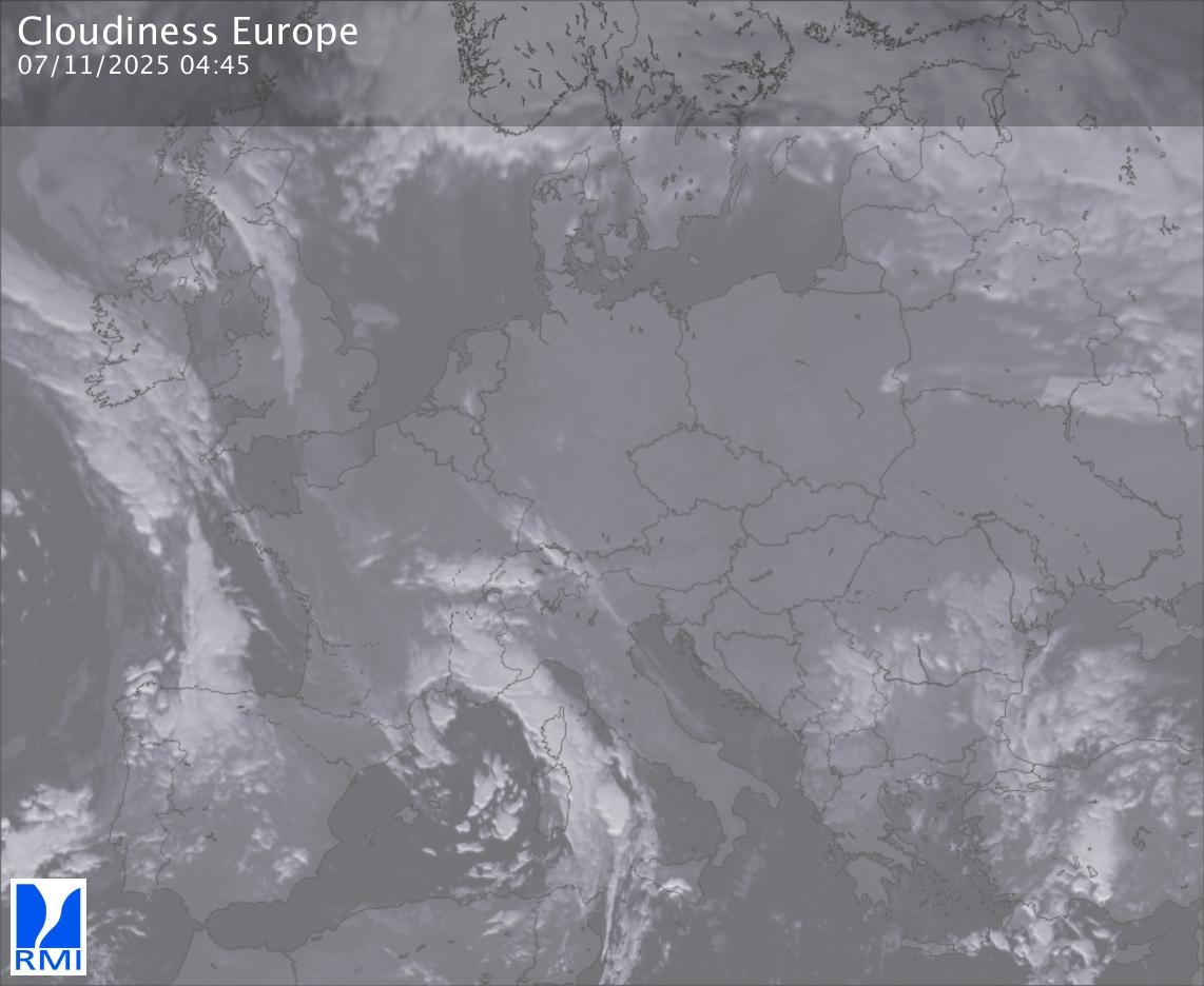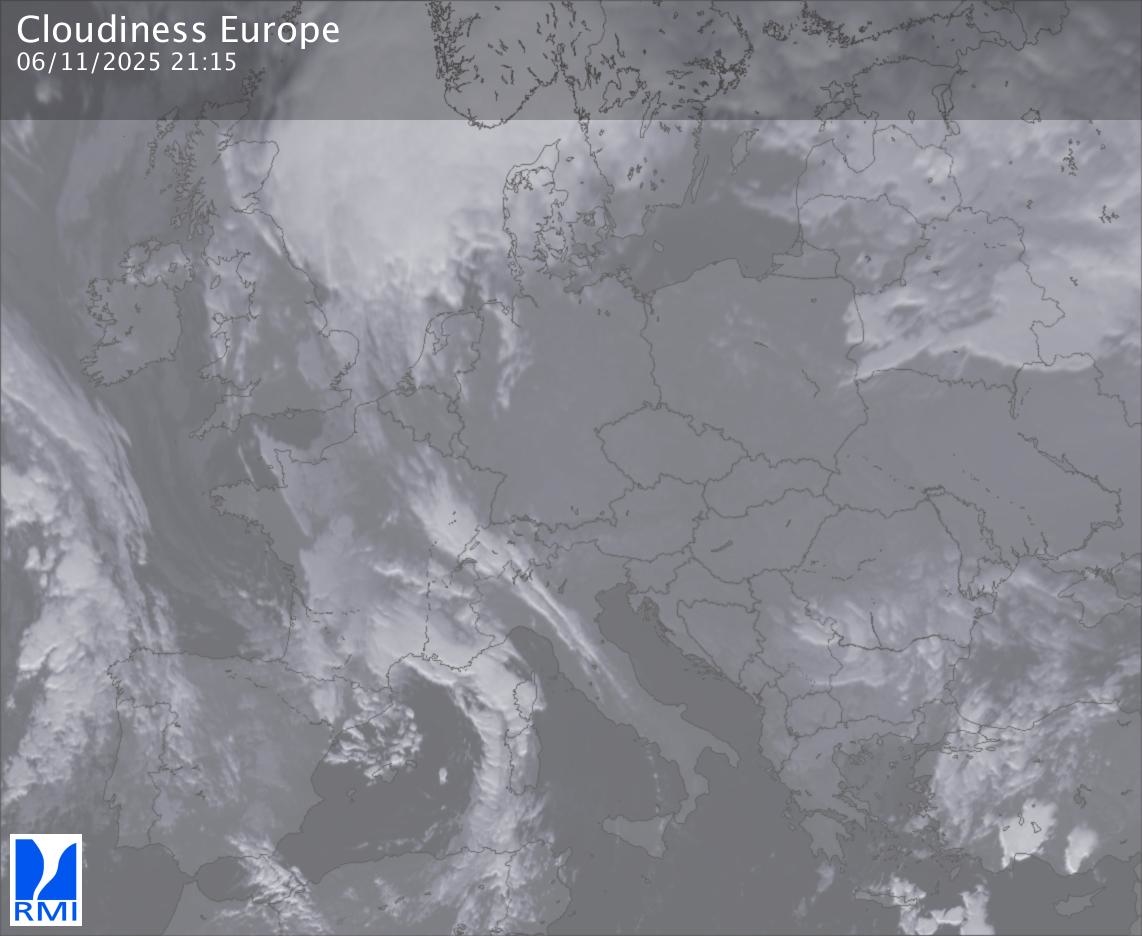 The satellite image of Europe is composed by using both the infrared and the visible light channel from the satellite. Because there are no usable visible light images during the night this composition of channels gives us an image that can be used to observe the clouds by day and by night. The pixelated artifacts are due to the lower resolution of the infrared channel.