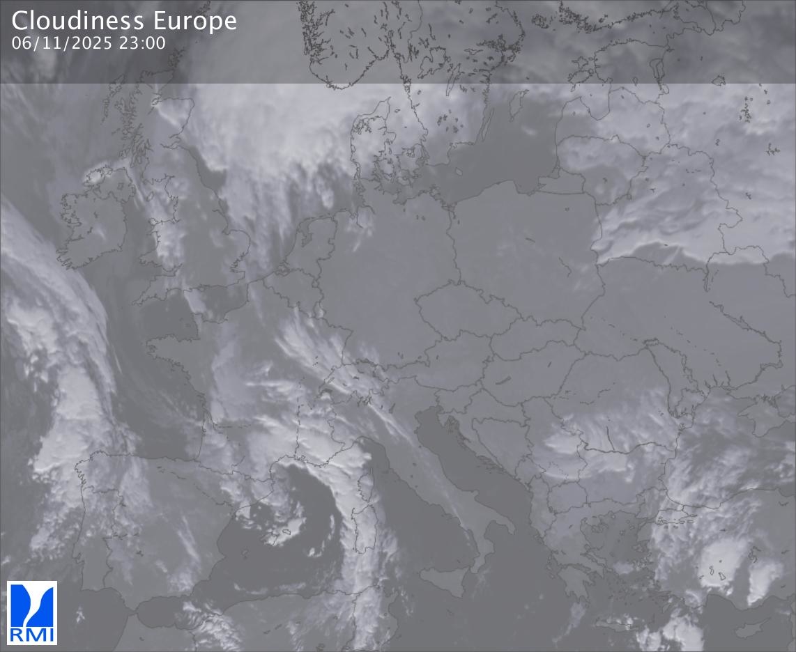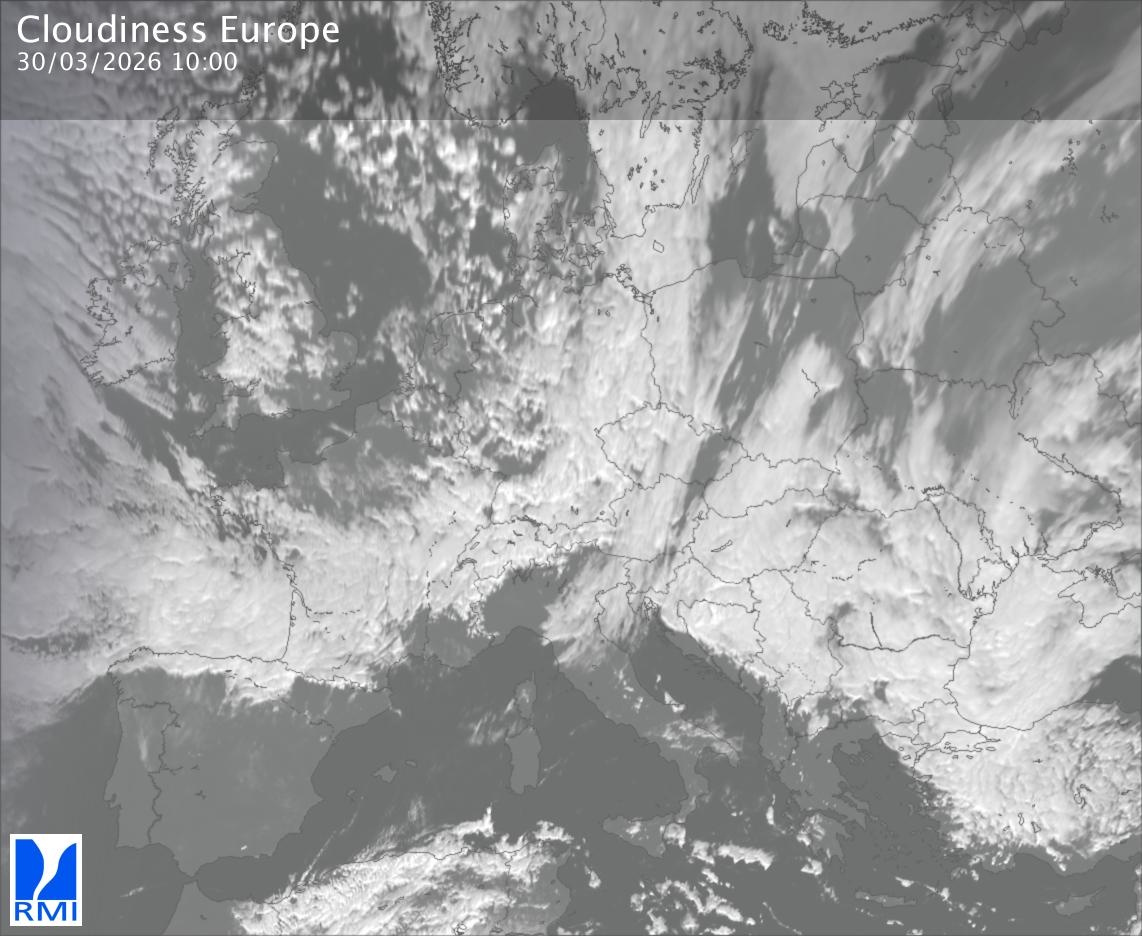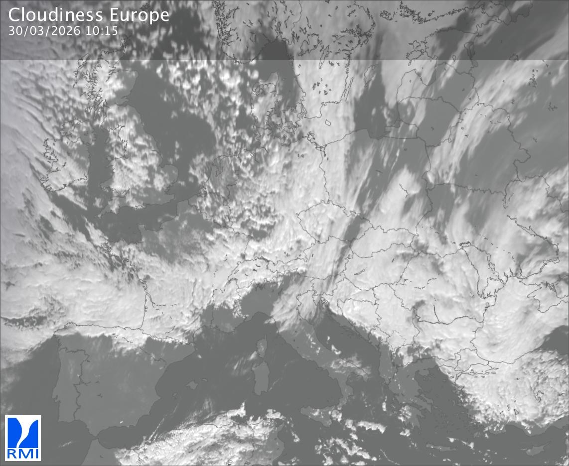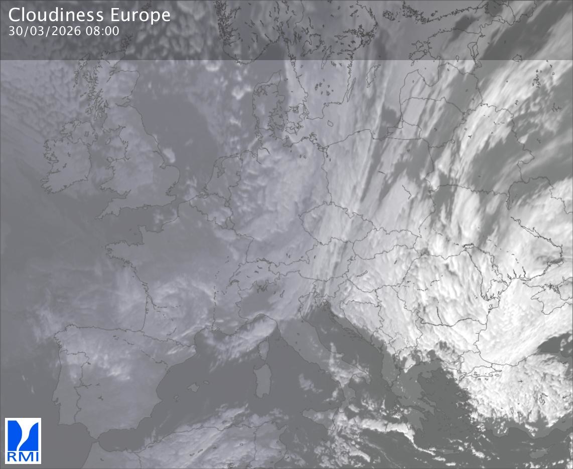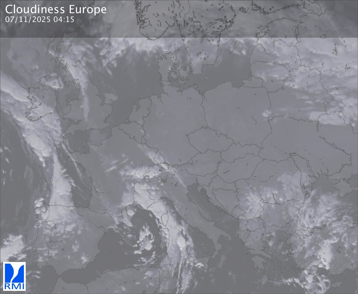 The satellite image of Europe is composed by using both the infrared and the visible light channel from the satellite. Because there are no usable visible light images during the night this composition of channels gives us an image that can be used to observe the clouds by day and by night. The pixelated artifacts are due to the lower resolution of the infrared channel.