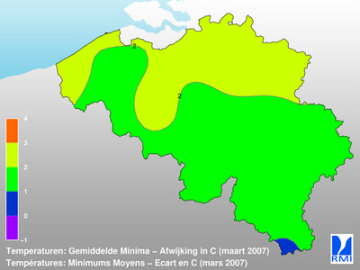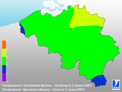 Les courants maritimes et continentaux sont à l'origine d'un excès relativement marqué des températures. L'écart à la normale des moyennes mensuelles des températures maximales journalières fut compris entre +1,5 °C et +3,0 °C . L'écart à la normale des moyennes mensuelles des températures minimales varia entre +0,5 °C et +2,5 °C. Les températures maximales absolues furent comprises entre 15 °C et 20 °C et ont été observées le plus souvent entre le 26 et le 28. Les températures minimales absolues varièrent de -4 °C à 1 °C et se sont produites le plus souvent le 20. À Uccle, la température moyenne fut de 8,0 °C (norm.: 5,5 °C). Les extrêmes moyens furent respectivement de 12,1 °C et 3,9 °C (norm.: 9,0 °C et 2,2 °C). Les extrêmes absolus furent respectivement de 18,1 °C [le 26] et -1,1 °C [le 20] (norm.: 17,2 °C et -4,2 °C). Il y eut 1 jour de gel [min < 0 °C] (norm.: 8,4 j.), mais aucun jour d'hiver [max < 0 °C] (norm. : 0,7 j).