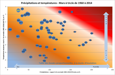 Le premier mois du printemps météorologique fut caractérisé à Uccle par un excès très exceptionnel de la durée d’ensoleillement, un excès exceptionnel de la température moyenne, un déficit exceptionnel du total des précipitations et un déficit anormal de la vitesse moyenne du vent.
