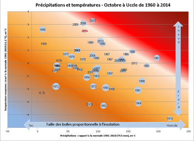 Remarque : à partir du bilan climatologique mensuel de janvier 2011, les normales et les valeurs record (+ et -) données dans le tableau ci-dessous sont calculées pour tous les paramètres sur la période 1981–2010. Cette période de 30 ans est la nouvelle période de référence choisie pour le calcul des normales (moyennes sur la période) à Uccle.