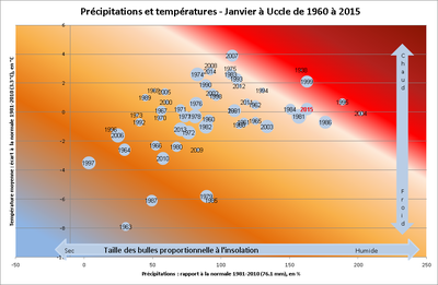 Remarque : à partir du bilan climatologique mensuel de janvier 2011, les normales et les valeurs record (+ et -) données dans le tableau ci-dessous sont calculées pour tous les paramètres sur la période 1981–2010. Cette période de 30 ans est la nouvelle période de référence choisie pour le calcul des normales (moyennes sur la période) à Uccle.