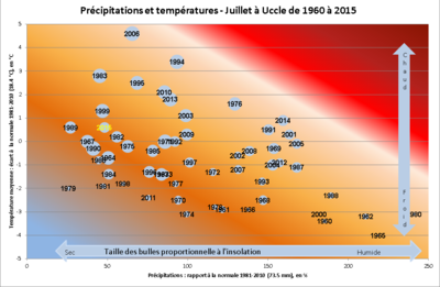 Remarque : à partir du bilan climatologique mensuel de janvier 2011, les normales et les valeurs record (+ et -) données dans le tableau ci-dessous sont calculées pour tous les paramètres sur la période 1981–2010. Cette période de 30 ans est la nouvelle période de référence choisie pour le calcul des normales (moyennes sur la période) à Uccle.