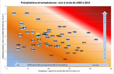 Remarque : à partir du bilan climatologique mensuel de janvier 2011, les normales et les valeurs record (+ et -) données dans le tableau ci-dessous sont calculées pour tous les paramètres sur la période 1981–2010. Cette période de 30 ans est la nouvelle période de référence choisie pour le calcul des normales (moyennes sur la période) à Uccle.
