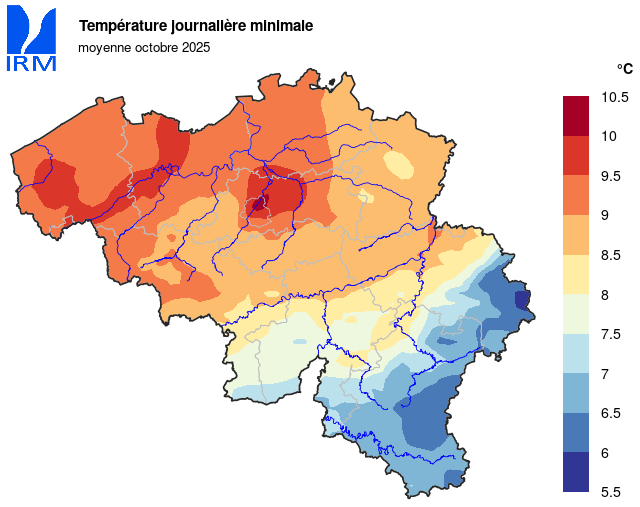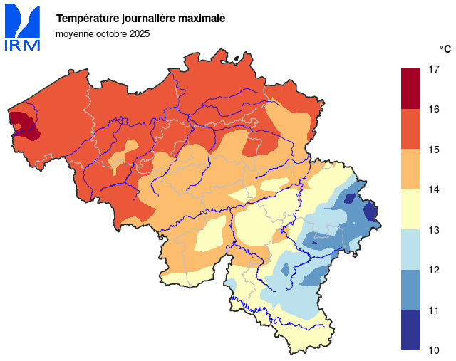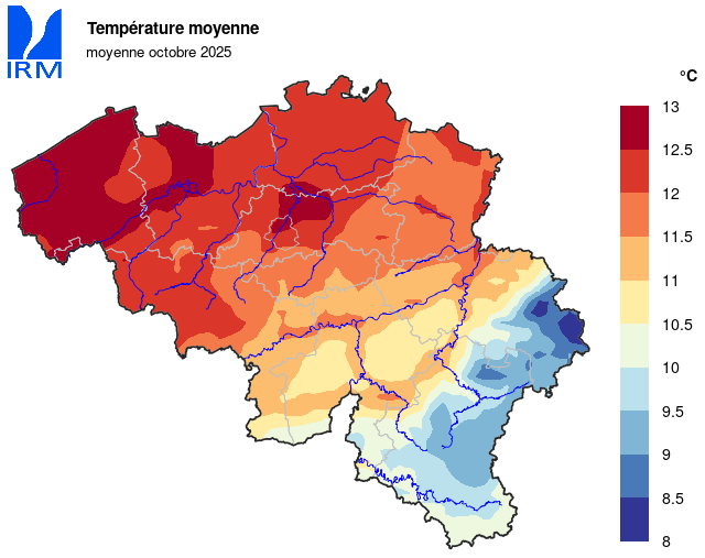 À Uccle, la température moyenne du mois d'octobre était de 12,0°C (normale : 11,3°C). Les températures moyennes ont été supérieures à leurs normales respectives pendant la majeure partie du mois. Seuls le début du mois et la période du 24 au 27 octobre ont été légèrement plus froids que la normale.