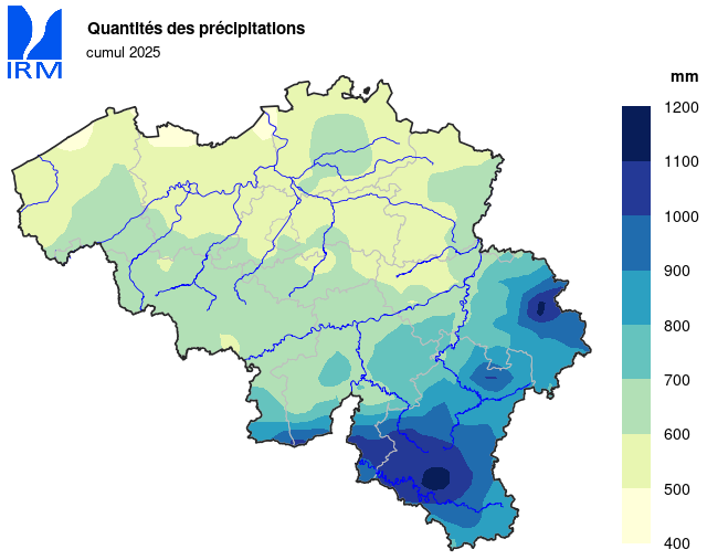 Après l’année 2024 la plus humide jamais enregistrée (1170,7 mm), les précipitations ont diminué de près de moitié en 2025. À Uccle, il n'est tombé que 620,6 mm de précipitations (normale : 837,3 mm) et cette quantité annuelle s'est répartie sur 145 jours (normale : 189,8 jours).