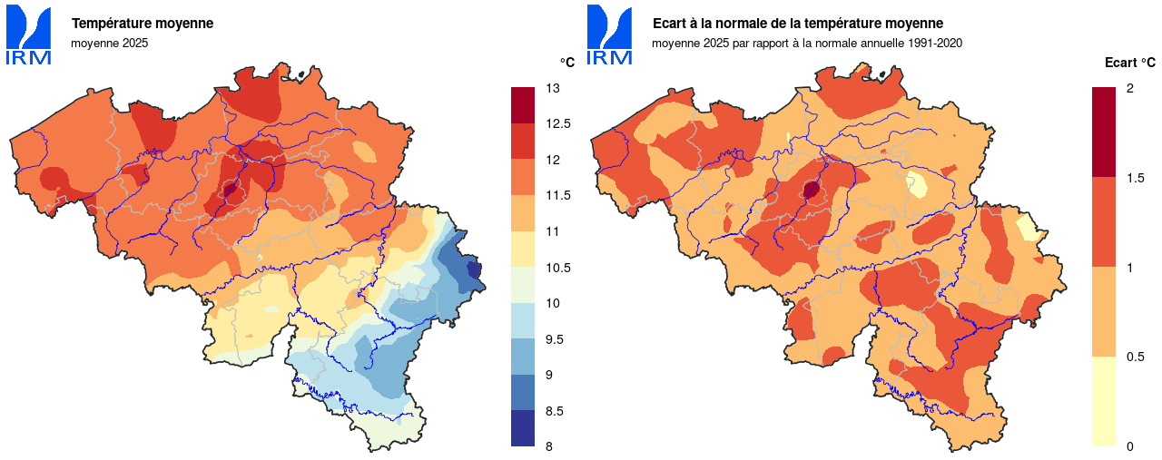 Selon l'Organisation météorologique mondiale, 2025 sera la deuxième ou troisième année la plus chaude à l'échelle planétaire (observations depuis les années 1860). À Uccle, 2025 a été, avec 2014, la quatrième année la plus chaude depuis le début des observations en 1833.