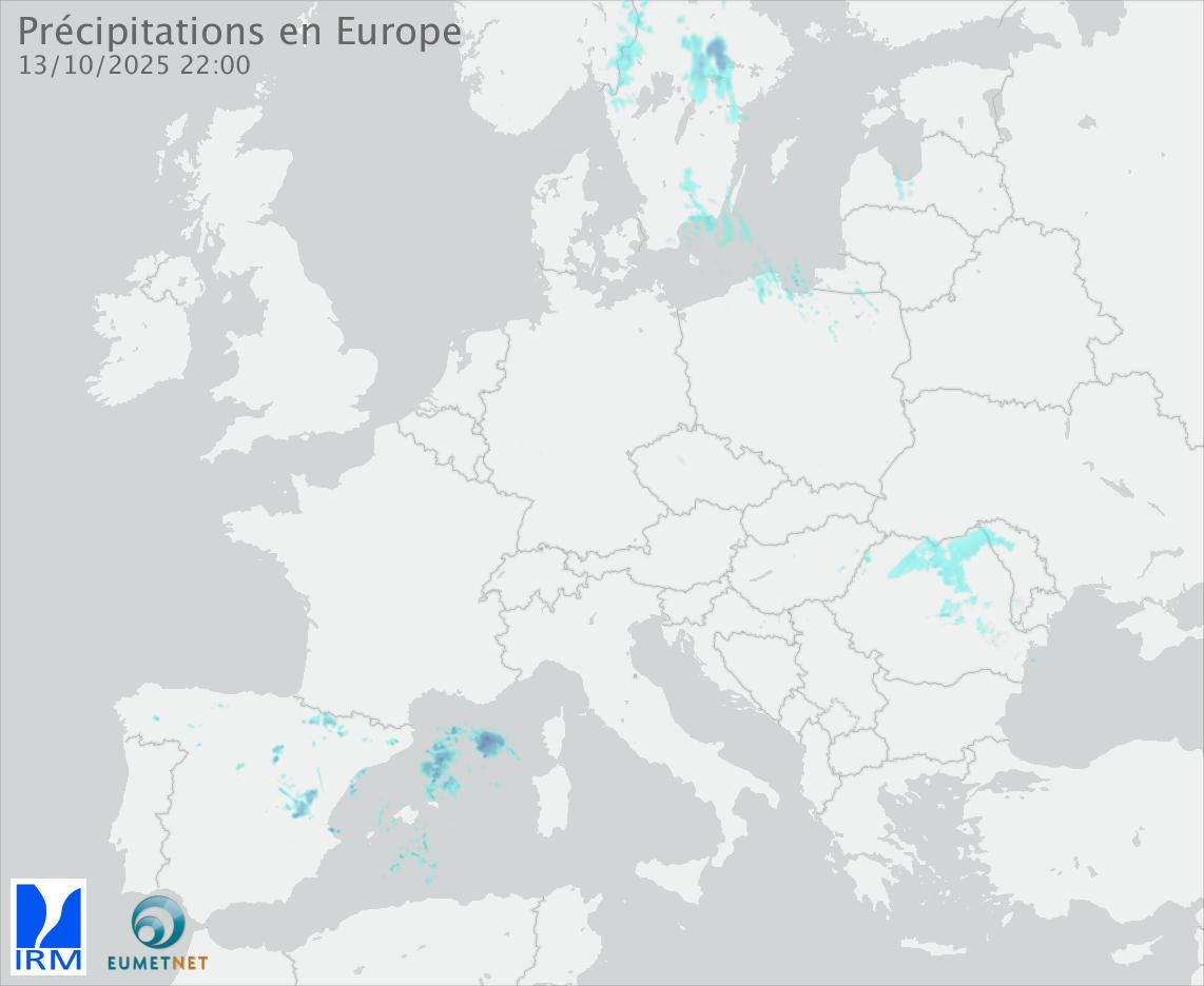 Cette animation montre les précipitations passées et présentes observées par les radars des participants européens au programme OPERA d'Eumetnet, par pas de 15 minutes.