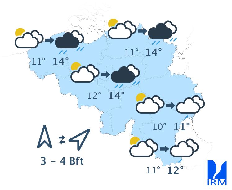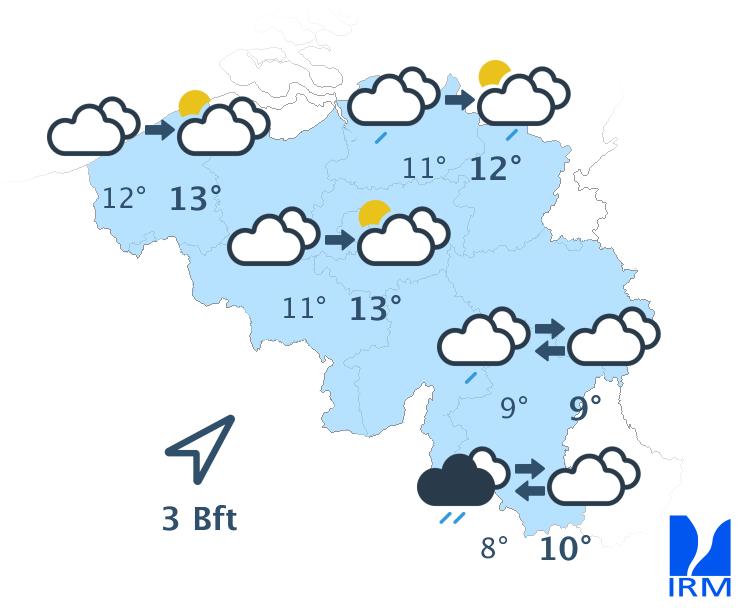 Mercredi matin, il fera très nuageux et la zone de pluie (faible) arrivée la nuit précédente traînera sur la moitié sud-est du pays. Elle quittera assez vite notre territoire en direction de l'Allemagne, suivie par un temps plus changeant avec des éclaircies et des champs nuageux éventuellement accompagnés d'une averse. L'Ardenne et la Lorraine Belge conserveront un ciel couvert. Les maxima se situeront entre 9 et 13 degrés, Le vent sera modéré, en bord de mer parfois assez fort, de sud-ouest.