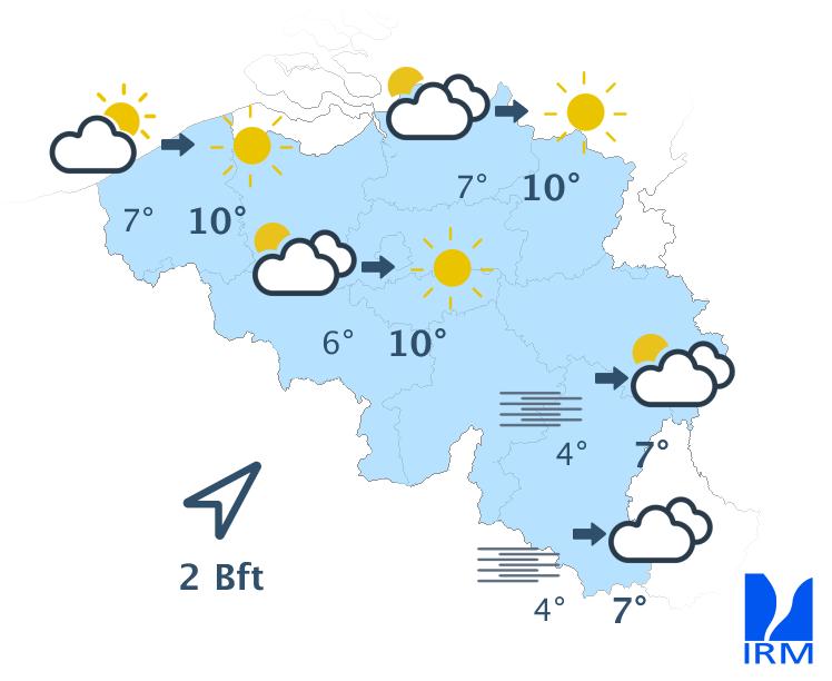 Samedi, après la dissipation de la grisaille matinale, le soleil dominera. En Ardenne et en Lorraine Belge, des éclaircies alterneront avec de nombreux passages nuageux. Le temps sera sec. Les maxima varieront entre 6 et 11 degrés. Le vent sera faible, à parfois modéré en bord de mer, de secteur sud-ouest ou sans direction précise dans le sud-est du pays.