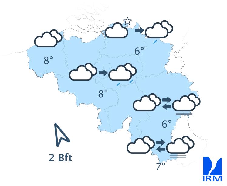 Vendredi, le ciel sera d'abord très nuageux avec quelques faibles pluies résiduelles (qui nous quitteront vers les Pays-Bas), et un risque de brouillard en Ardenne et en Lorraine belge. Au fil des heures, quelques éclaircies apparaîtront sur certaines régions. Les maxima seront compris entre 8 et 12 degrés sous un vent faible à modéré puis souvent faible d'un large secteur sud.
