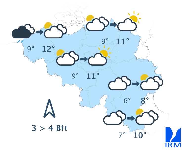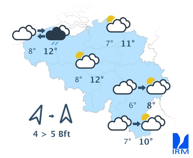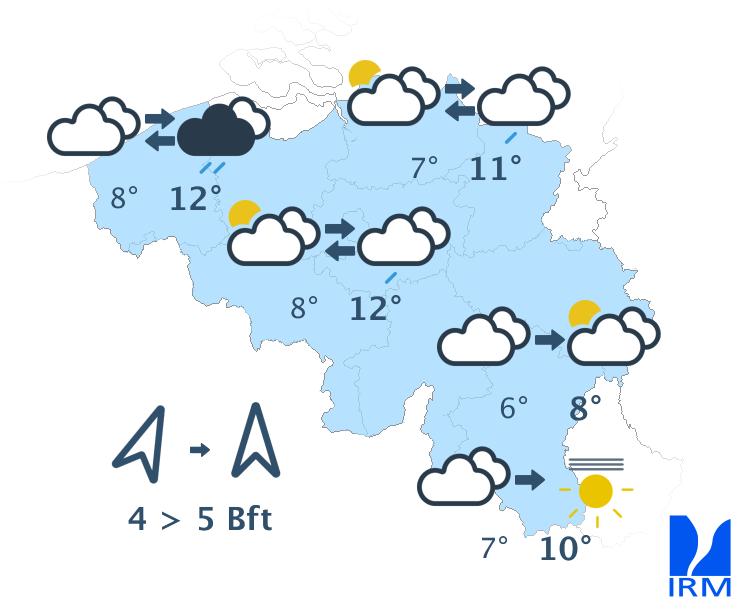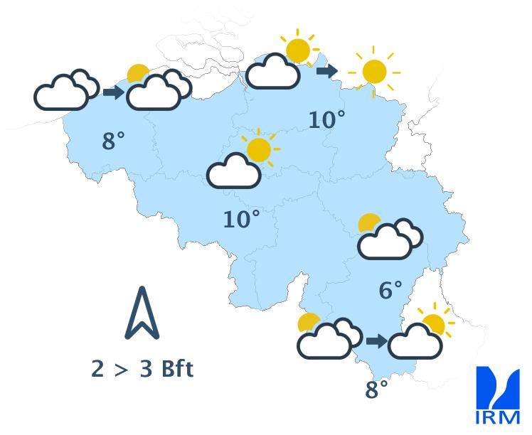 Cet après-midi, le temps sera sec avec des éclaircies, d'abord dans une zone qui part de la province de Hainaut en direction de la Campine et de l'ouest de la province de Liège. Au fil des heures, la couverture de nuages bas disparaîtra totalement des autres régions, excepté en Ardenne et sur l'extrême ouest du pays. Dans le même temps, des champs nuageux de haute et de moyenne altitude envahiront la Belgique depuis la France. Sur le relief, de mauvaises visibilités pourront persister. Les maxima se situeront entre 5 degrés en Hautes Fagnes et 9 ou 10 degrés en Basse et Moyenne Belgique, sous un vent généralement modéré de sud.