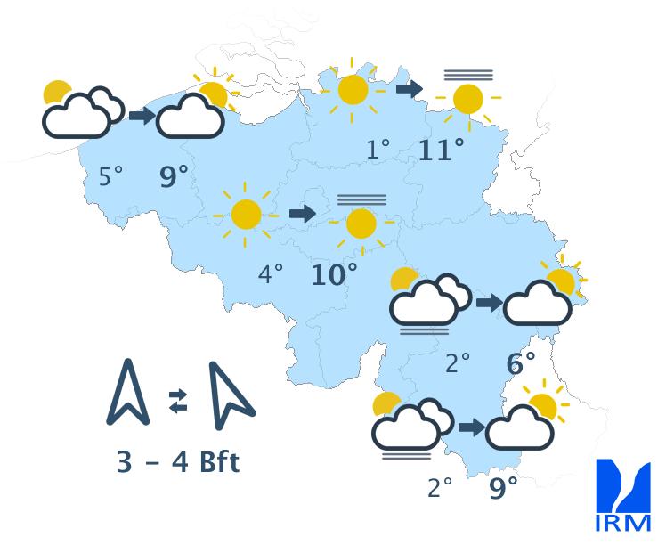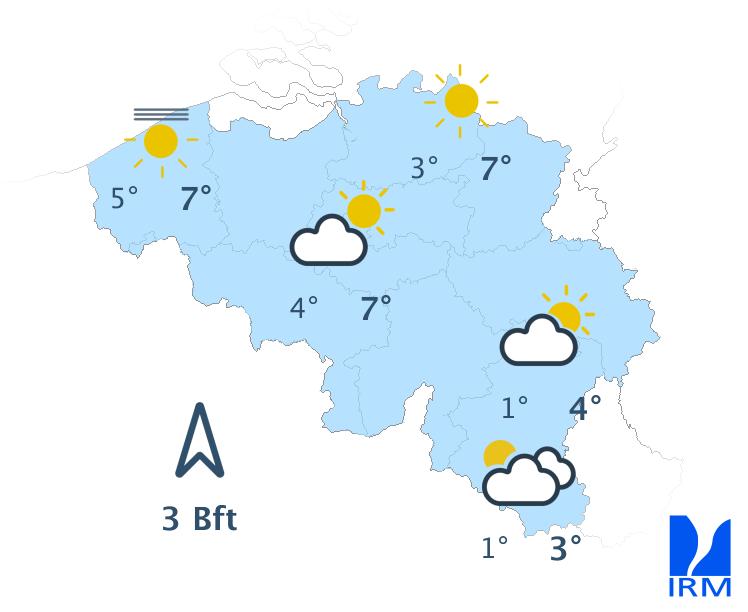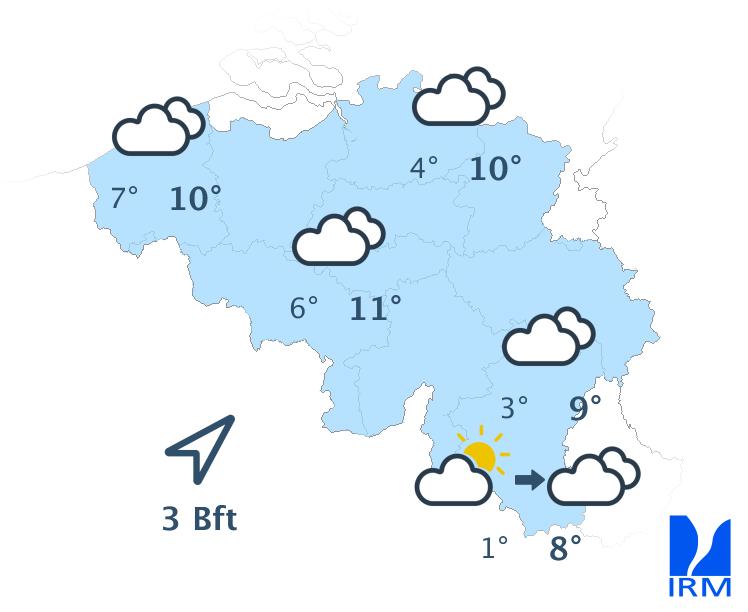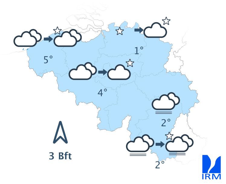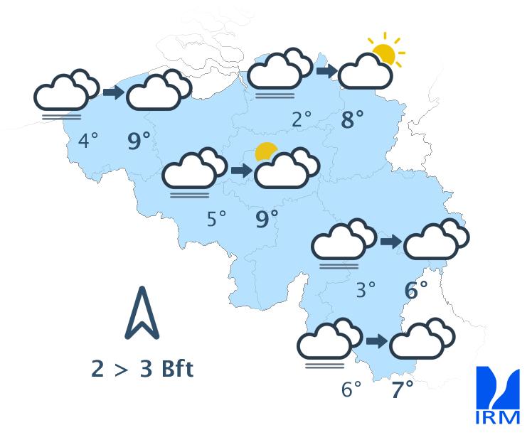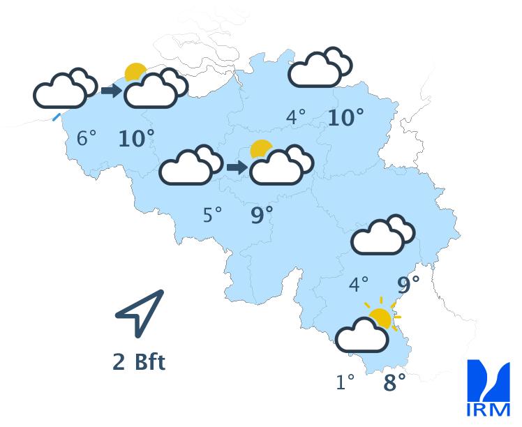 Aujourd'hui, le ciel sera d'abord gris, avec un risque de mauvaise visibilité sur le relief et quelques faibles bruines. À partir de midi, de larges éclaircies apparaîtront à la côte. Ces éclaircies progresseront ensuite vers l’intérieur des terres pour atteindre le centre du pays dans le courant de l’après-midi. Dans l’est et le sud du pays, le temps restera probablement gris. Les maxima varieront de 6 degrés en Haute Belgique à 11 degrés à la côte. Le vent sera généralement faible de direction variable.