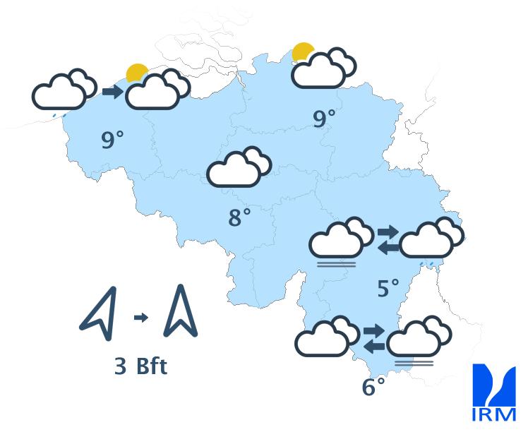 Mardi, le temps deviendra partiellement nuageux avec, dans l’après-midi, un risque d’une averse locale. Dans la plupart des régions, le temps restera sec. Les températures seront encore un peu plus douces avec des maxima entre 8 et 12 degrés. Le vent faiblira à nouveau pour devenir faible à modéré de secteur sud.