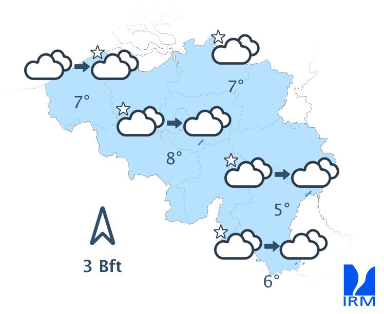 Ce soir et cette nuit, le ciel sera partagé entre éclaircies et nombreux champs nuageux. Ces derniers pourront par endroits s'accompagner d'un peu de pluie. Les températures évolueront peu avec des minima de 4 à 9 degrés et un vent modéré de sud. En Lorraine belge, le vent deviendra faible de sud-est.