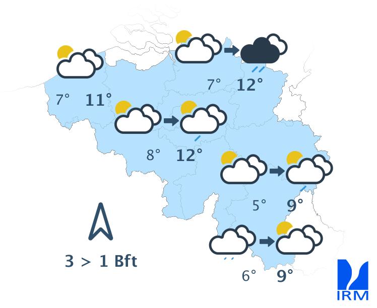Mardi, sous une nébulosité variable, le temps sera d'abord sec excepté sur le flanc sud des Ardennes où quelques pluies pourront encore se manifester. L'après-midi, des averses un peu plus marquées mais localisées pourront se développer. Les maxima, doux pour la saison, oscilleront entre 9 et 13 degrés. Le vent sera faible à modéré de sud à sud-est.