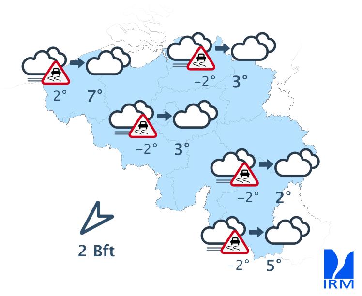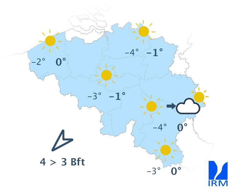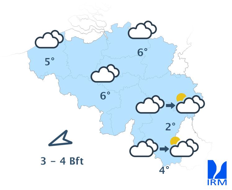 Ce soir, le ciel restera très nuageux. Cette nuit, des éclaircies un peu plus nombreuses pourront apparaître, principalement dans la moitié nord du pays. Les minima seront compris entre 0 et -4 degrés dans les Ardennes, entre -1 et +1 degré dans le centre et autour de +2 degrés dans l'ouest. Le vent sera modéré et à la mer parfois assez fort de nord-est.