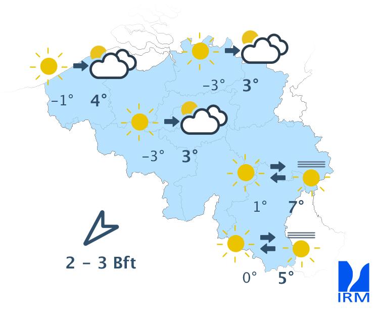 Samedi, le temps sera d'abord très ensoleillé avec quelques voiles d'altitude depuis le nord-est. Ensuite, des nuages bas envahiront nord du pays l'après-midi et progresseront vers le centre en fin d'après-midi. Au sud du sillon Sambre-et-Meuse, le temps restera ensoleillé toute la journée. Les maxima s'échelonneront entre 2 ou 3 degrés sur le centre, 4 degrés à la mer et 6 ou 7 degrés sur les hauteurs de l'Ardenne. Le vent sera faible à modéré de nord-est.