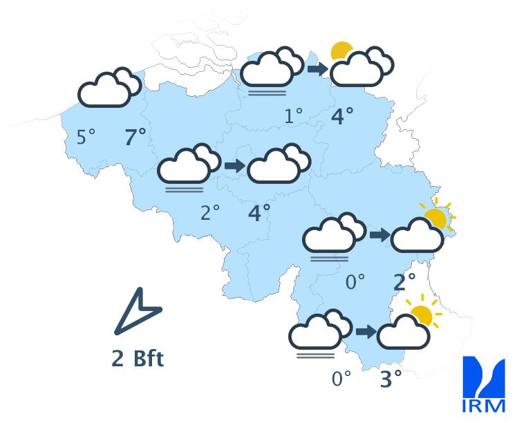 Mardi, la journée débutera à nouveau sous la grisaille avec du brouillard par endroits. L’après-midi, des éclaircies assez larges devraient ensuite se développer au sud du sillon Sambre-et-Meuse alors que la nébulosité restera plus abondante en Basse et en Moyenne Belgique. Les maxima s’échelonneront entre 1 et 6 degrés. Le vent sera faible à modéré de nord à nord-est.