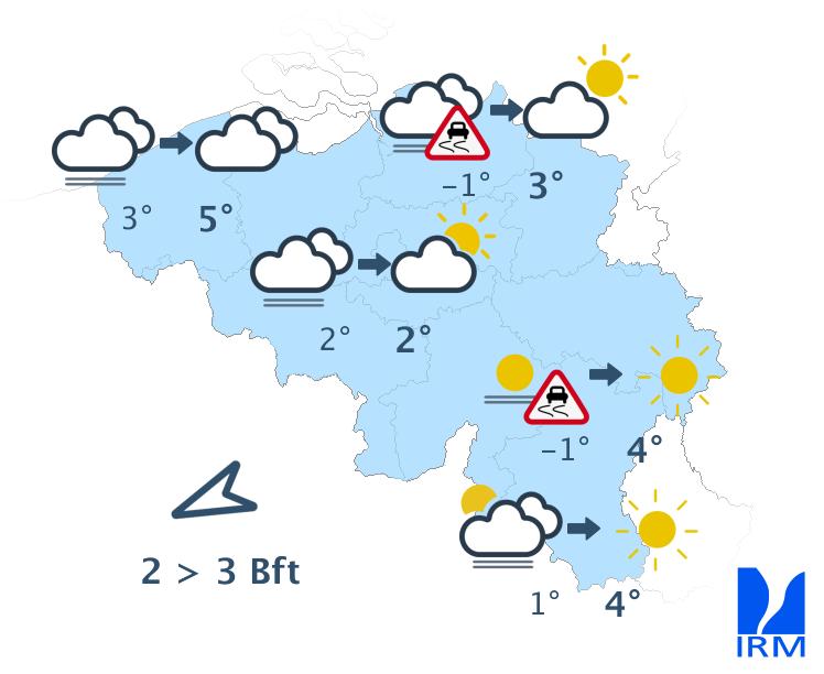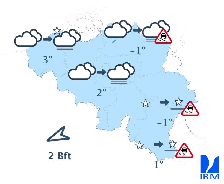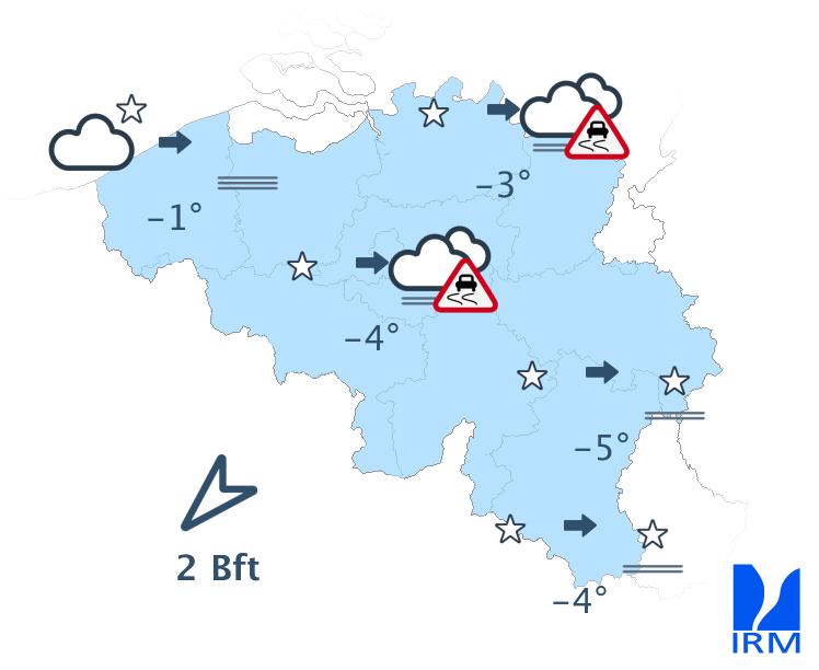Ce soir, le ciel sera dégagé sur la plupart des régions et les températures chuteront rapidement sous la barre du 0 degré. Le temps deviendra ensuite brumeux dans le fond des vallées ainsi que les plaines de l'ouest et du nord du pays. Du brouillard devrait ensuite se former sur une grande partie de la Flandre et pourrait s'étendre au nord de la Wallonie en fin de nuit; il pourrait donner lieu à des plaques de givre et être localement accompagné d'un peu de bruine ou de neige en grain. Les minima seront compris entre -6 ou -7 degrés dans certaines vallées de l'Ardenne et -1 ou -2 degrés au littoral, sous un vent de nord-est faible, à parfois modéré à la côte et sur les hauteurs de l'Est.