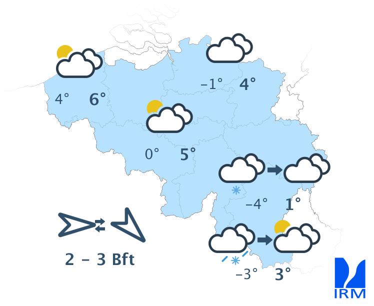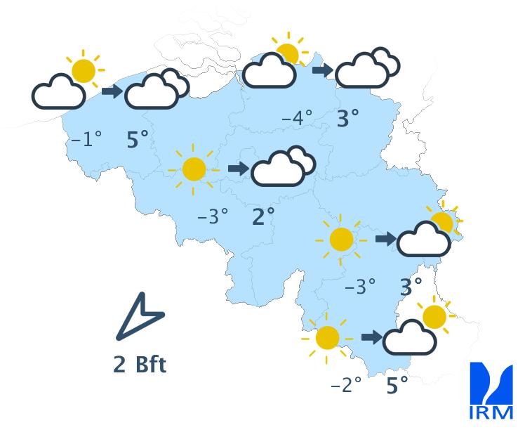 Les conditions déjà ensoleillées sur l'est du pays en mi-journée gagneront progressivement du terrain et s'étendront aux régions du centre cet après-midi. Sur l'ouest du territoire, les nuages bas seront plus tenaces mais devraient graduellement se morceler au fil des heures pour finalement se dissiper en fin de journée. Les maxima se situeront entre 2 ou 3 degrés dans certaines vallées de l'Ardenne et 5 ou 6 degrés à la côte, sous un vent d'est à nord-est faible à modéré.