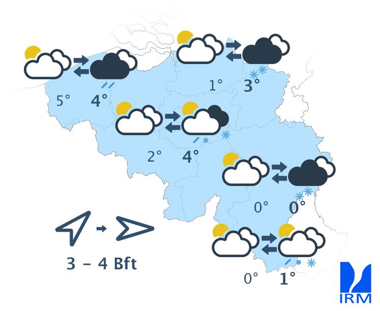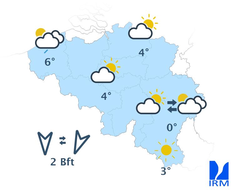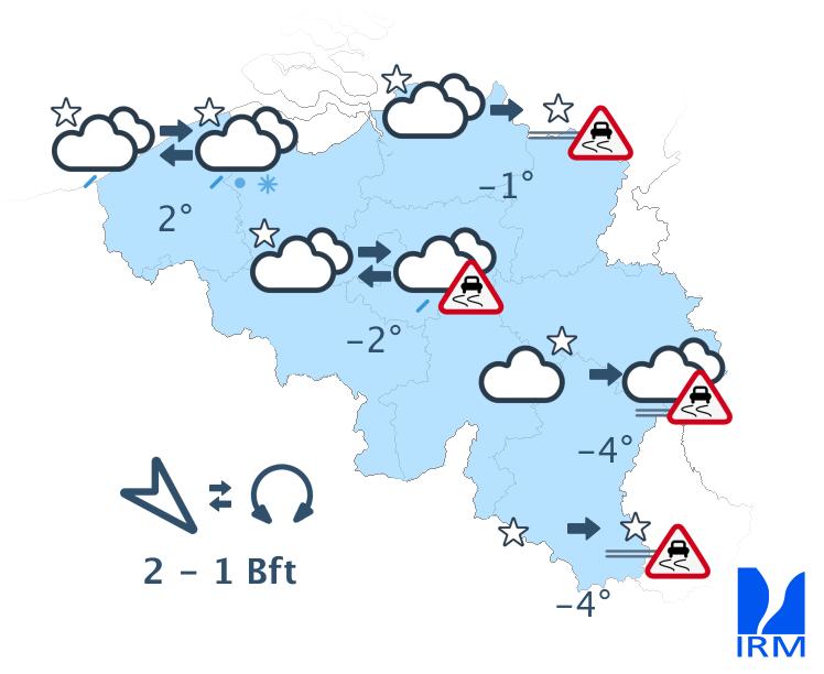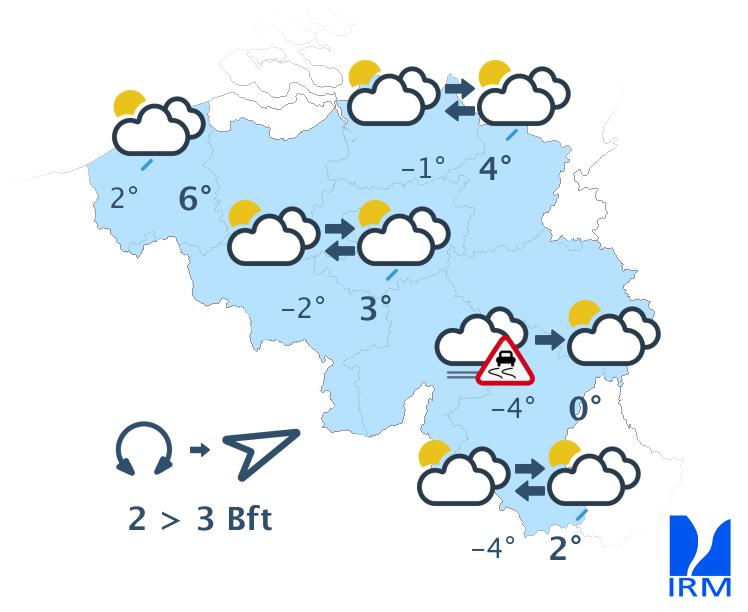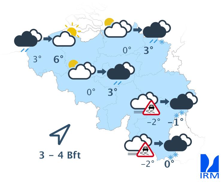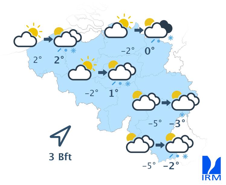 Mercredi matin, les conditions seront encore glissantes par endroits et, surtout en haute Belgique, la visibilité sera parfois mauvaise. Des champs nuageux alterneront avec quelques éclaircies et on prévoit toujours un risque de quelques gouttes et, en Hautes-Fagnes, de quelques flocons. En cours d'après-midi, les éclaircies s'élargiront sur le nord-ouest du territoire. Les maxima seront compris entre -1 degré dans les cantons de l'Est et +6 degrés à la côte. Le vent sera faible à modéré de secteur ouest. Au littoral, il sera plutôt modéré de nord-ouest.