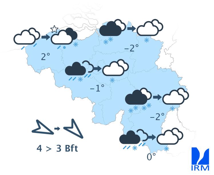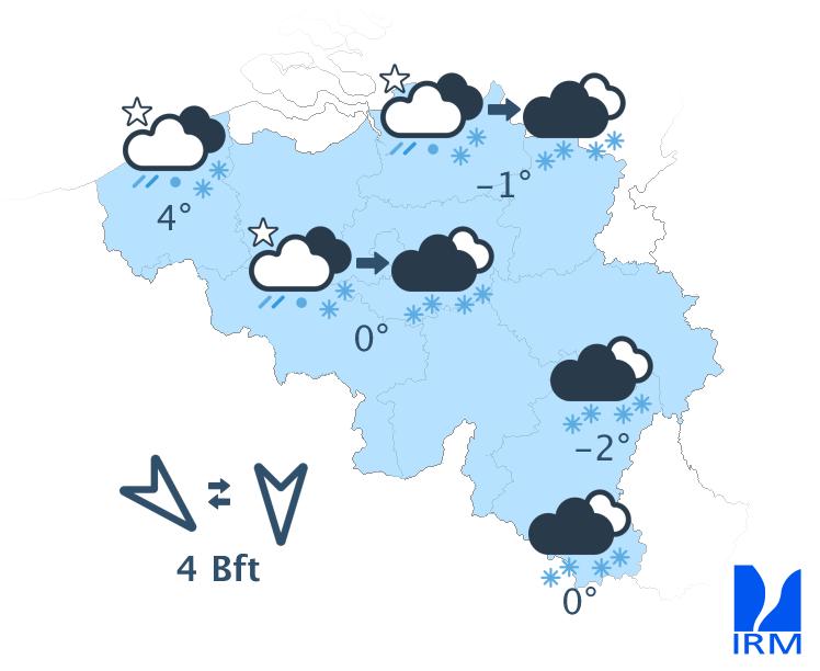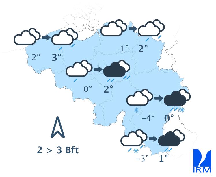 Vendredi soir et durant la nuit de vendredi à samedi, le ciel restera très nuageux à couvert avec des précipitations, parfois encore abondantes, surtout dans le sud et l'est du pays. Il s'agira de chutes de neige au sud du sillon Sambre et Meuse. Du centre à l'est, les précipitations adopteront aussi progressivement un caractère hivernal avec de la neige (fondante) jusqu'en Basse Belgique. Dans l'ouest, les précipitations resteront sous forme de pluie. Les minima seront de -2 degrés en Ardenne, autour de 0 ou +1 degré sur le centre, de +2 ou +3 dans l'ouest et jusqu'à +4 degrés à la mer. Le vent sera partout modéré, assez fort à la mer, d'ouest à nord-ouest.
