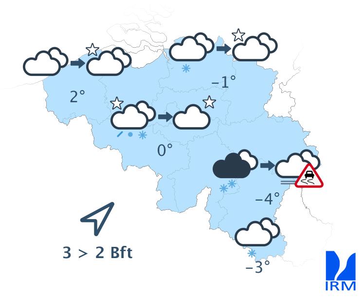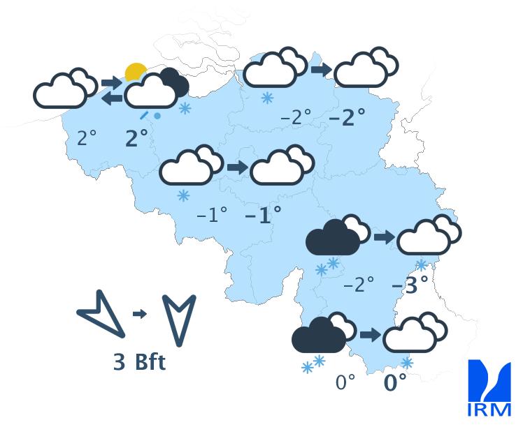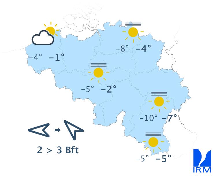 Dimanche, le temps restera sec avec d'abord beaucoup de nuages le long de la frontière française et du soleil dans les autres régions. L'après-midi, le soleil pourrait gagner le sud du pays, mais des nuages élevés viendront parfois masqué un peu le soleil. Après une nuit très froide, le gel perdurera toute la journée sur l’ensemble des régions avec des maxima oscillant entre -6 ou -7 degrés dans les Hautes Fagnes et -1 ou -2 degré à la côte. Le vent sera d'abord généralement faible d'est, devenant ensuite modéré de sud-est.