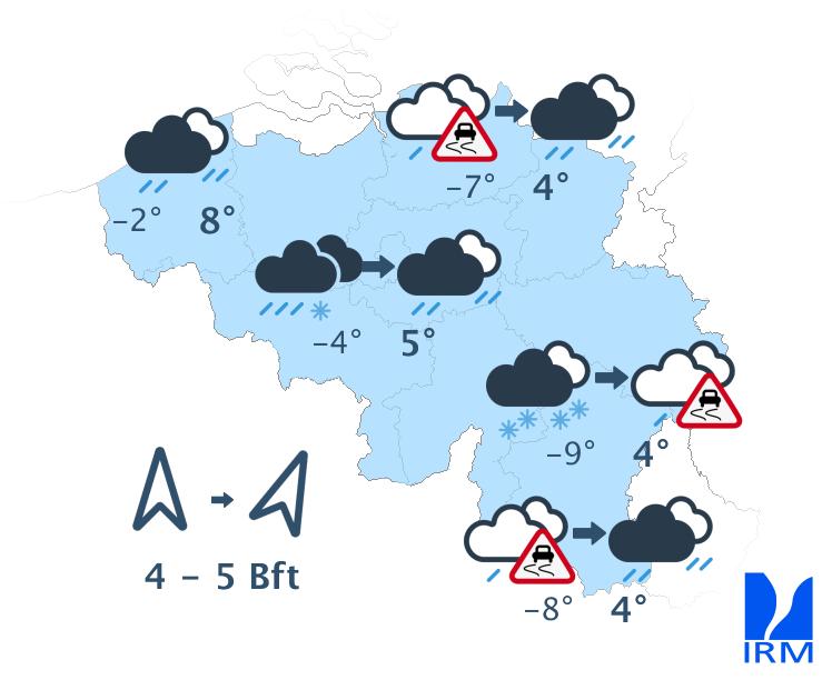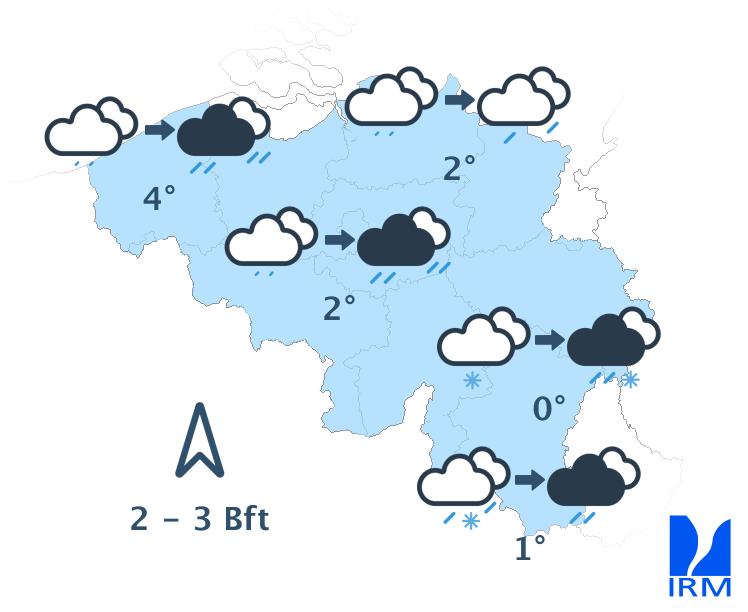 Ce soir et en première partie de nuit, le temps sera très nuageux à couvert avec d'intenses périodes de pluie. En Haute Ardenne, nous attendons d'abord temporairement un peu de neige ou de neige fondante, mais la pluie prendra là aussi rapidement le relais. Après minuit, le temps deviendra temporairement plus sec avec quelques éclaircies, mais le risque d'averses augmentera ensuite à nouveau rapidement depuis la France. Le vent modéré de sud à sud-est se renforcera pour devenir assez fort à fort dans les terres et fort à la mer, en s'orientant au sud-ouest. Les rafales atteindront 70 à 90 km/h (voire localement plus). Dans le nord du pays, les rafales devraient être moins intenses. Les minima atteindront en soirée 0 à 4 degrés, mais les températures se radouciront en cours de nuit (avec jusqu'à 8 degrés en plaine).