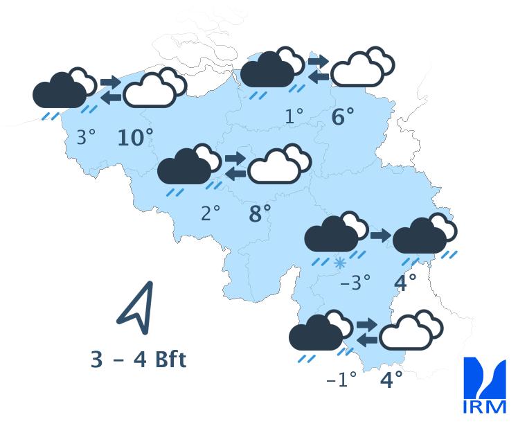 Mercredi, une zone de précipitations affaiblie traversera notre pays. Elle sera suivie d'un temps plus sec avec des éclaircies. Quelques averses isolées resteront possibles. Les maxima varieront entre 3 et 10 degrés avec un vent modéré de sud à sud-ouest.