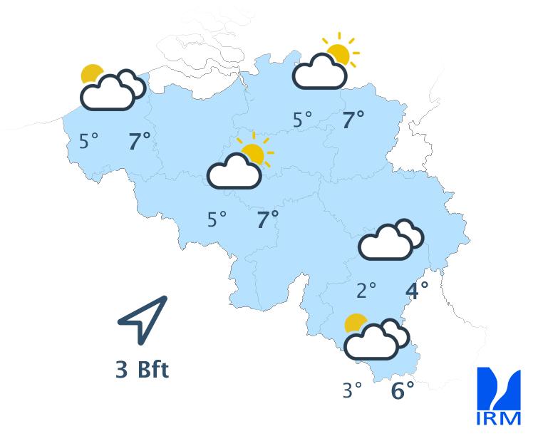 Mardi, la journée débutera sous les nuages avec encore un peu de pluie ou de bruine. Le temps redeviendra ensuite plus sec avec de belles éclaircies. Les maxima varieront entre 3 et 10 degrés avec un vent modéré de sud.
